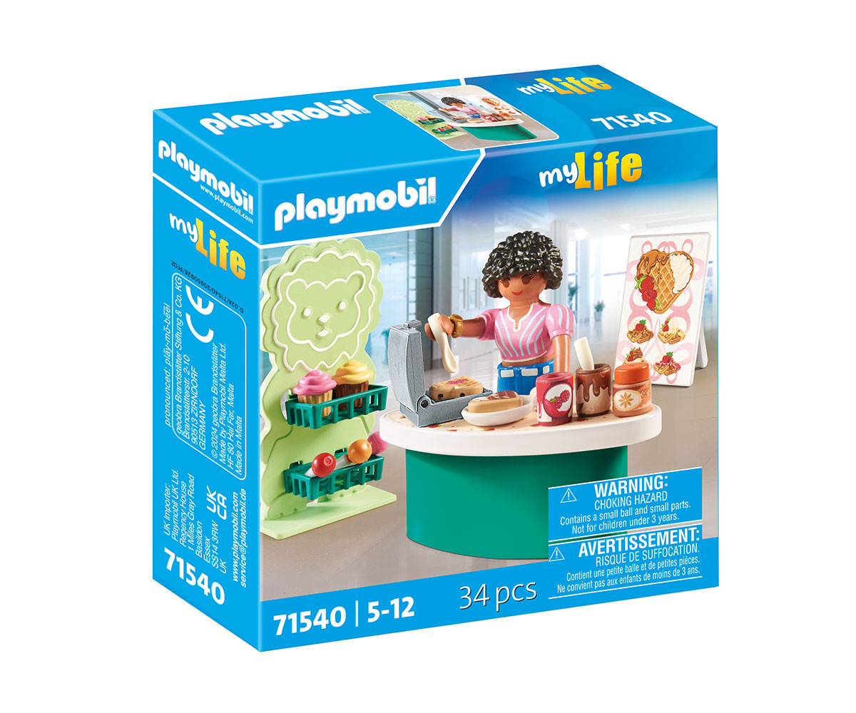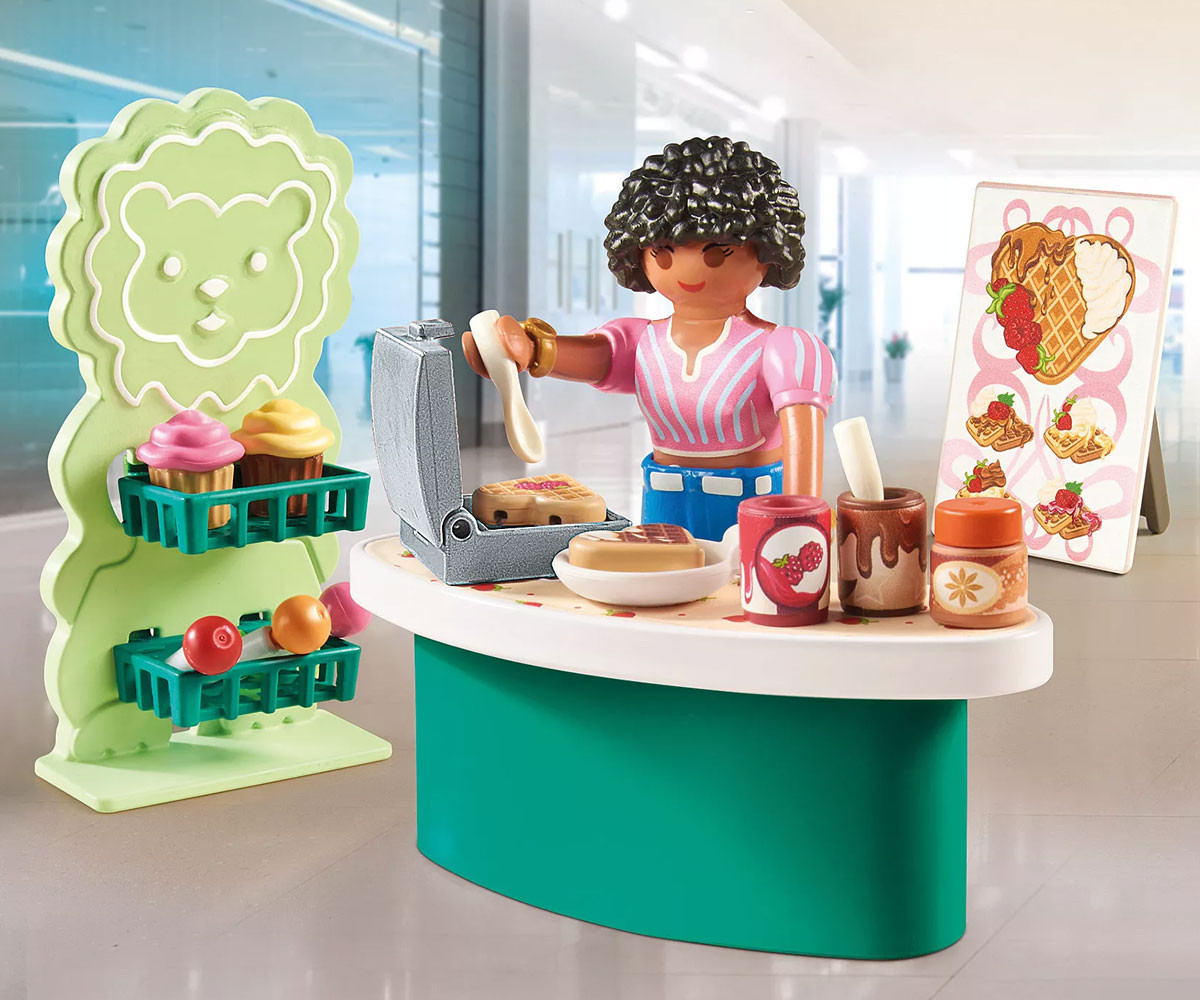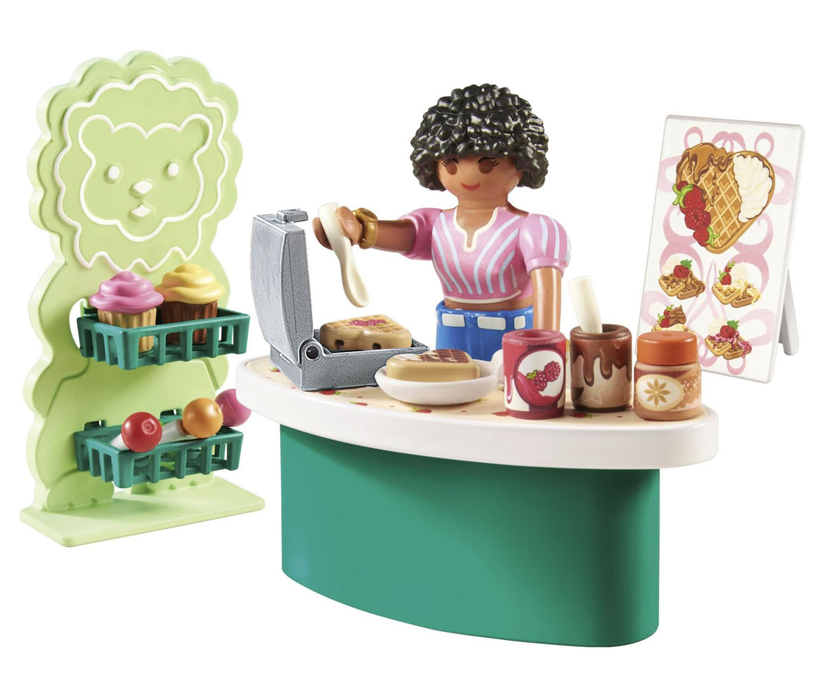 В сладкарницата на PLAYMOBIL можеш да усетиш прекрасния аромат на пресни вафли. С пудра захар, ябълково пюре, шоколадова паста или просто натурални, какво ще избереш? И други сладки изкушения като мъфини и бонбони правят избора още по-труден. Бонбоните правят живота по-сладък! PLAYMOBIL Сладкарницата привлича малки и големи с пресни вафли, мъфини и бонбони. Независимо дали ще избереш пудра захар, ябълково пюре или шоколадов крем, тези вафли са много вкусни! След такава вкусна изненада пазаруването става още по-забавно. Страхотен подарък или сувенир за сладки деца на възраст от 5 години нагоре.