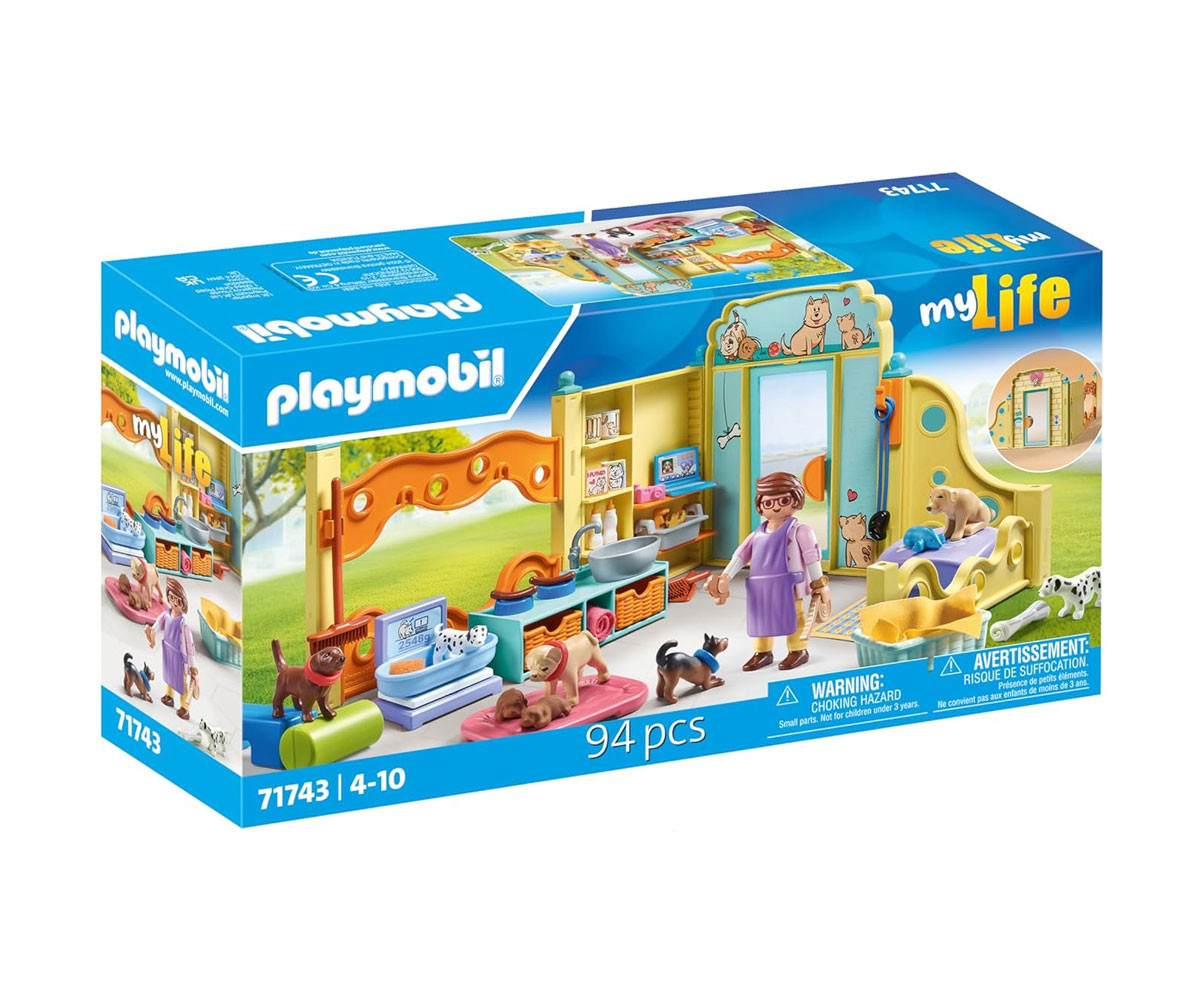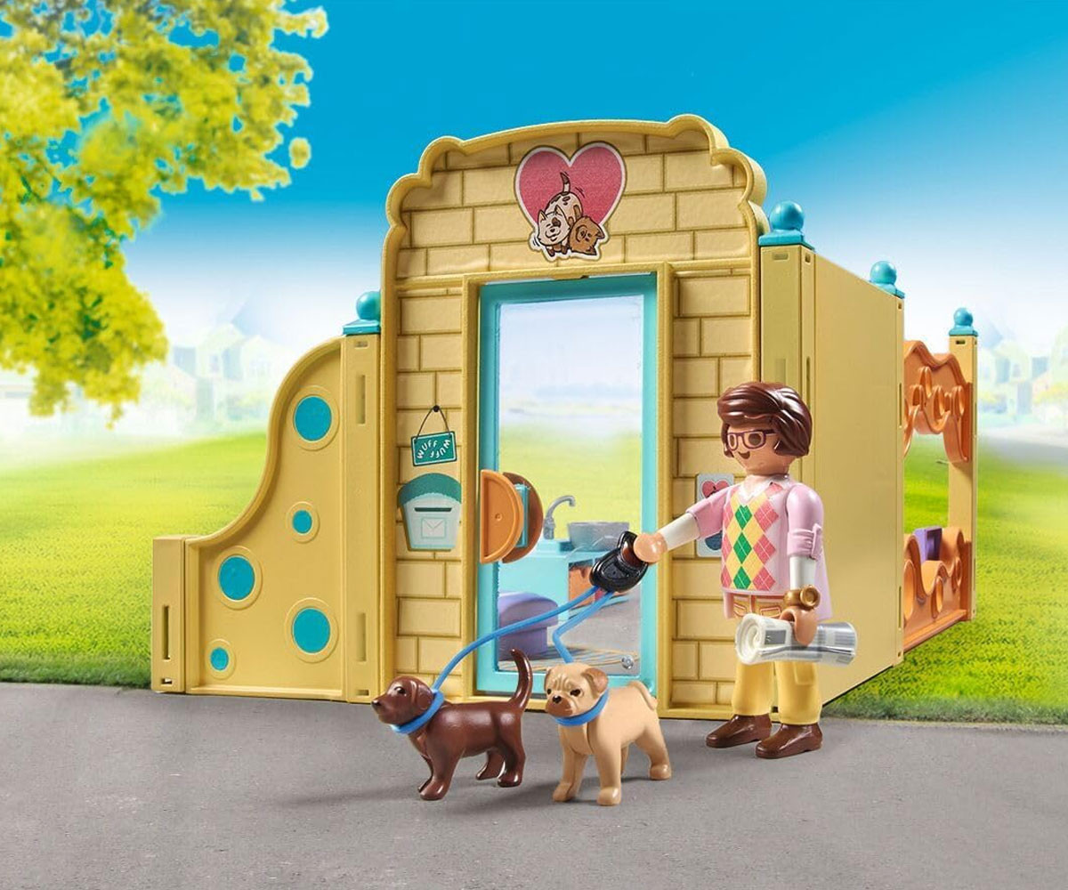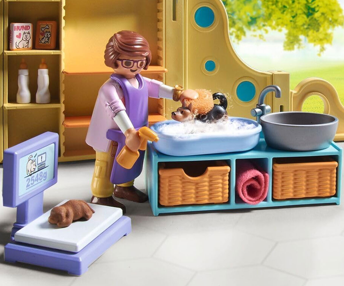 В новия дом за кученца малките палета получават грижовно внимание. Тук те могат игриво да изследват средата си и да се забавляват с другите кученца. Добре дошли в новия дом за кученца, където всяко пале се развива под грижливо наблюдение. В центъра за дневна грижа за домашни любимци на PLAYMOBIL храненето, къпането и играта протичат с лекота. Уютни легълца, станция за миене и забавни аксесоари осигуряват щастието на всяко кученце. Включеният двоен повод обещава весели разходки, а кошовете и рафтовете поддържат всичко подредено. Комбинирайте с PLAYMOBIL Хотел за животни (можете да го закупите тук), за да разширите забавлението и да предложите на младите любители на кучета безброй възможности да се грижат за своите любимци.