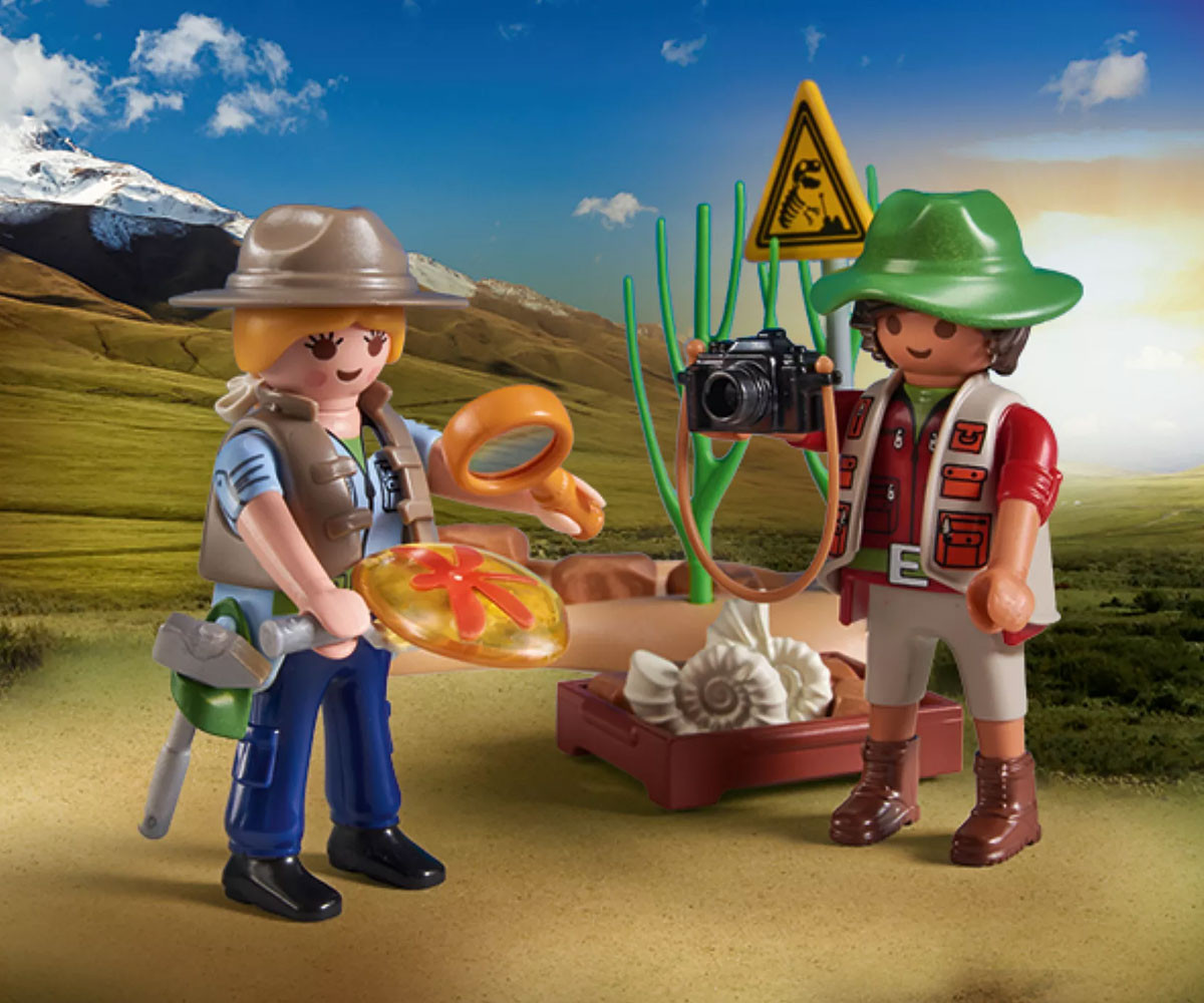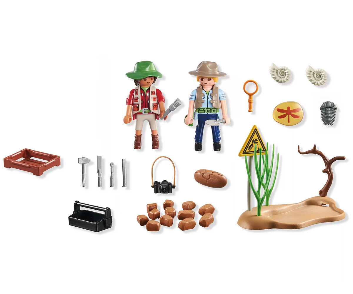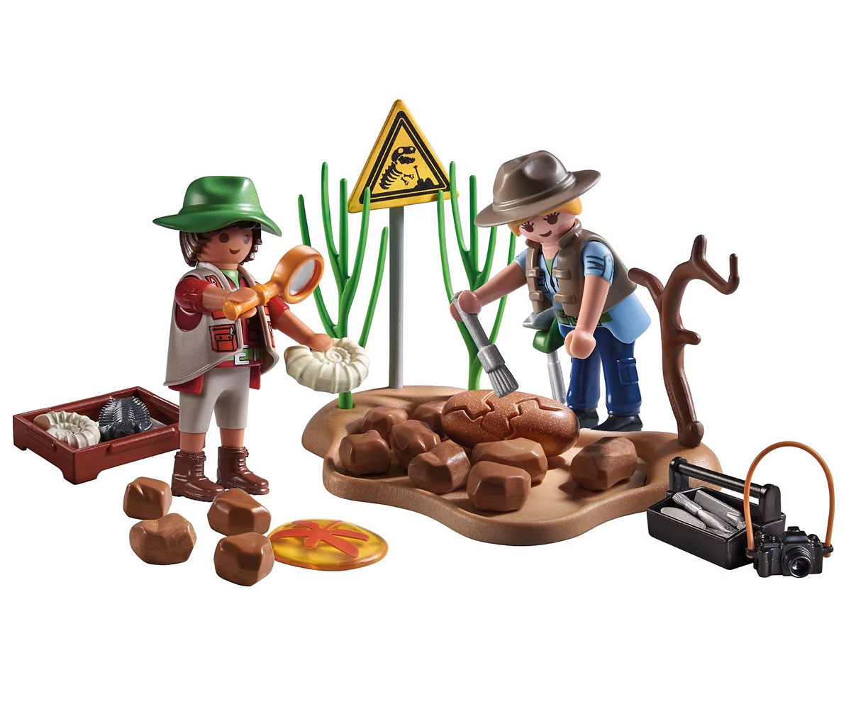 Колко вълнуващо – двамата палеонтолози са открили фосили! Те веднага започват да ги анализират и снимат. Може би този път са направили наистина голямо откритие! Колко вълнуващо! Двамата палеонтолози разкриват загадъчни фосили по време на последните си разкопки. Те с ентусиазъм и прецизност анализират и фотографират находките си. Този завладяващ комплект PLAYMOBIL за разкопки приканва децата да откриват древни тайни, скрити в скалите – включително амонити, трилобити и яйце от динозавър. Използвайте реалистични инструменти като четки, чукове и лупа, за да документирате всяко изключително откритие. Потопете се в това приключение и създайте своя собствена история още днес!