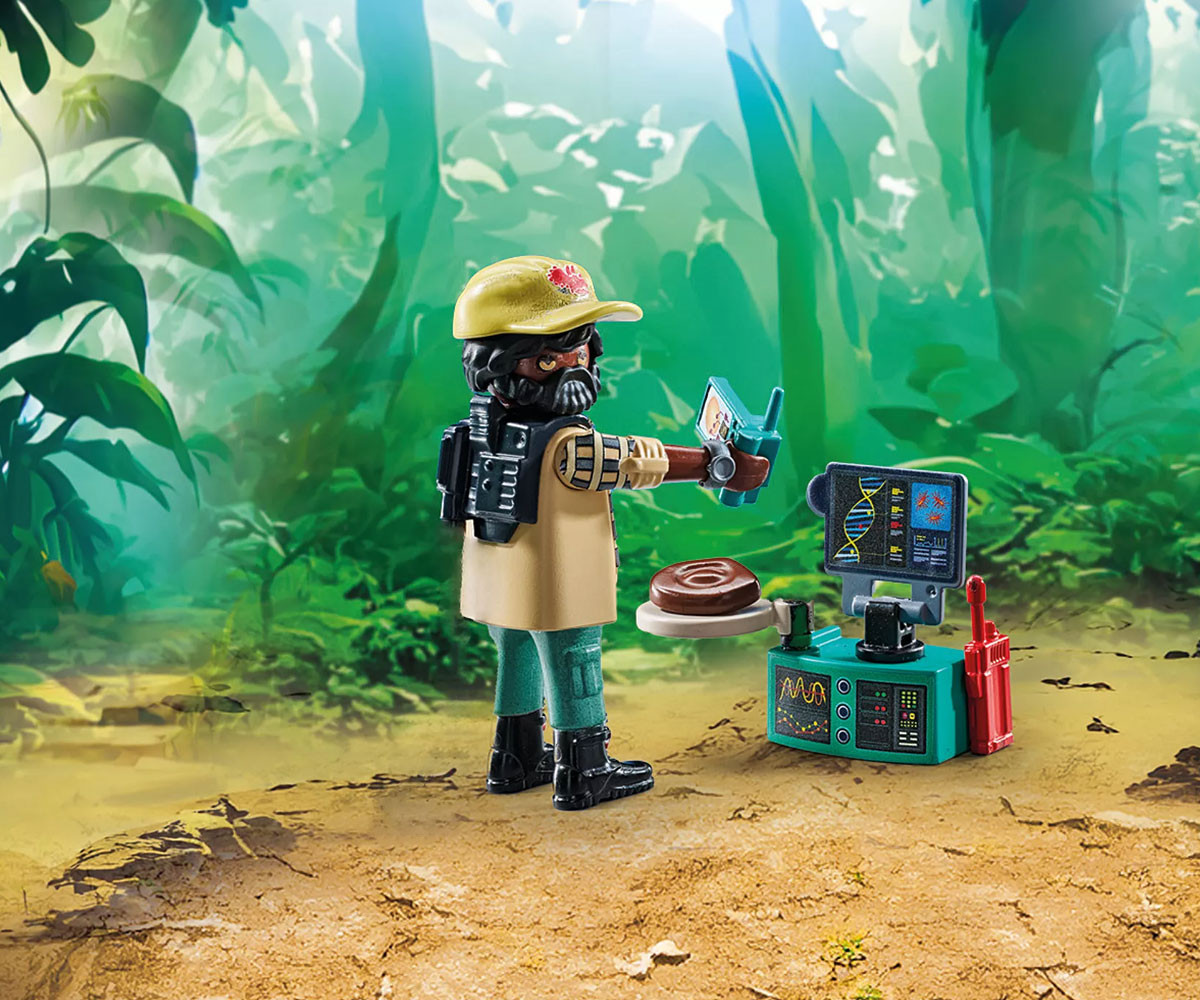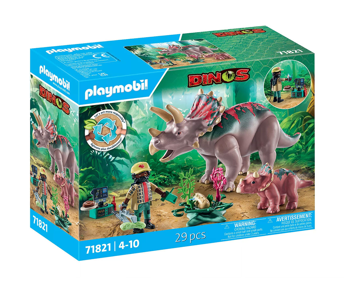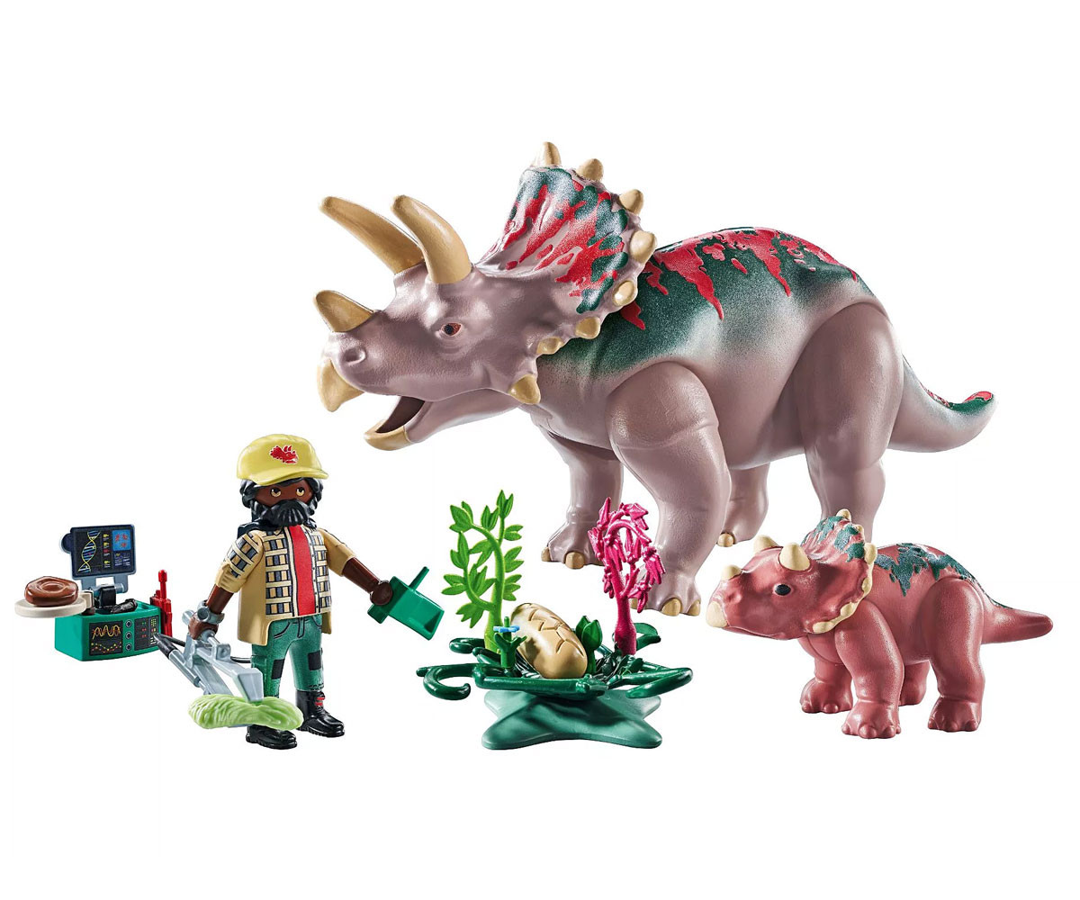 Изследователят на динозаври предприема вълнуващо пътешествие, за да изучава и храни семейството на трицератопсите. Той има рядката възможност да разгледа отблизо яйце на трицератопс. Комплектът включва една фигура, два трицератопса, едно яйце и различни аксесоари. Направете пътешествие назад във времето със семейството на трицератопсите от PLAYMOBIL! Този приключенски комплект ви дава възможност да изследвате завладяващия свят на динозаврите с трицератопс и неговото сладко малко. Използвайте щипките, за да ги нахраните, или наблюдавайте отблизо тяхното поведение. Растенията и забавните аксесоари като яйцето на динозавър и изследователското оборудване предлагат безброй възможности за измисляне на истории. Научете невероятни факти за динозаврите с включената информационна карта.