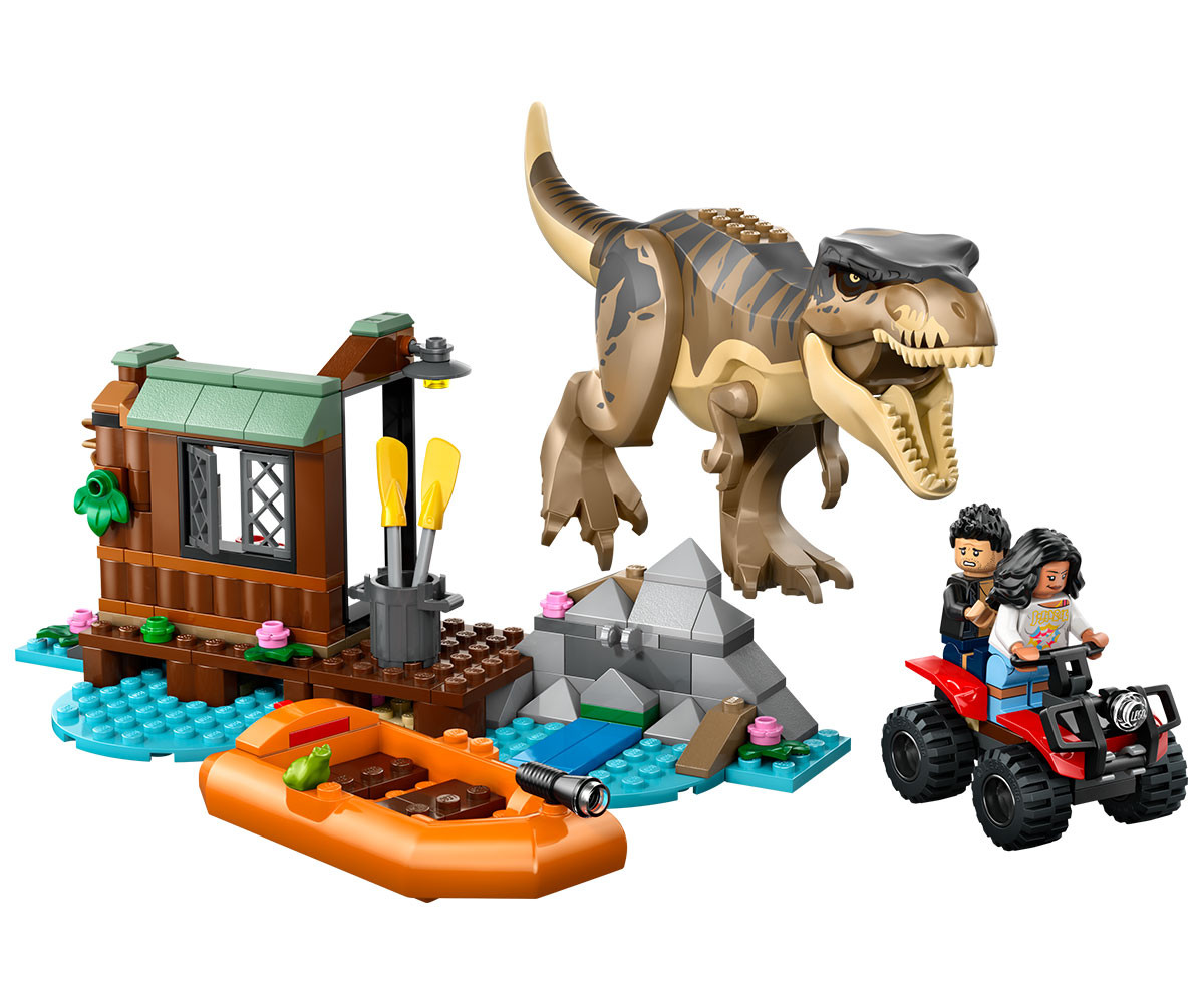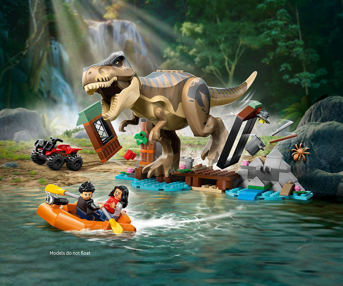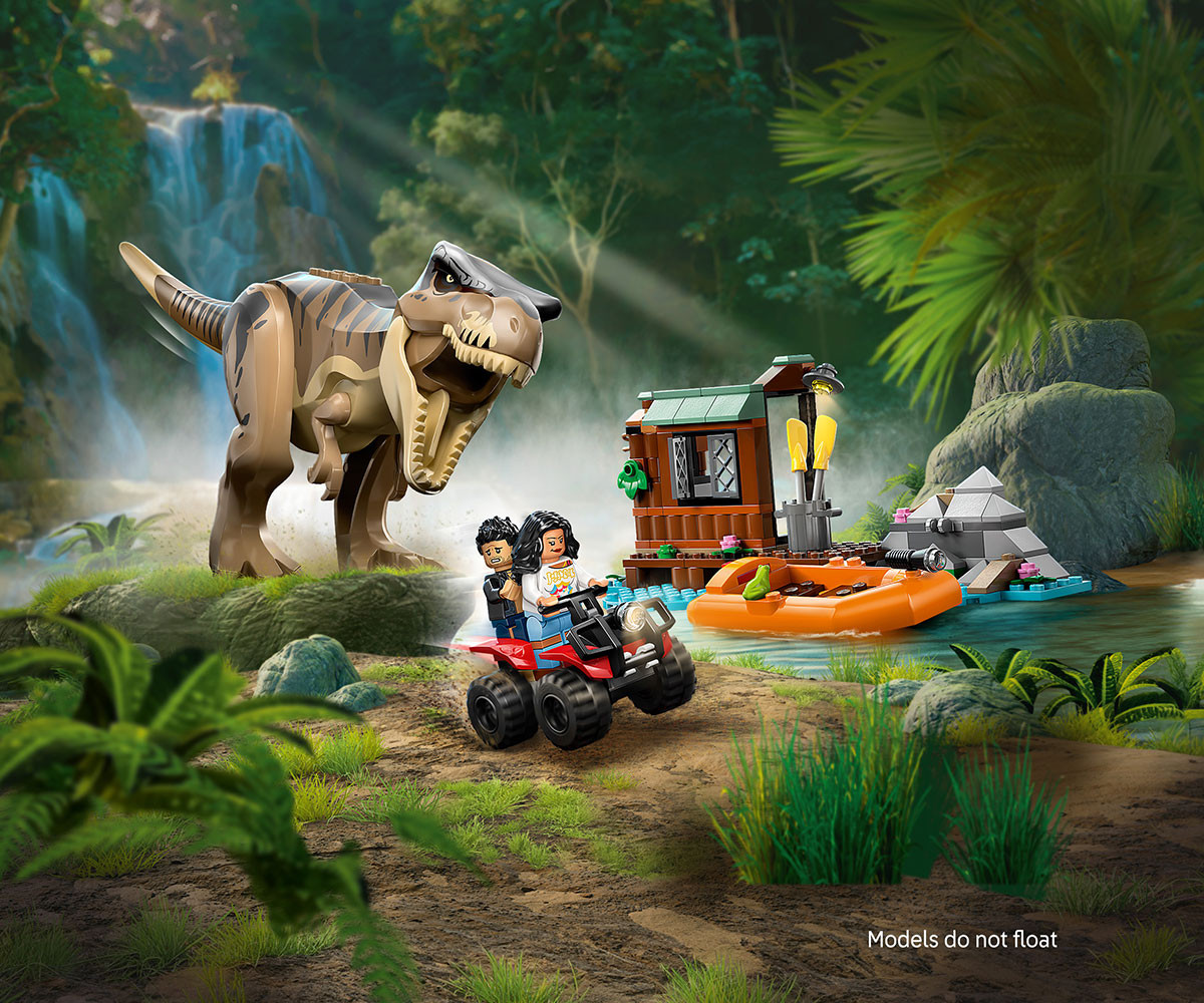 Развълнувайте децата с динозавърски комплект LEGO® Jurassic World с тиранозавър рекс, лодка, ATV, навес за пускане на лодката, 2 минифигури и други.