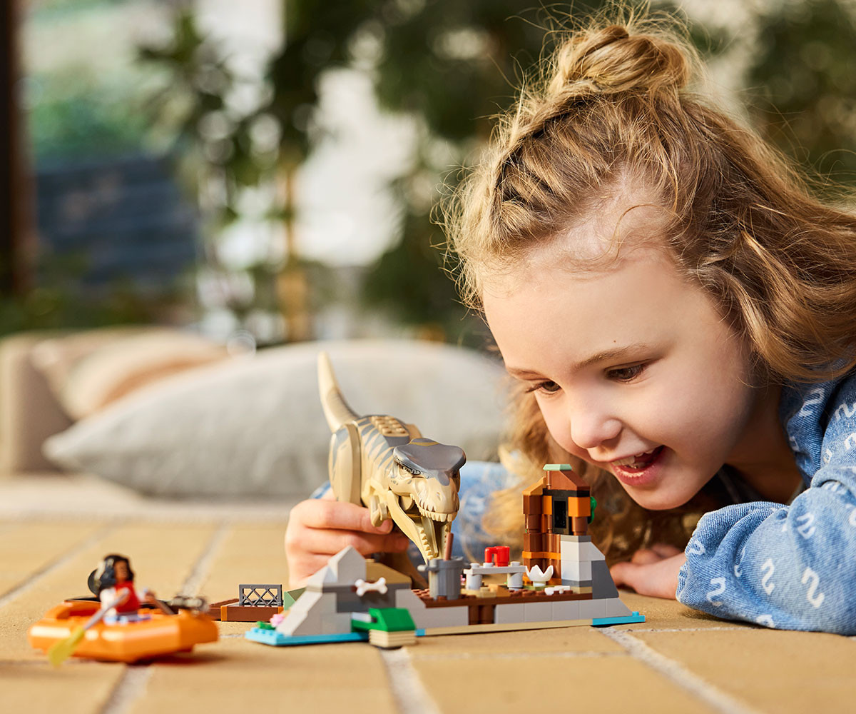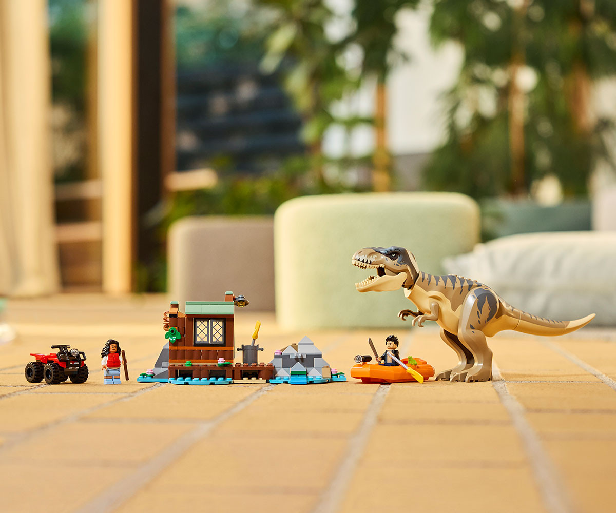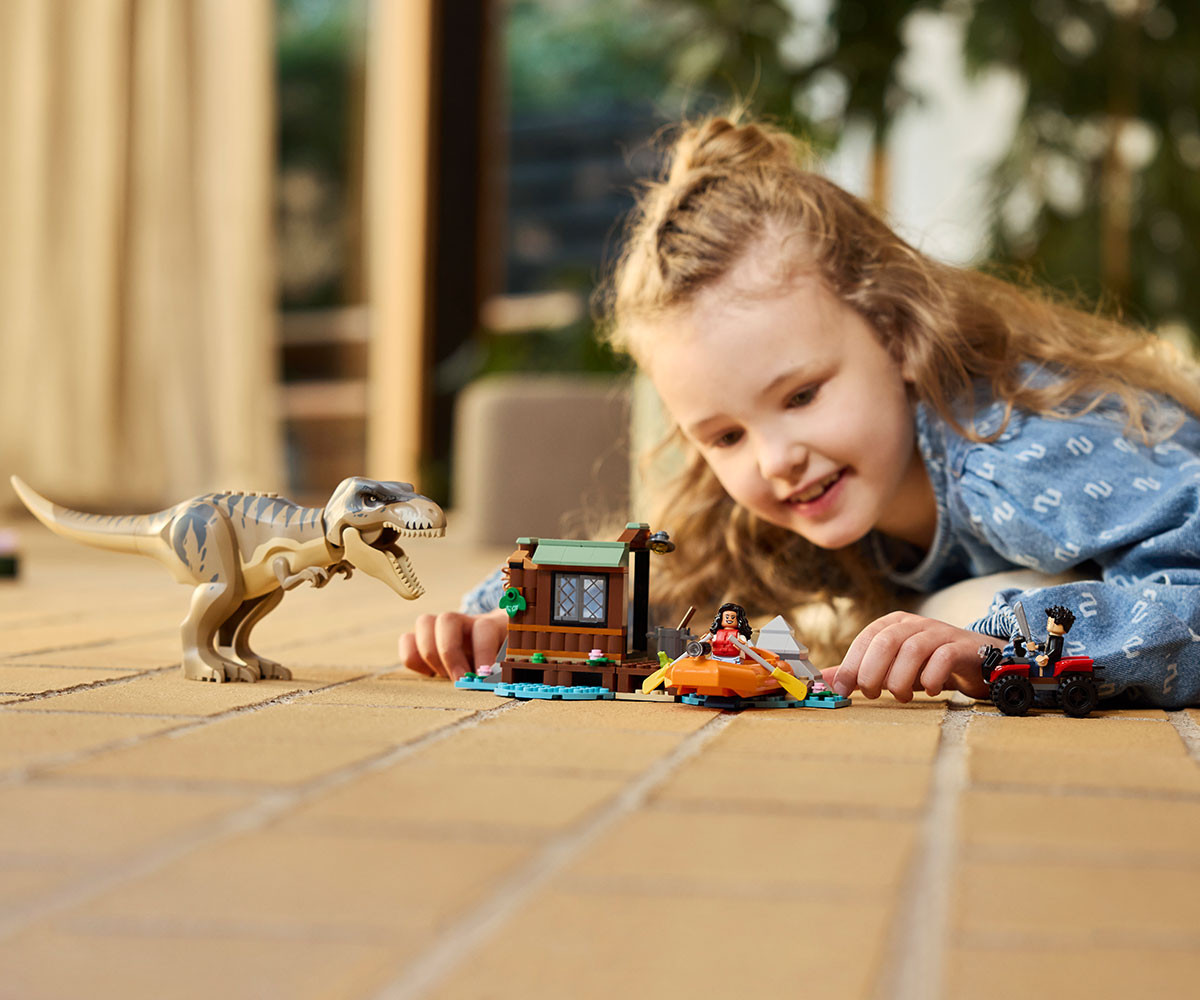 Развълнувайте децата с динозавърски комплект LEGO® Jurassic World с тиранозавър рекс, лодка, ATV, навес за пускане на лодката, 2 минифигури и други.