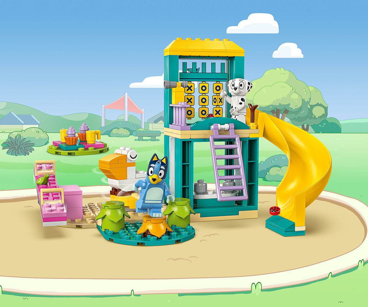 Децата над 4 години се присъединяват към минифигурите на Блуи и Клои за забавления на пързалка, люлка и други играчки на площадката от ТВ сериала Блуи.