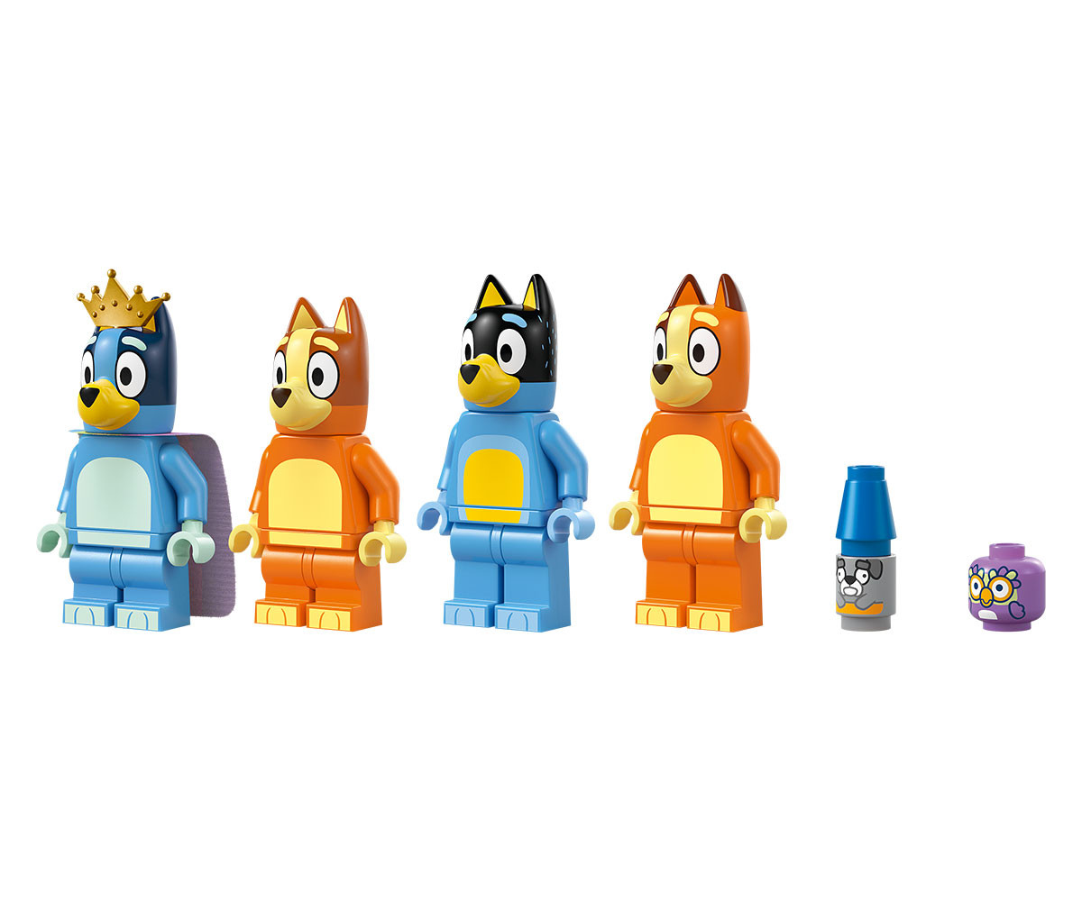 Влезте в емблематичния дом на Блуи! Започнете в стаята за игри с готиния килим-киви и сергия за храна за ролеви игри. На горния етаж е спалнята на Блуи и Бинго, където чака Чатърмакс. Виждате ли трона на кралицата? Има много стаи за разглеждане, включително спалнята на мама и татко и кухнята. В задния двор, под елхата, има закуски, барбекю и балон, с който да играете на „дръж го високо“.