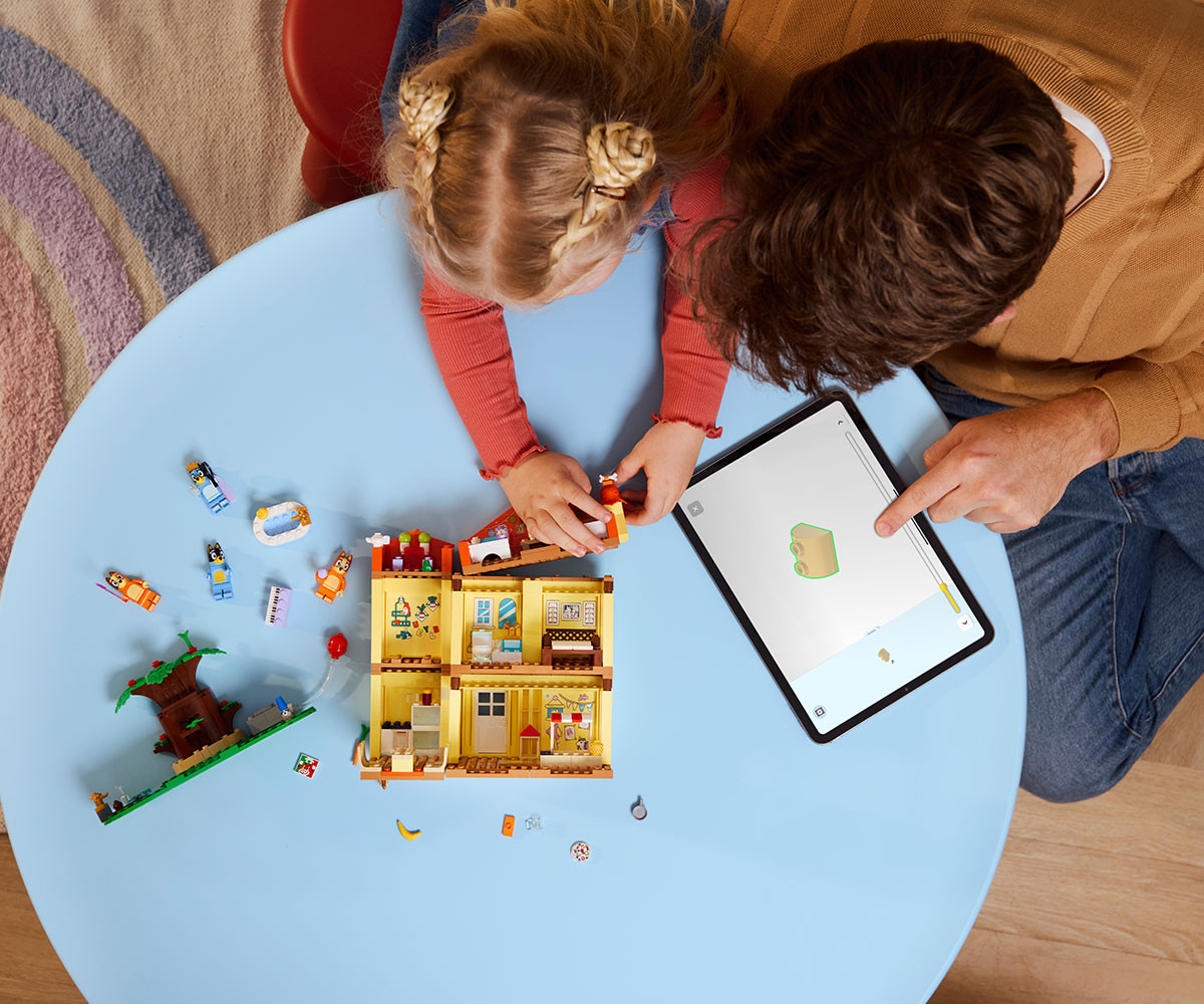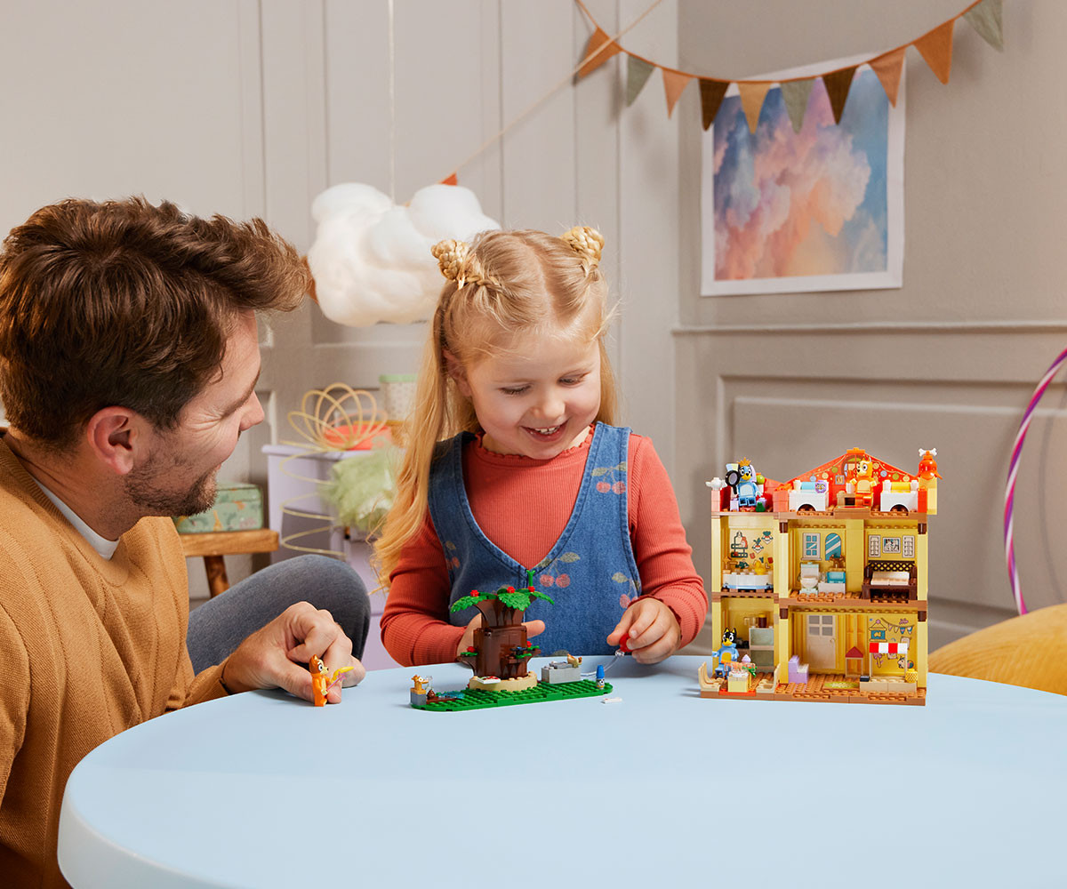 „Семейната къща на Блуи“ за построяване и игра е интерактивен комплект с модел на къща за деца над 4 години с минифигури на Блуи, Бинго, Чили и Бандит.