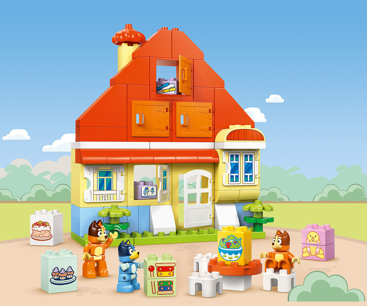 - Къща за конструиране, вдъхновена от ТВ сериала Блуи – този цветен модел на къщата на семейство Хийлър разполага със стаи с отварящи се прозорци, забавна въртяща се стрелка, маса и три стола;