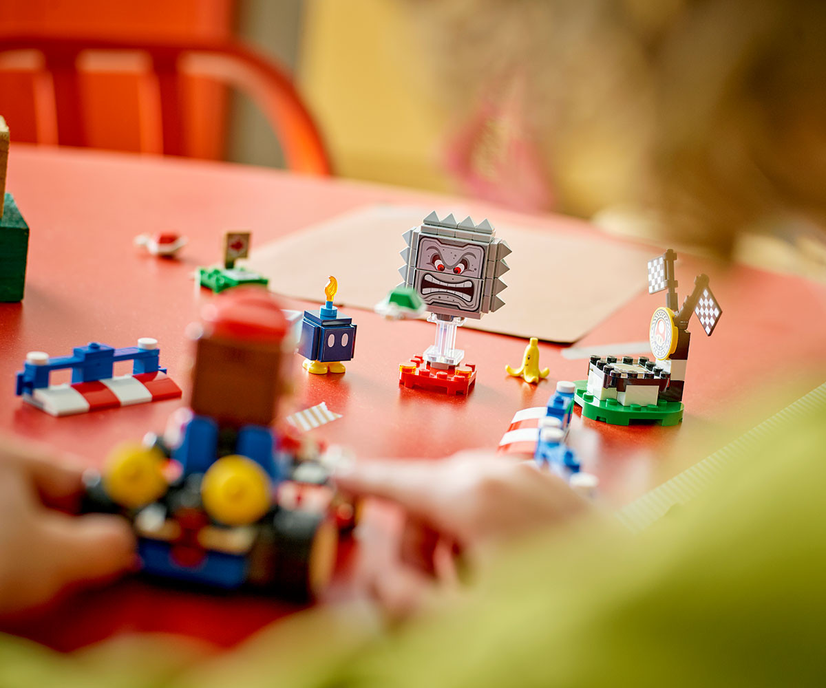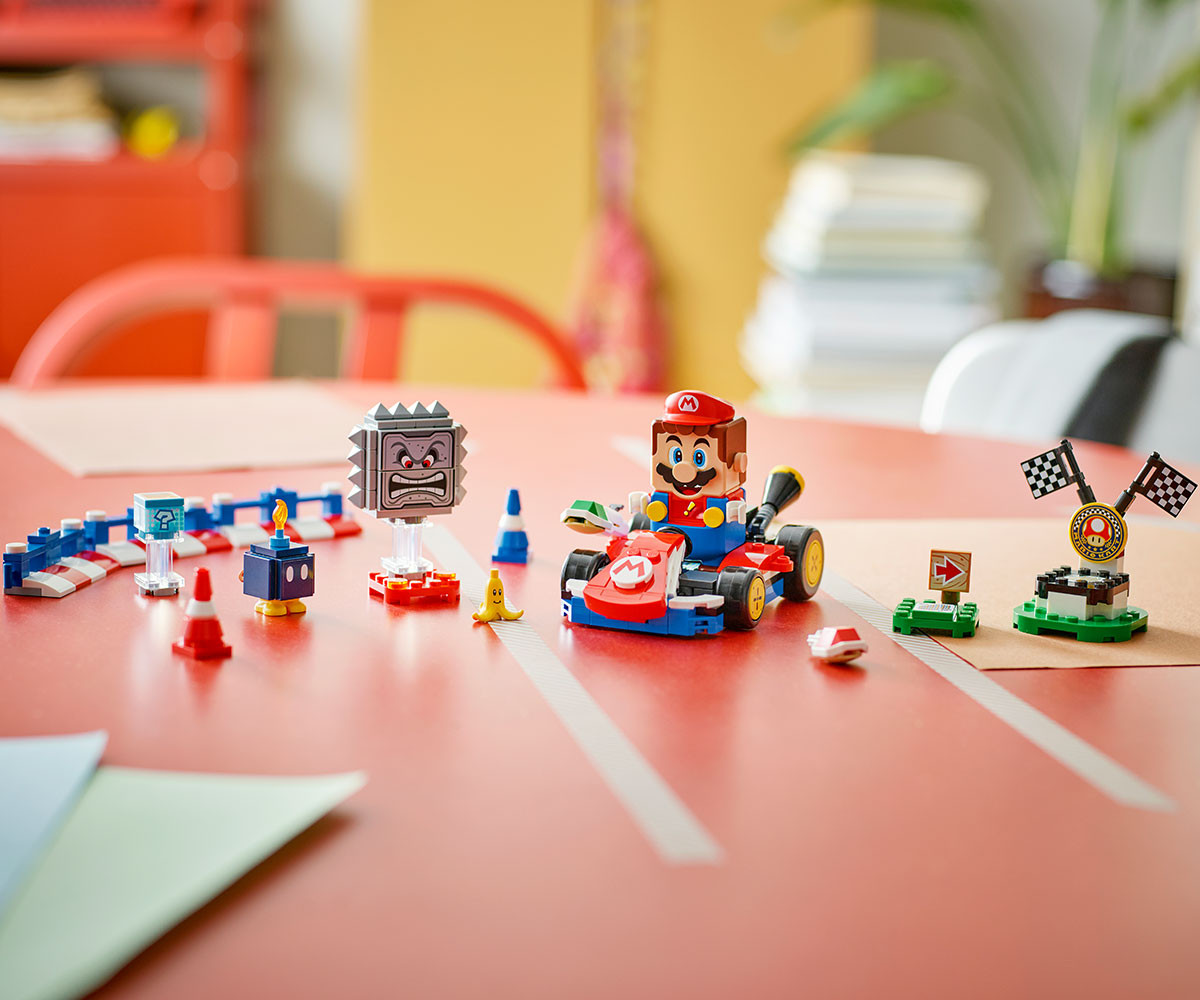 Пригответе се за състезание с LEGO® Mario™! Създайте своя уникална състезателна писта със свързващите се бариери и конуси. Карайте, маневрирайте и изстрелвайте shells в Standard Kart, за да задействате звуци и визуални ефекти от Mario Kart™. Спечелете награди от Item Box и вижте как LEGO Mario реагира на зелените и червените плочки LEGO. Победете Bob-omb и Thwomp и празнувайте в кръга на победителя!