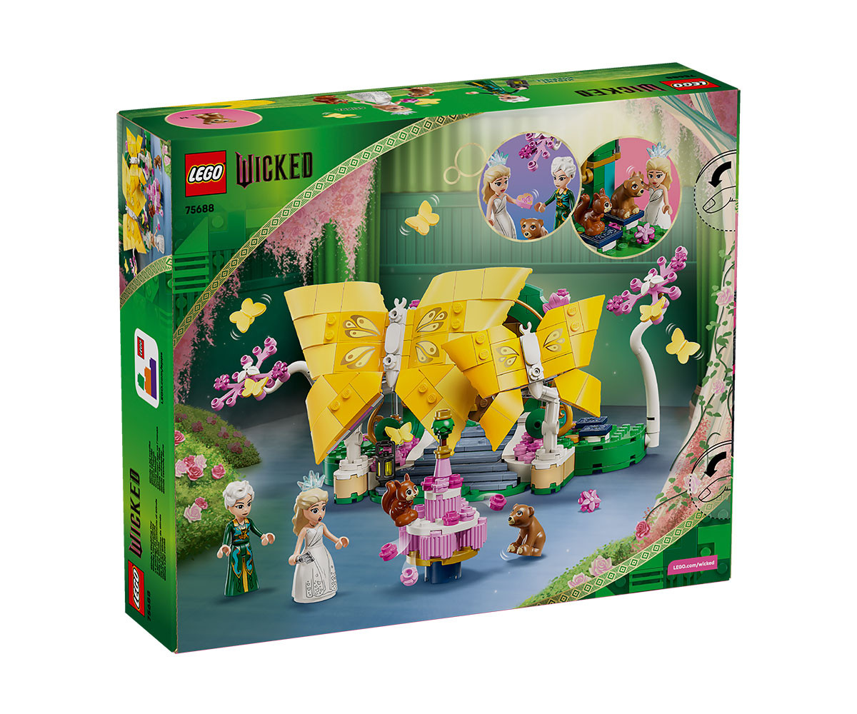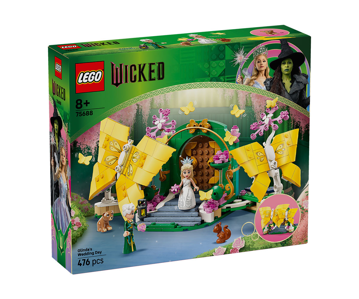 Открийте свят на творчески дейности с ролевата играчка LEGO® Wicked Сватбеният ден на Глинда (75688) за деца на възраст над 8 години. Момичета, момчета и фенове на продукти Wicked могат да построят този красив комплект, а после да разиграят драматичната сцена от Злосторница: Завинаги, в която Глинда се готви да се омъжи за Фийеро. Децата разделят гигантските подвижни пеперуди LEGO за конструиране, за да разкрият сватбената сцена. Този фантастичен подарък e пълен с разпознаваеми детайли от филма, включително сватбената торта, покана във формата на сърце и букета на Глинда от Фийеро. За автентична ролева игра Глинда носи роклята и диадемата от филма и има сменяемо лице, докато щастливият й ден се превръща в катастрофа, когато включените фигури на животни съсипват всичко. Когато играта приключи, децата затварят подаръка на тема Wicked, като събират пеперудите и показват този впечатляващ комплект в стаята си. Тази играчка за построяване може да се използва с други комплекти LEGO Wicked, така че приключенията от филмите никога да не свършват. Комплектът съдържа 476 части.