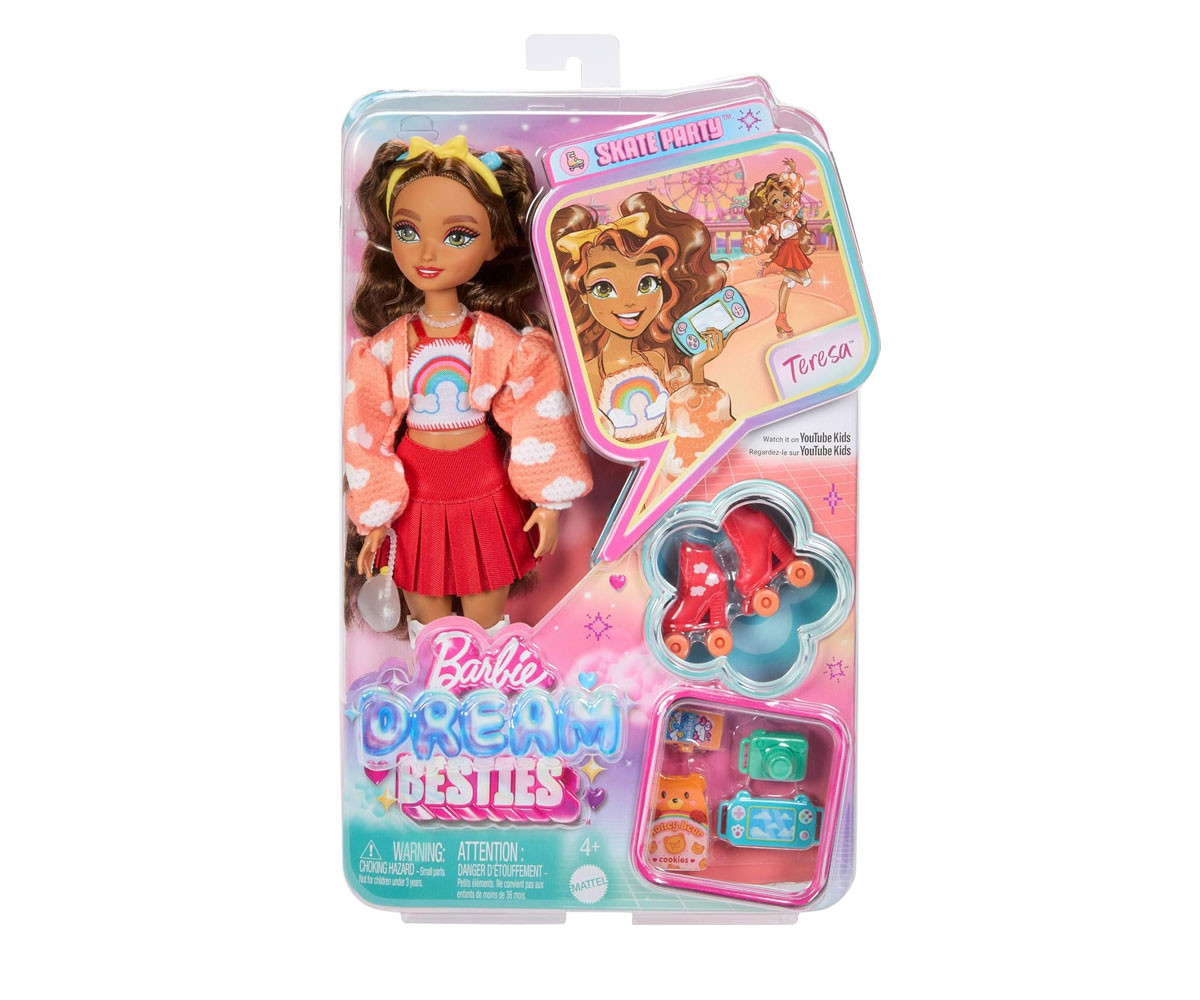 Куклите Barbie Dream Besties идват със забавни аксесоари, които съответстват на новото хоби на Барби – ролерите! Вижте Тереса в нови дрехи, вдъхновени от облаци, които пасват на нейните ролери. Тереса мечтае да стане разработчик на видеоигри. Нейните тематични аксесоари, като преносимата игрова конзола, телефон и чанта с форма на мечка, винаги са под ръка. Тереса има дълга кафява коса за забавление при стилизиране и вдъхновява децата на възраст 4 и повече години да мечтаят и да следват мечтите си. Куклата не може да стои сама. Цветовете и декорациите може да варират.