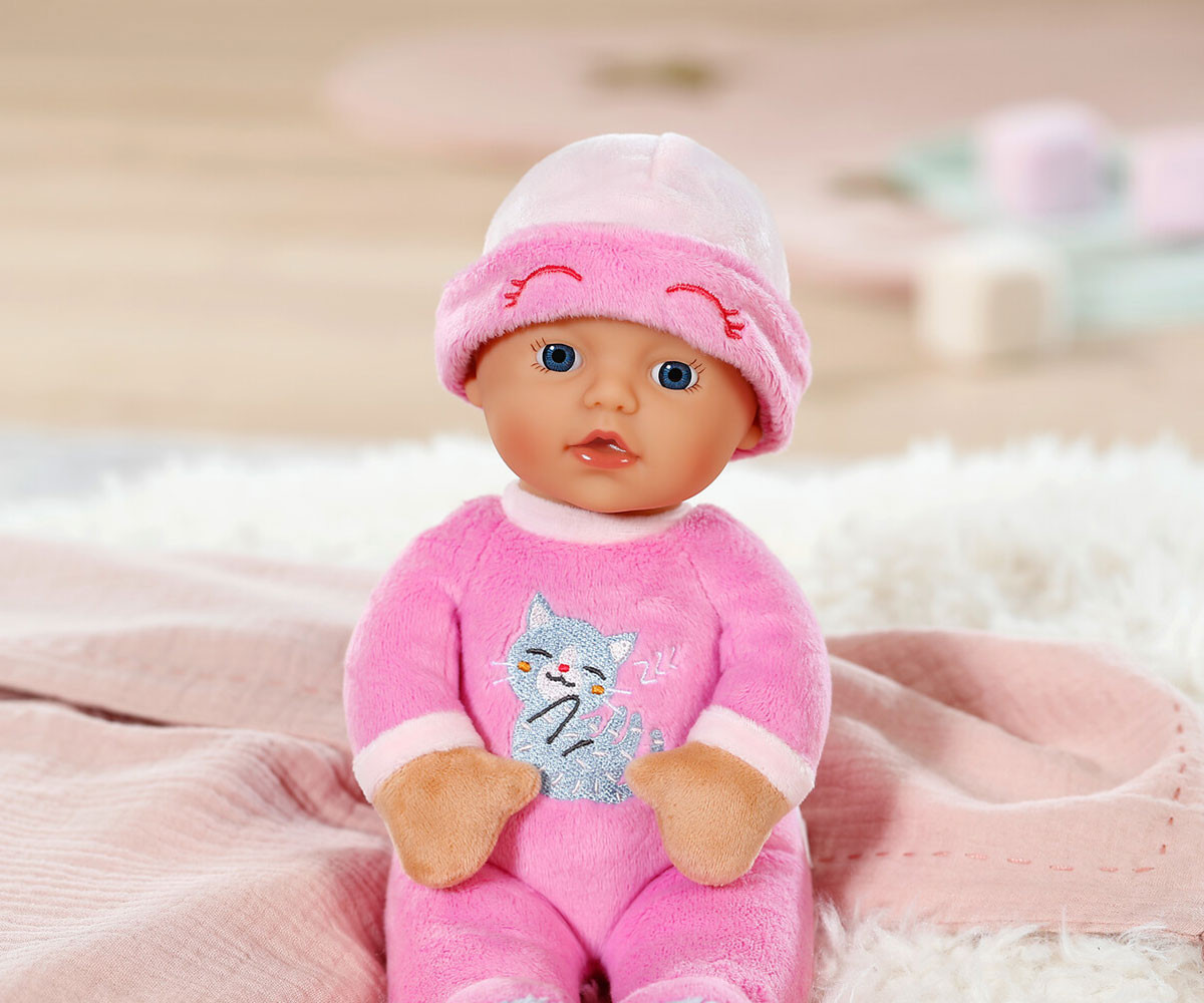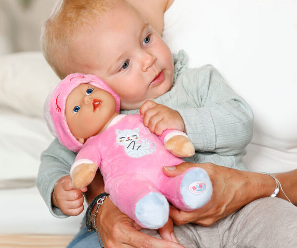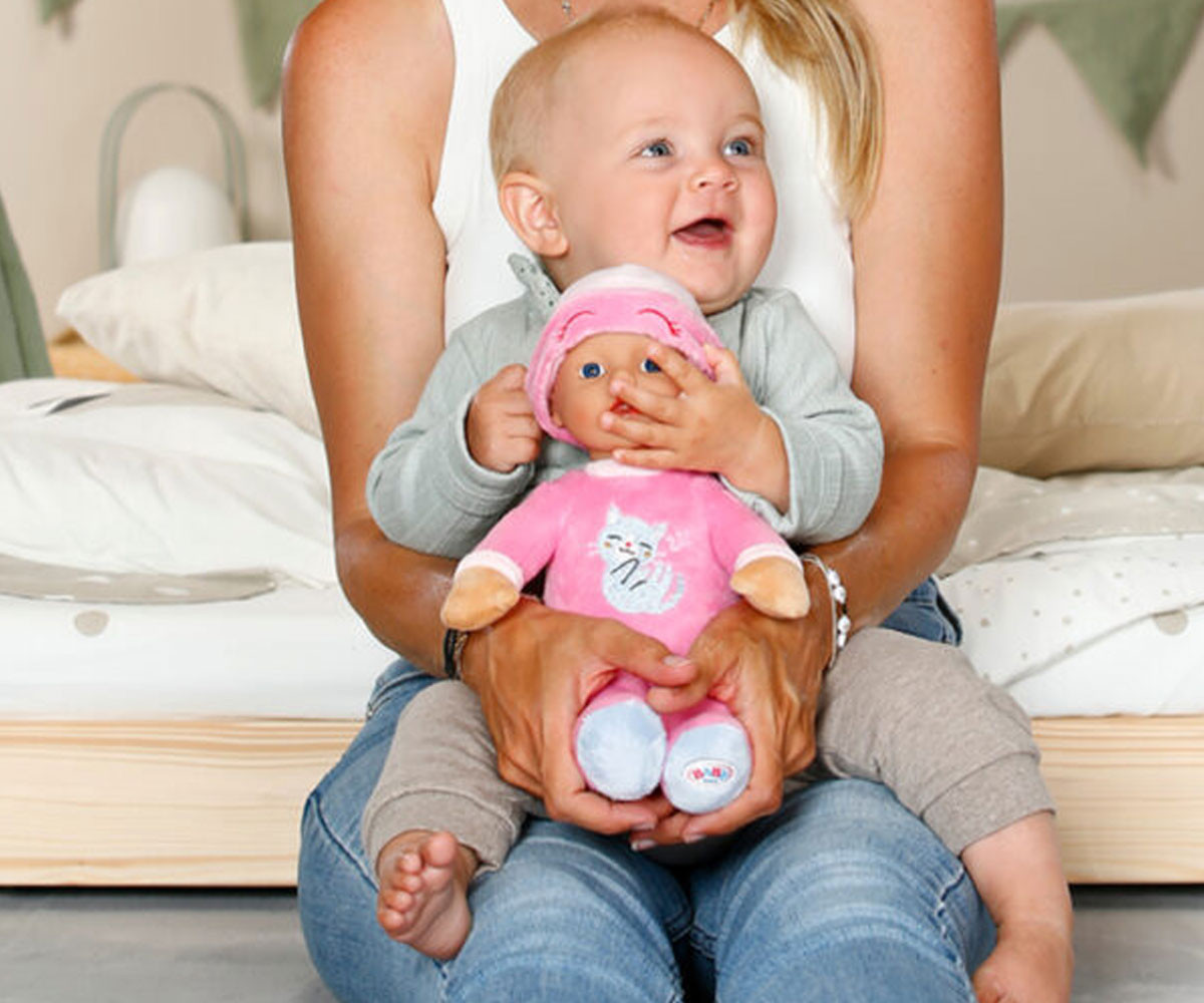 Peek-a-boo! – Куклата BABY born for babies Sleepy Pink е най-милото малко другарче за бебета. Очарователната ѝ шапчица може да се издърпва върху очите – за сладка дрямка или за игра на „ку-ку“. Нейното супер меко тяло и розов гащеризон с котешки мотив я правят идеална за прегръдки през цялата нощ. При леко разклащане бебето ще чуе дрънкалката – чудесна за първите моменти на откриване и забавление. Куклата може да се пере на ръка, за да остане винаги чиста и готова за игра. Създадена като перфектен първи подарък за бебета, тя съчетава нежност, безопасност и радост в едно.