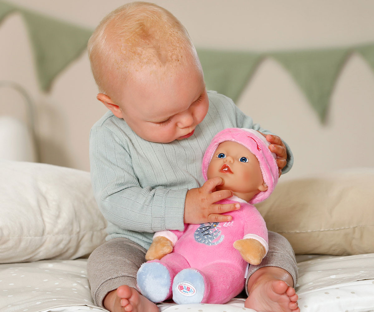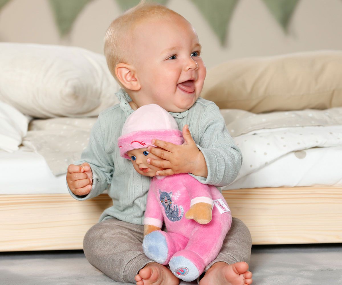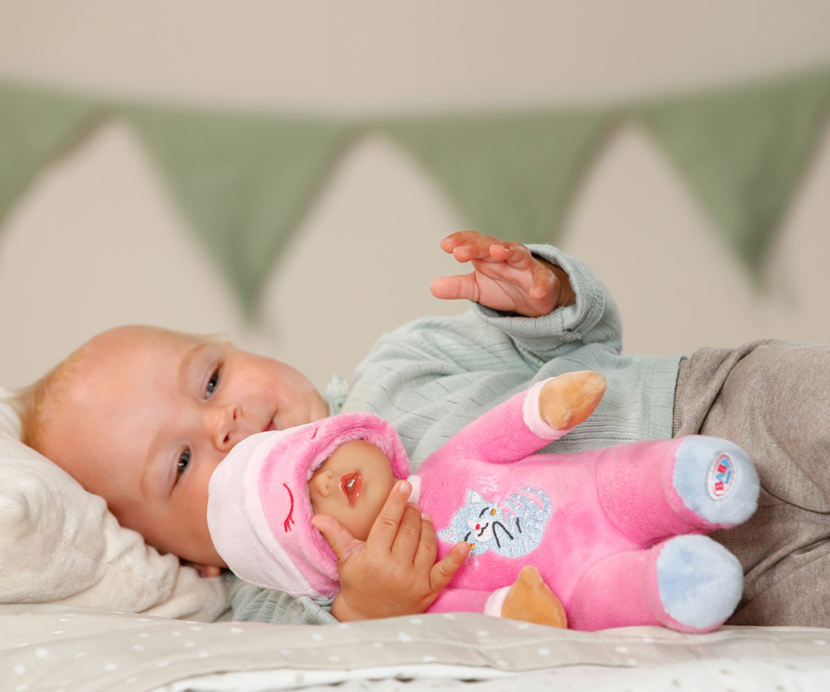 Peek-a-boo! – Куклата BABY born for babies Sleepy Pink е най-милото малко другарче за бебета. Очарователната ѝ шапчица може да се издърпва върху очите – за сладка дрямка или за игра на „ку-ку“. Нейното супер меко тяло и розов гащеризон с котешки мотив я правят идеална за прегръдки през цялата нощ. При леко разклащане бебето ще чуе дрънкалката – чудесна за първите моменти на откриване и забавление. Куклата може да се пере на ръка, за да остане винаги чиста и готова за игра. Създадена като перфектен първи подарък за бебета, тя съчетава нежност, безопасност и радост в едно.