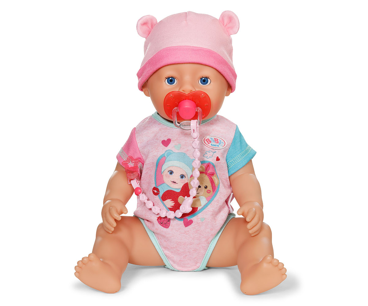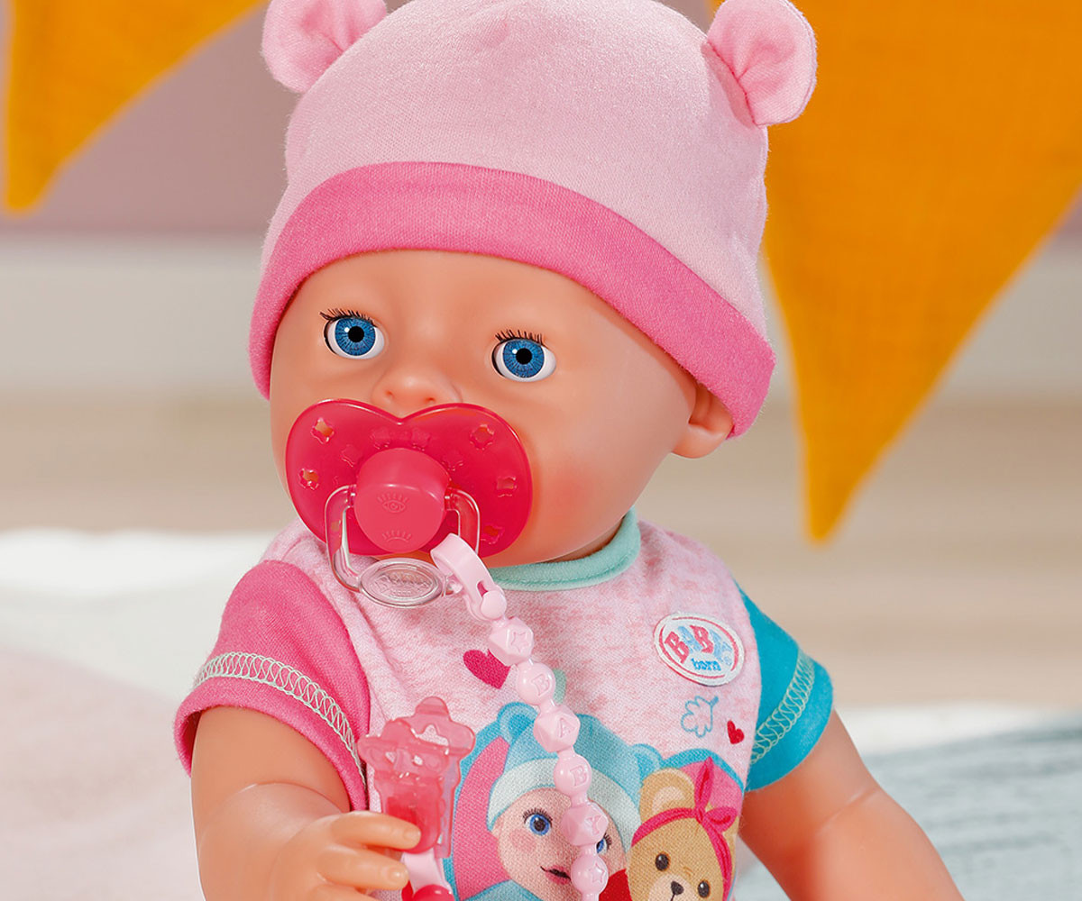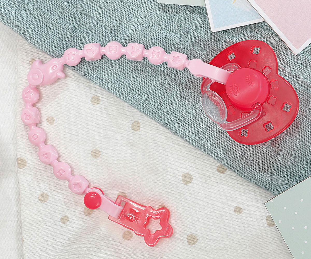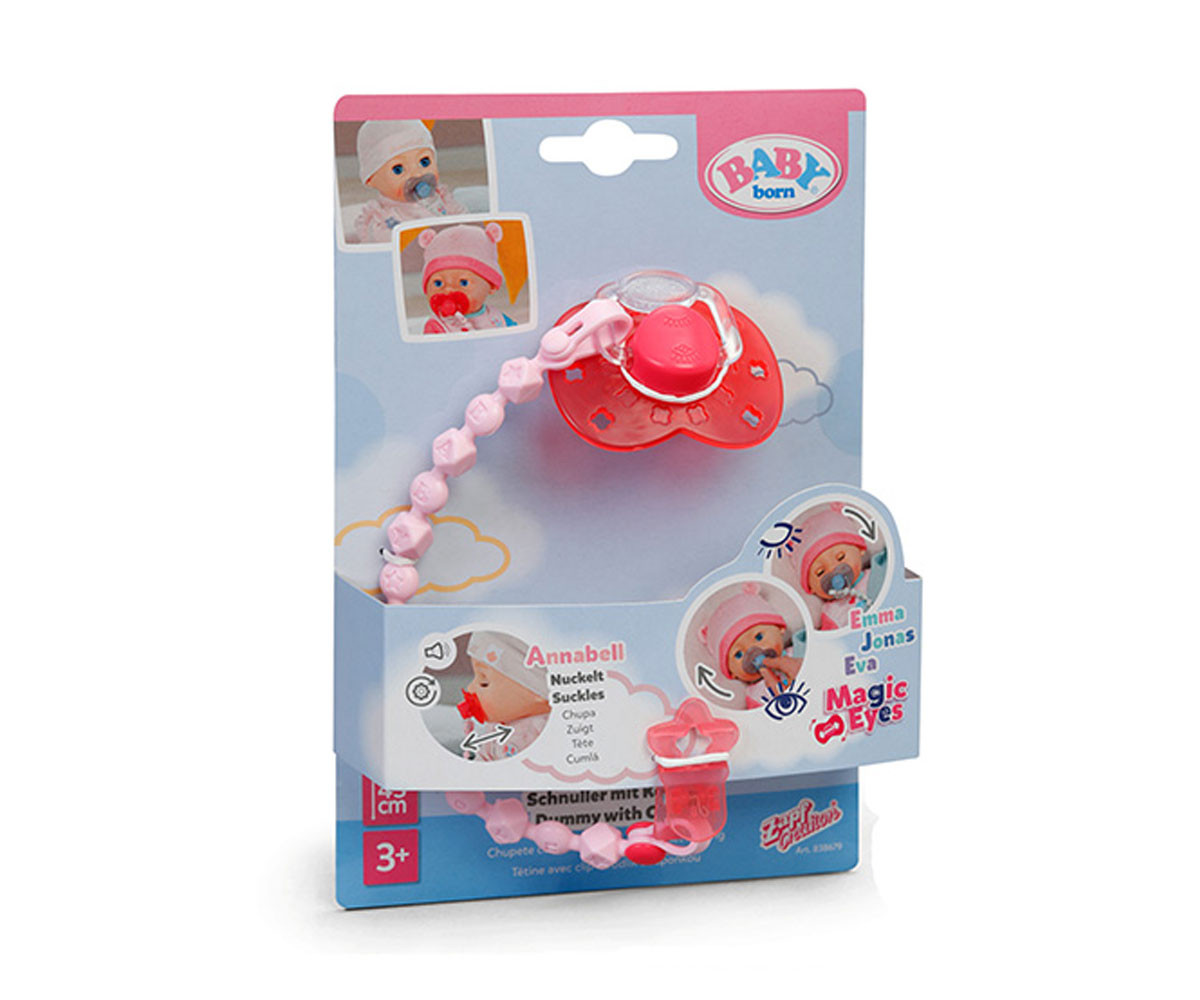 BABY born залъгалка с клипс – реалистично и интерактивно допълнение към играта с кукли бебета. BABY born залъгалка с клипс прави куклената игра още по-реалистична и увлекателна. Подходящ за BABY born и Baby Annabell кукли с размер 43 см, биберонът задейства различни функции в зависимост от куклата.