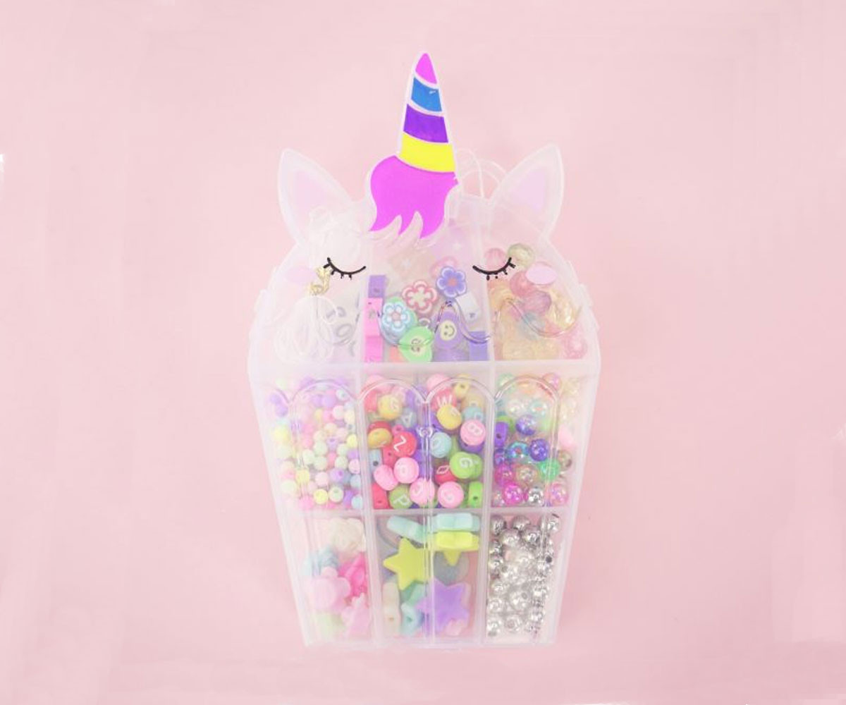 Комплект за носене навсякъде със себе си, във форма на еднорог (в три различни варианта), съдържащ цветни мъниста във форми на звезди, златисти и сребристи мъниста, цилиндри, цветя, сърца, букви и различни фигурки от фимо. Създай бижута за себе си или направи подарък за приятел!