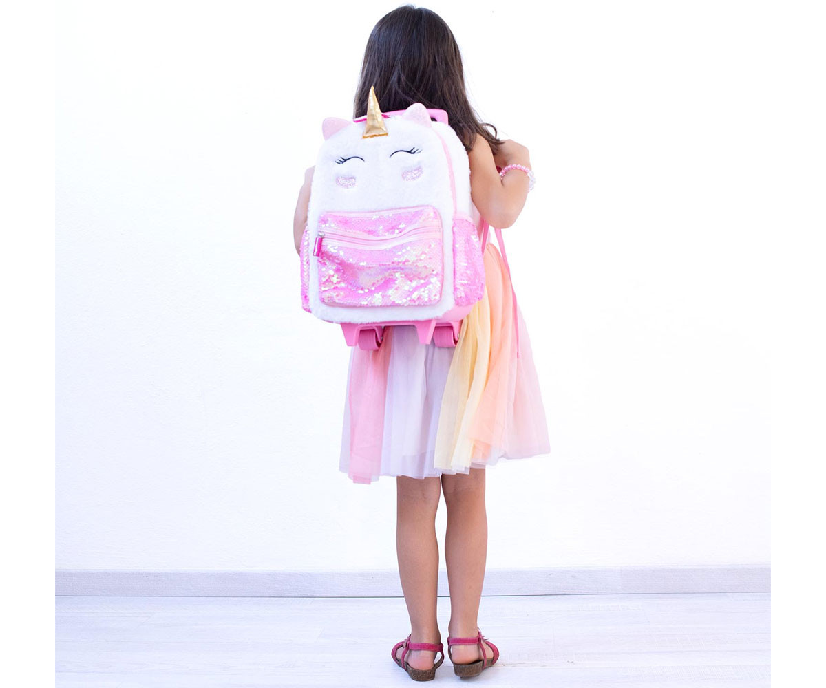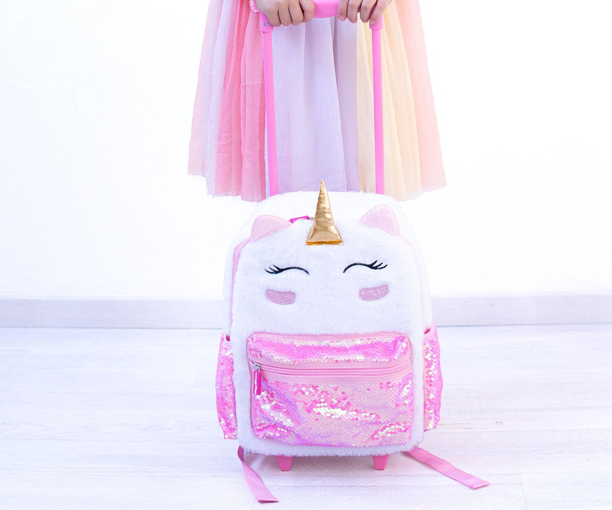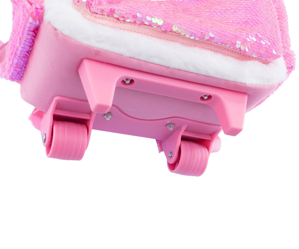Весел плюшена раница с дръжка, която можете да носите навсякъде със себе си. Просторна и издръжлива, тя е идеална както за свободното време, така и за училище. Разполага с основно отделение и преден джоб с цип, два странични джоба с ластик, удобни подплатени и регулируеми презрамки, телескопична дръжка и здрави, стабилни колела.