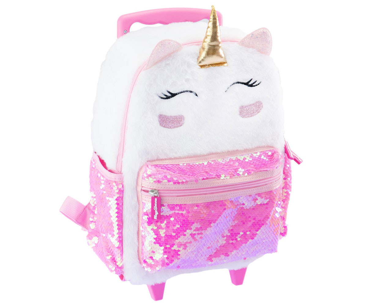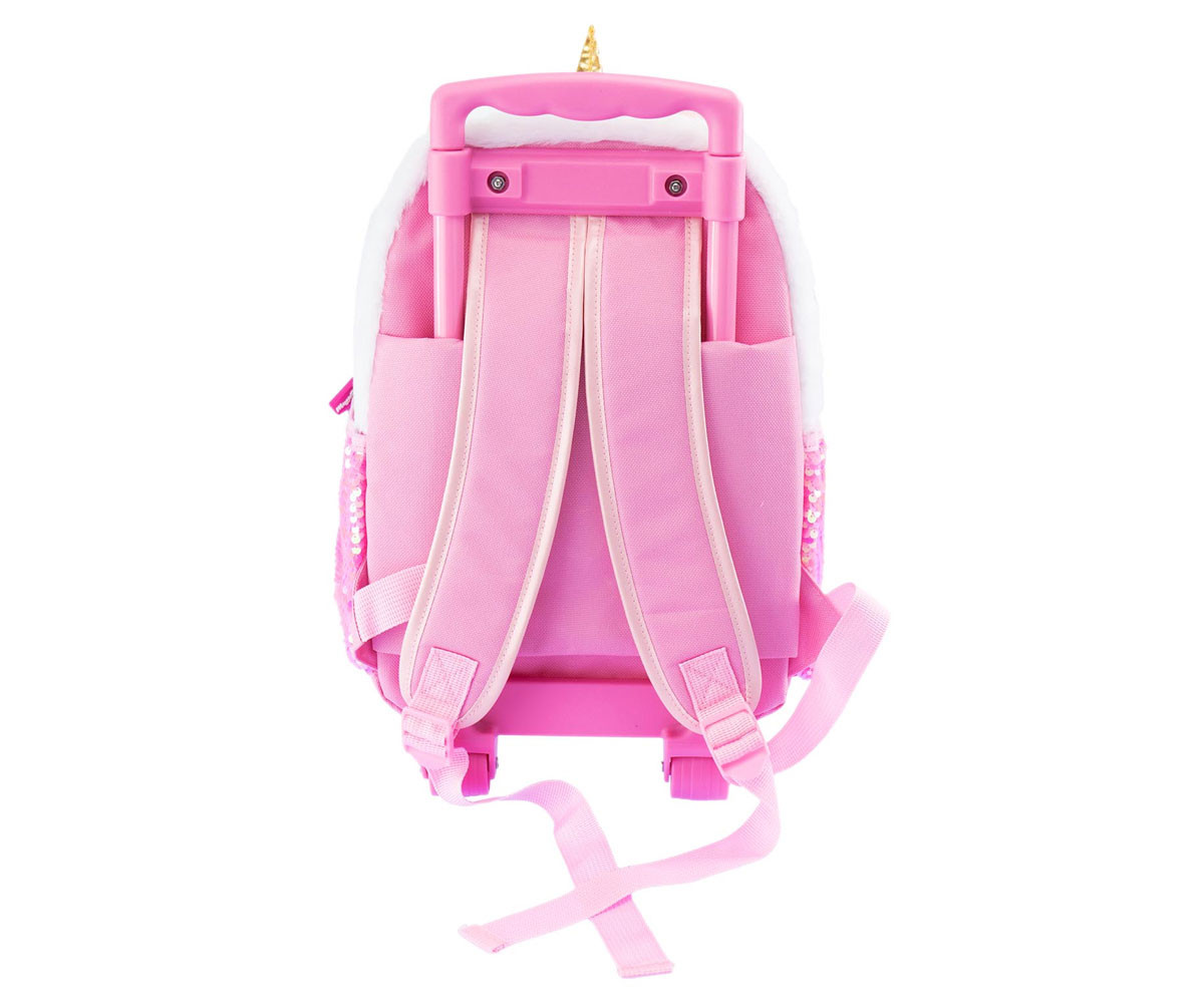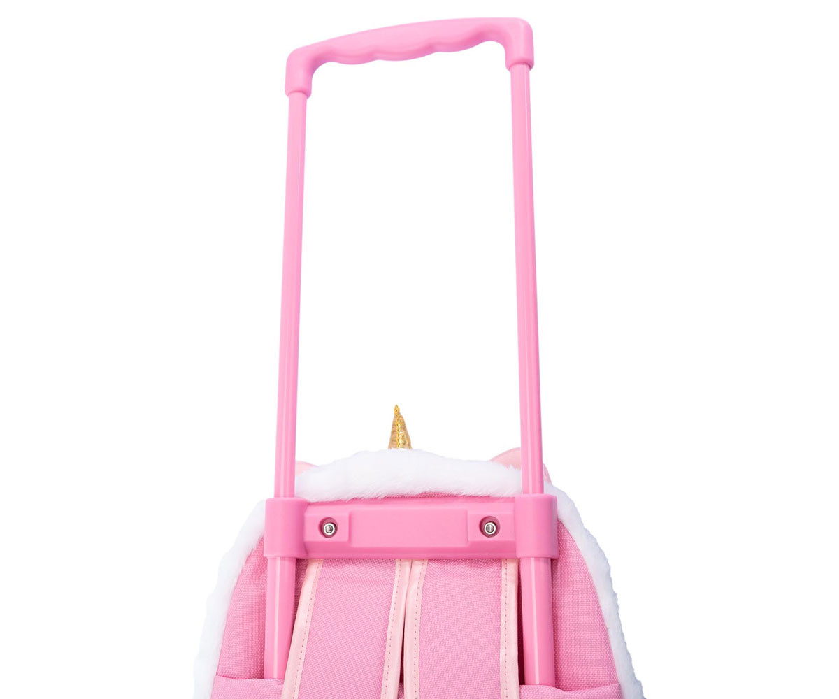 Весел плюшена раница с дръжка, която можете да носите навсякъде със себе си. Просторна и издръжлива, тя е идеална както за свободното време, така и за училище. Разполага с основно отделение и преден джоб с цип, два странични джоба с ластик, удобни подплатени и регулируеми презрамки, телескопична дръжка и здрави, стабилни колела.