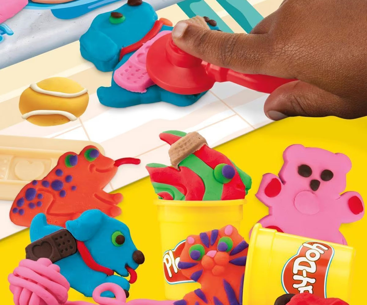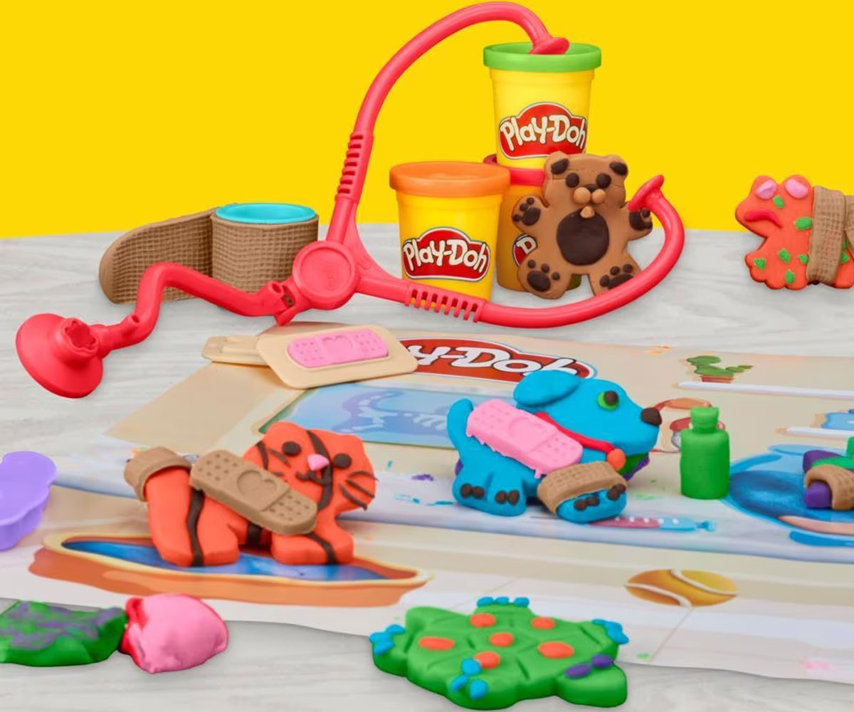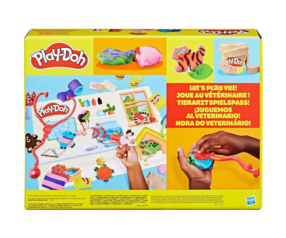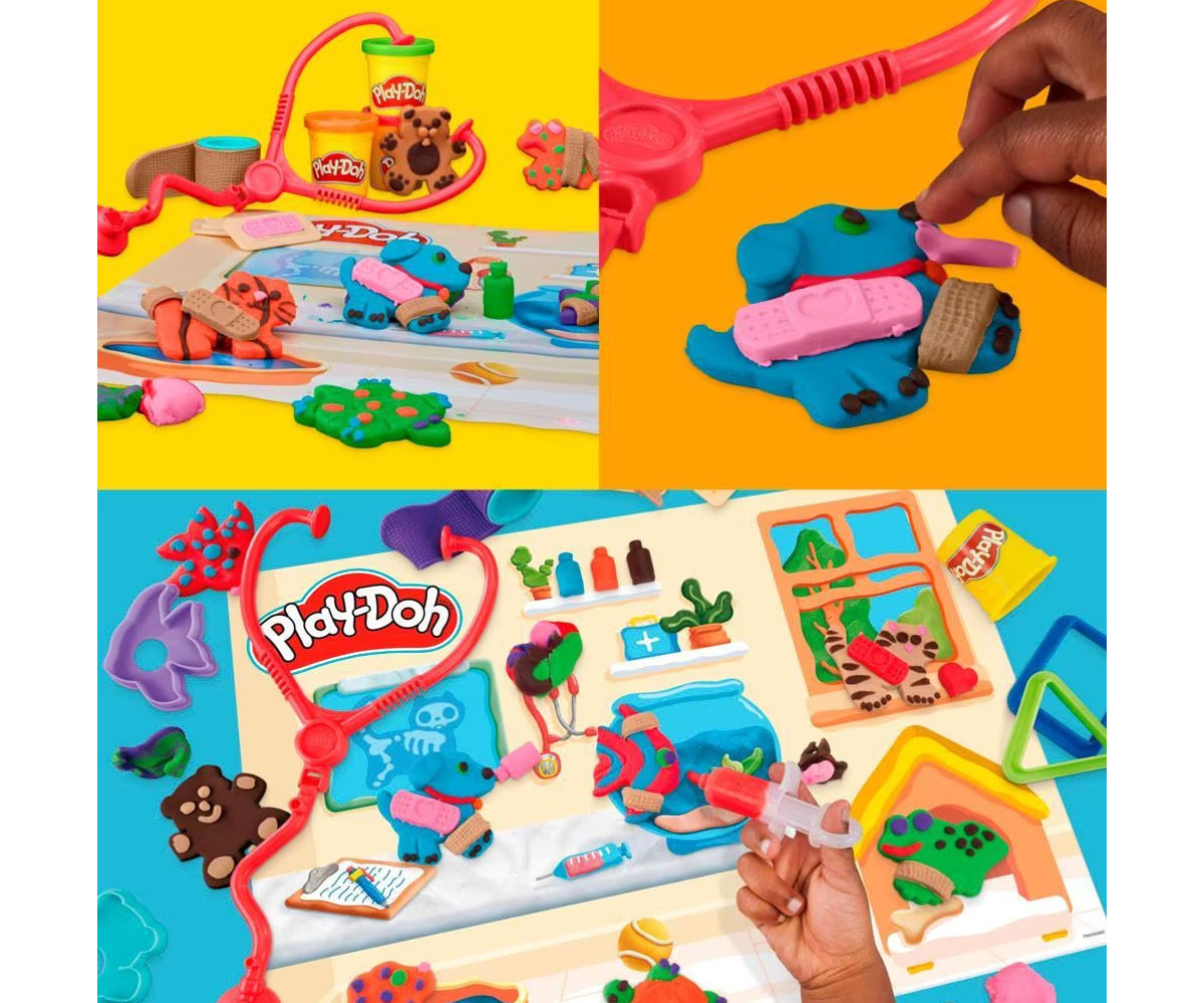 - Поставката за Play-Doh включва цветна сцена на ветеринарен кабинет, която помага да се вдъхнови разказването на истории, като същевременно улеснява почистването;