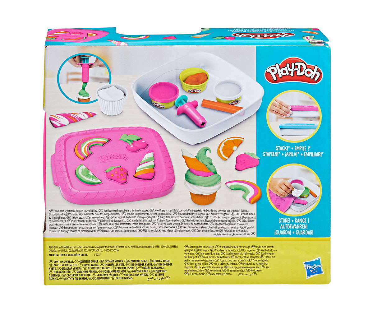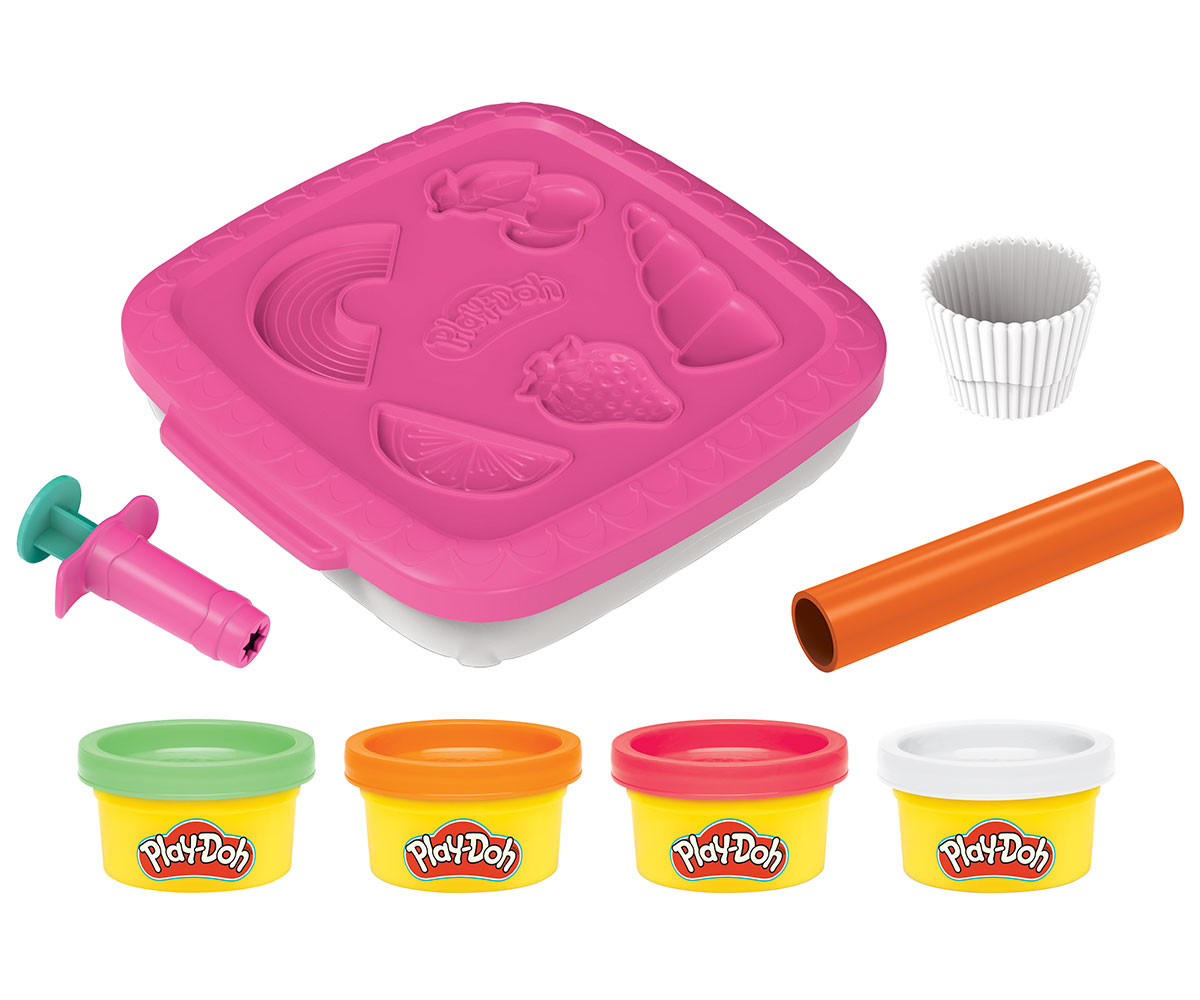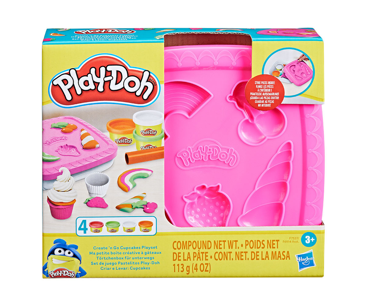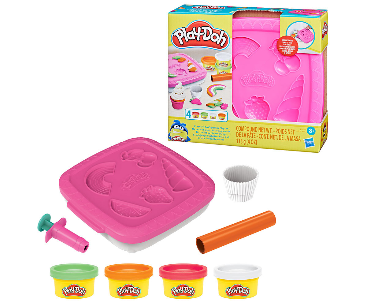 Комплектът Play-Doh Create ‘n Go Cupcakes съдържа всичко необходимо, за да създадат децата фантастични кексчета от Play-Doh! Включва 113 грама пластилин в различни цветове, както и форма за чашка за кексче, валяк и инструмент за създаване на „глазура“. Удобната и многократно използваема кутия за съхранение събира всички елементи след игра и добавя още забавление с декоративни релефни форми на капака – за направата на ягодка, черешка, дъга и други. Тази творческа играчка е чудесна за занимания с изкуства и игра за момичета и момчета на възраст 3+ години.