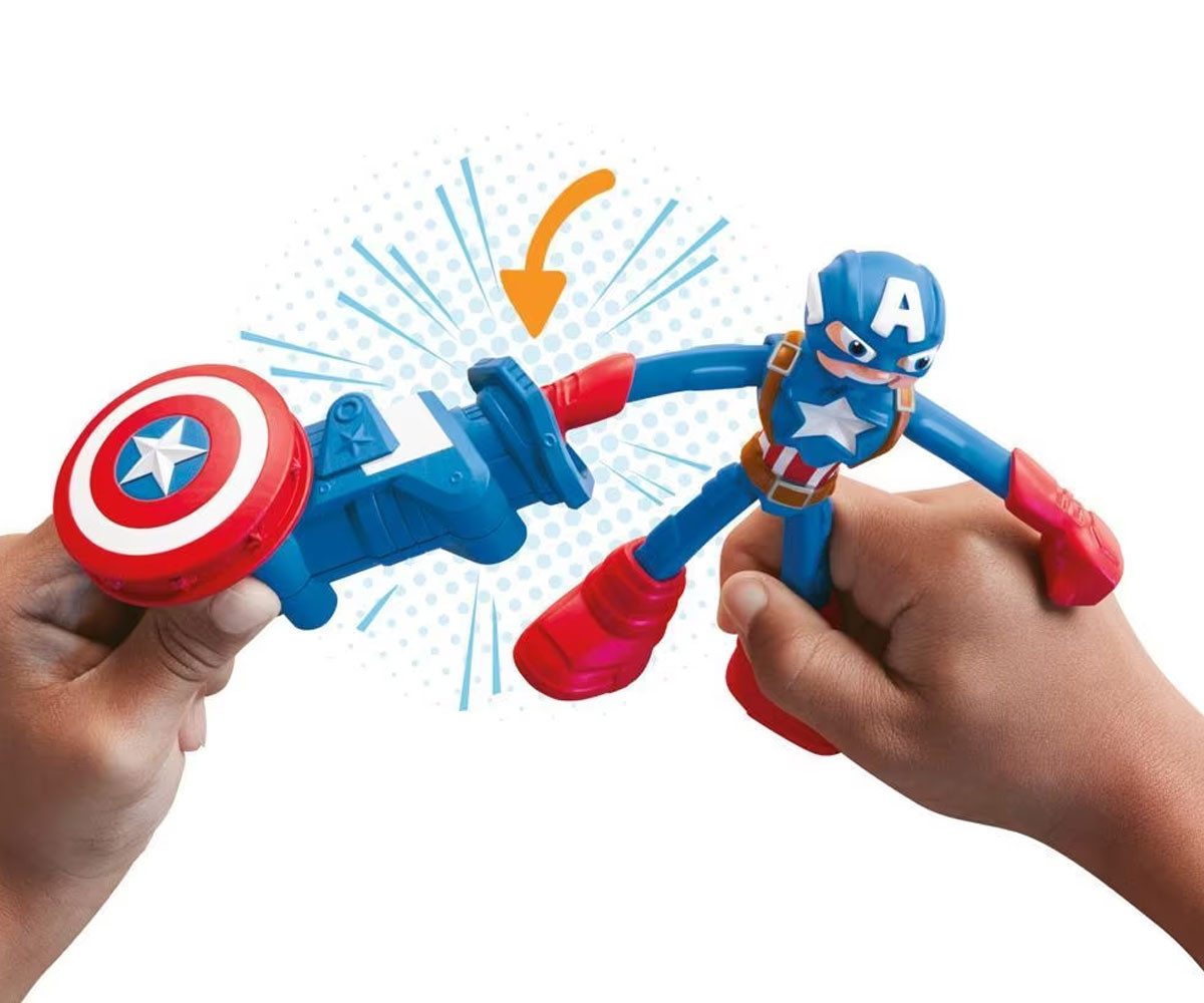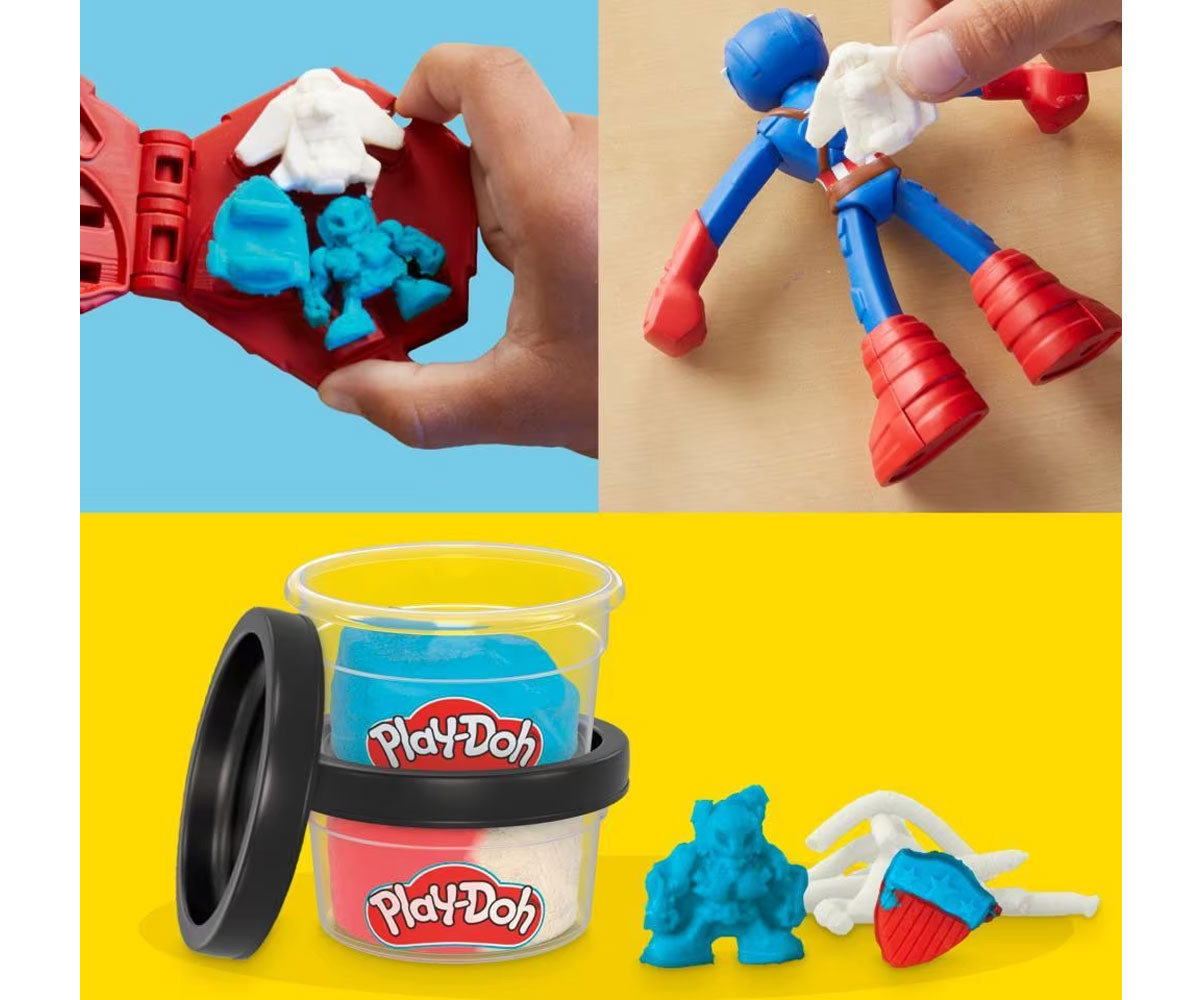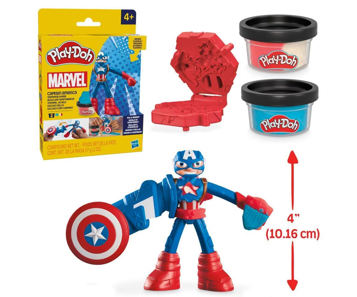 Развихрете въображението на децата с игралния комплект Play-Doh Marvel Captain America Stamping Shield! 10 см огъваща се екшън фигурка и аксесоарите Play-Doh позволяват на децата да разиграват епични истории. Представете си как се биете с Play-Doh Ultron, летите над града с реактивна раница Play-Doh и улавяте лошите, докато въртите инструмента Stamping Shield. Използвайте цветовете на Play-Doh, за да персонализирате логото на гърдите на екшън фигурката на Капитан Америка или си представете други подобрения на неговия костюм. Тези играчки Play-Doh Captain America за момчета и момичета се доставят с 57 грама класически Play-Doh пластилин. Този комплект Play-Doh е чудесен подарък за деца, фенове на супергерои, изкуствата и занаяти, както и сензорната игра.