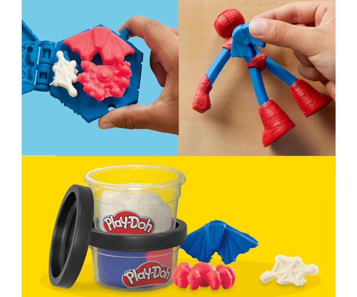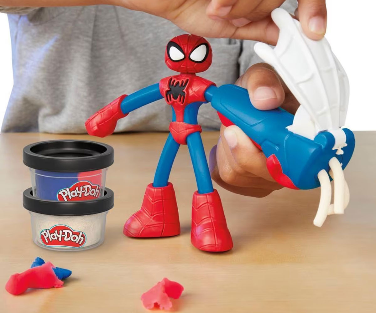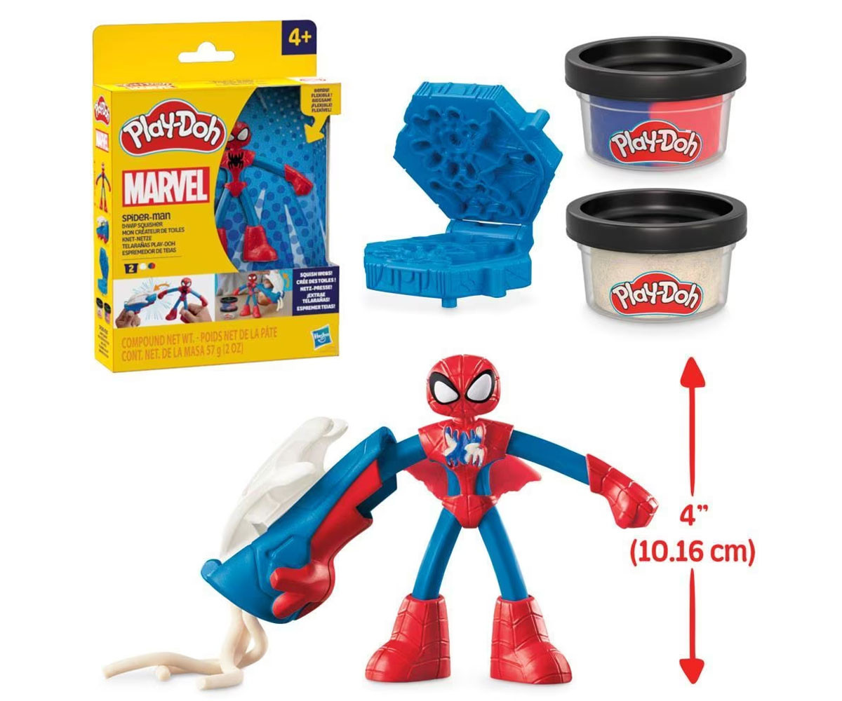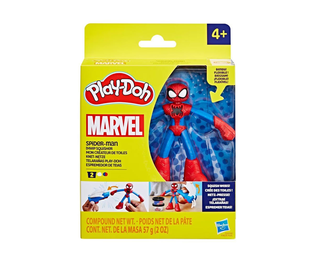 Творческата сила е в ръцете на децата с този комплект Play-Doh! Развихрете въображението на децата с комплекта за игра Play-Doh Marvel Spider-Man Thwip Squisher! Гъвкавата фигурка с височина 10 см и аксесоарите Play-Doh позволяват на децата да пресъздават епични истории. Представете си битки със злодеи, използвайки Play-Doh мрежи и паяжини, летене над града с Play-Doh крила и залавяне на злодеи, докато създавате Play-Doh мрежи с инструмента Thwip Squisher. Персонализирайте логото на гърдите на фигурката на Spider-Man или си представяйте други подобрения на костюма му. Тези играчки Spider-Man от Play-Doh за момчета и момичета идват с 57 грама класически Play-Doh пластилин. Този комплект Play-Doh е чудесен подарък за деца, фенове на супергерои, изкуствата и занаяти, както и сензорната игра.