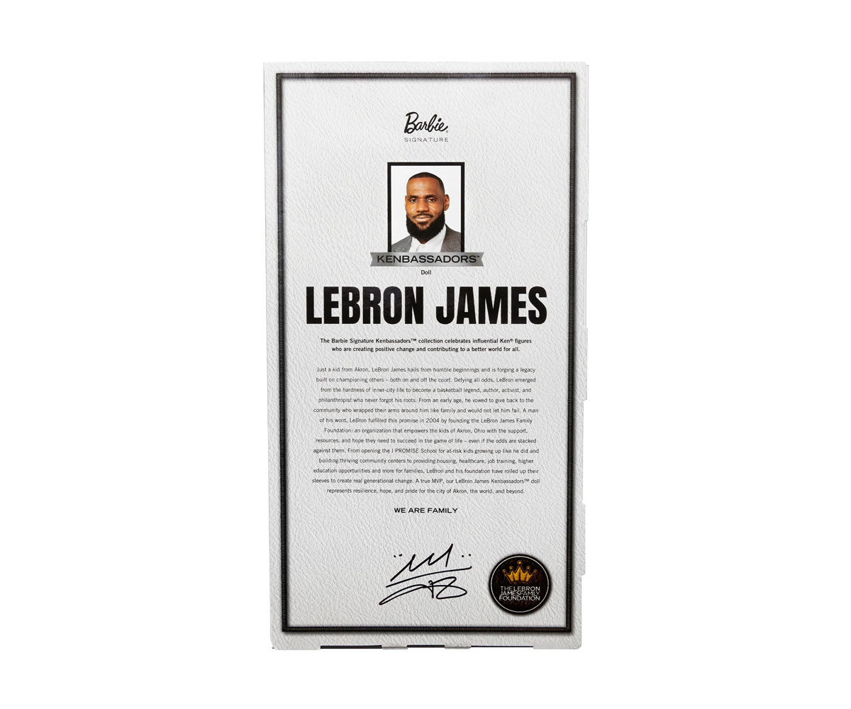 Колекцията Barbie Signature Kenbassadors отдава почит на вдъхновяващи мъже в образа на Кен, които създават положителна промяна и допринасят за един по-добър свят за всички. Въпреки всички препятствия, ЛеБрон Джеймс излиза от суровата градска среда, за да се превърне в баскетболна легенда, активист и филантроп, чиято мисия е да вдъхновява и подкрепя другите – както на игрището, така и извън него. Като културна и модна икона, тази кукла ЛеБрон Джеймс Кен впечатлява с визия, която улавя характерния за него елегантен уличен стил, докато гордо представя Фондацията на семейство Джеймс – неговата неправителствена организация, която дава на децата всичко необходимо, за да успеят в живота.