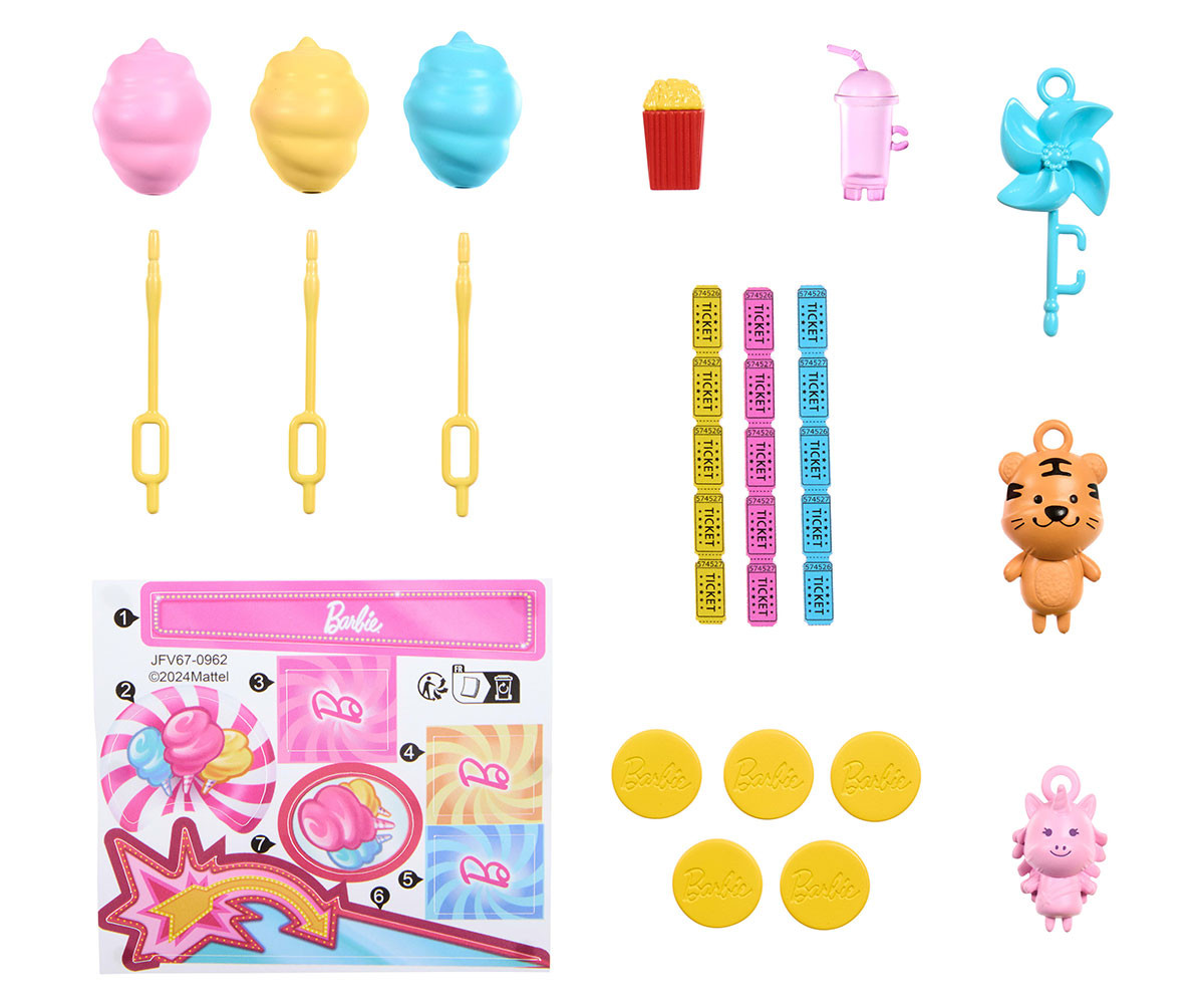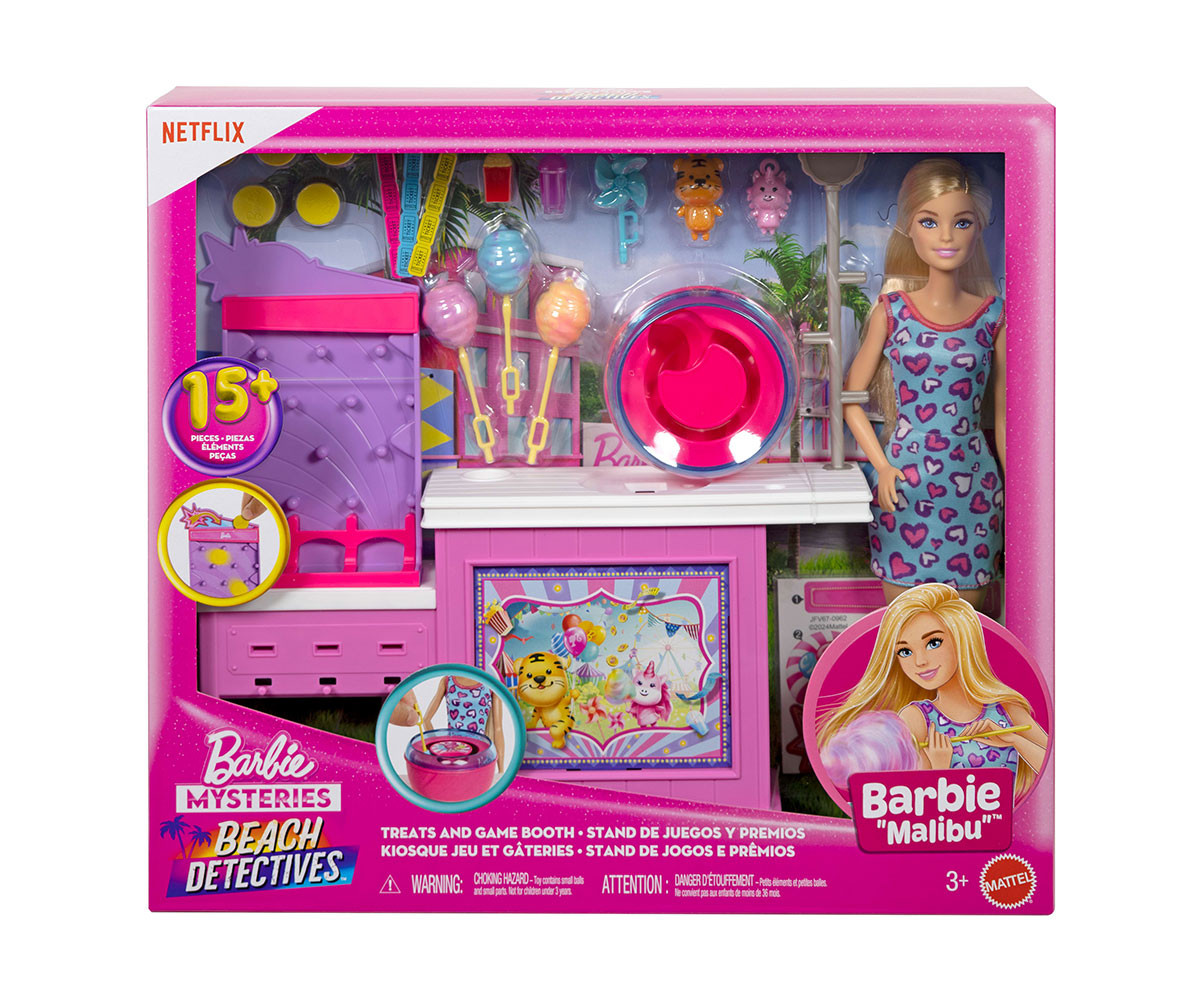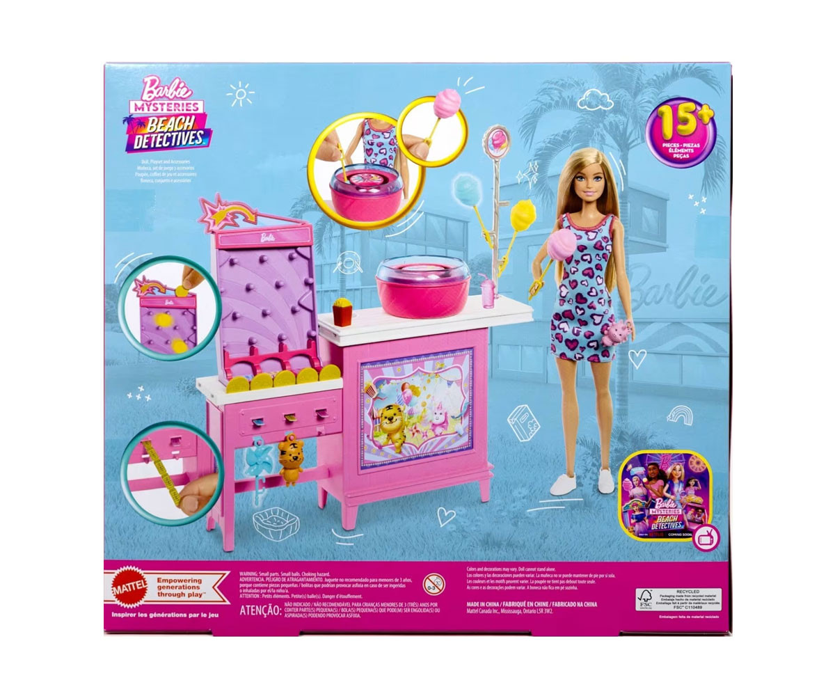 С въображението си децата могат да измислят всякакви истории край морето с куклата и комплекта с будка за игри от „Тайните на Барби: Детективи на плажа“, който включва 20 аксесоара! Вдъхновен от хитовия сериал, този комплект пренася феновете на крайбрежна алея с будка за игри и машина за захарен памук. Децата могат да пуснат жетон в играта и да помогнат на куклата Малибу да избере награда — има прасенце, тигър и въртележка — след това да се забавляват с машината за захарен памук! Куклата Барби „Малибу“ е облечена за слънчево забавление в ежедневна рокля с щампа на сърца и бели кецове. Децата и феновете на възраст над 3 години ще се радват да пресъздават сцени от сериала и да измислят свои собствени приключения на плажа! Куклата не може да стои самостоятелно. Цветовете и декорациите може да варират.