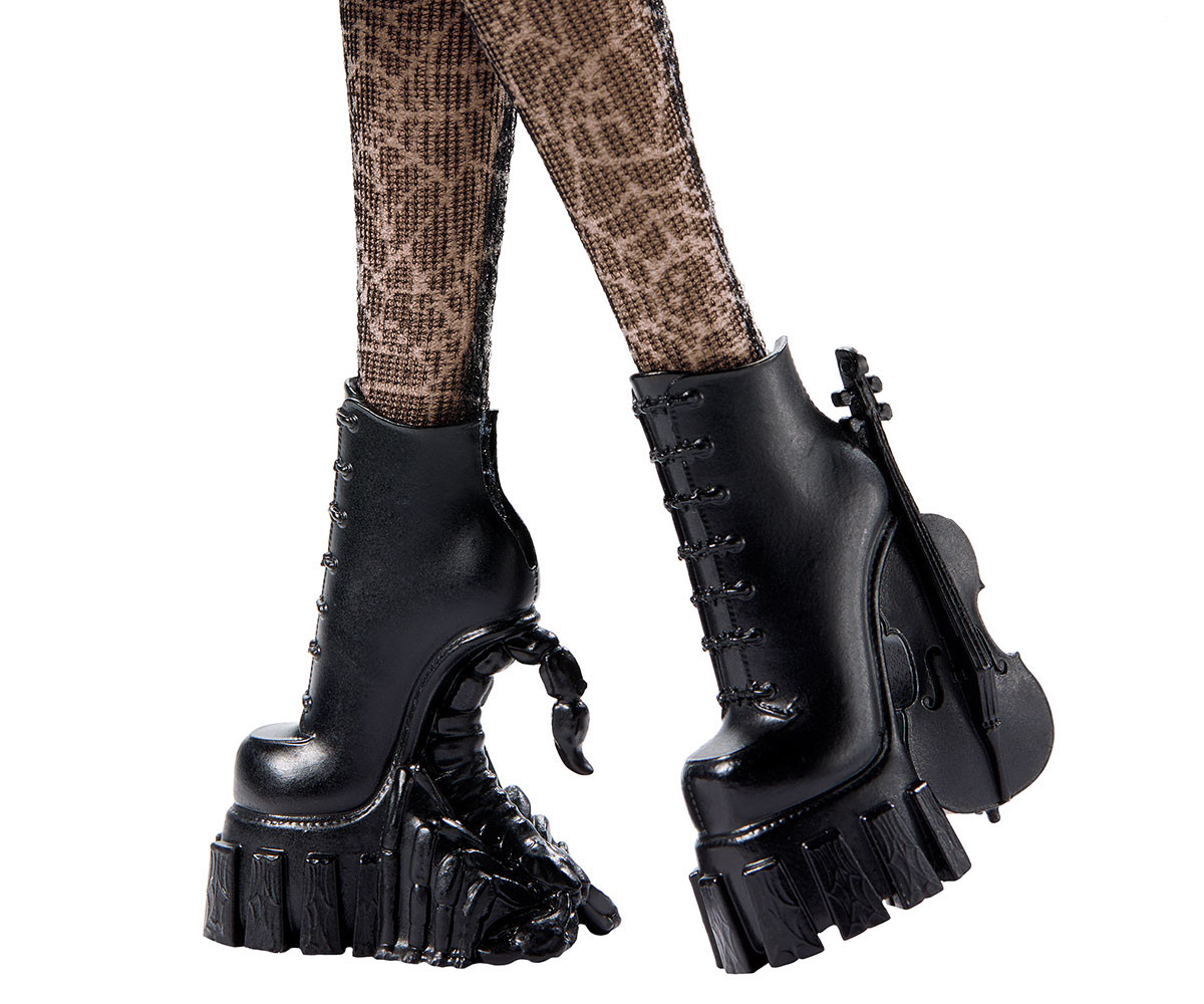 - Вратовръзка, изящен колан и чорапогащник с паяжина допълват униформата на Nevermore Academy. Ботуши с масивна платформа представят нейното виолончело на едната пета и нейния любим скорпион Nero на другата;
