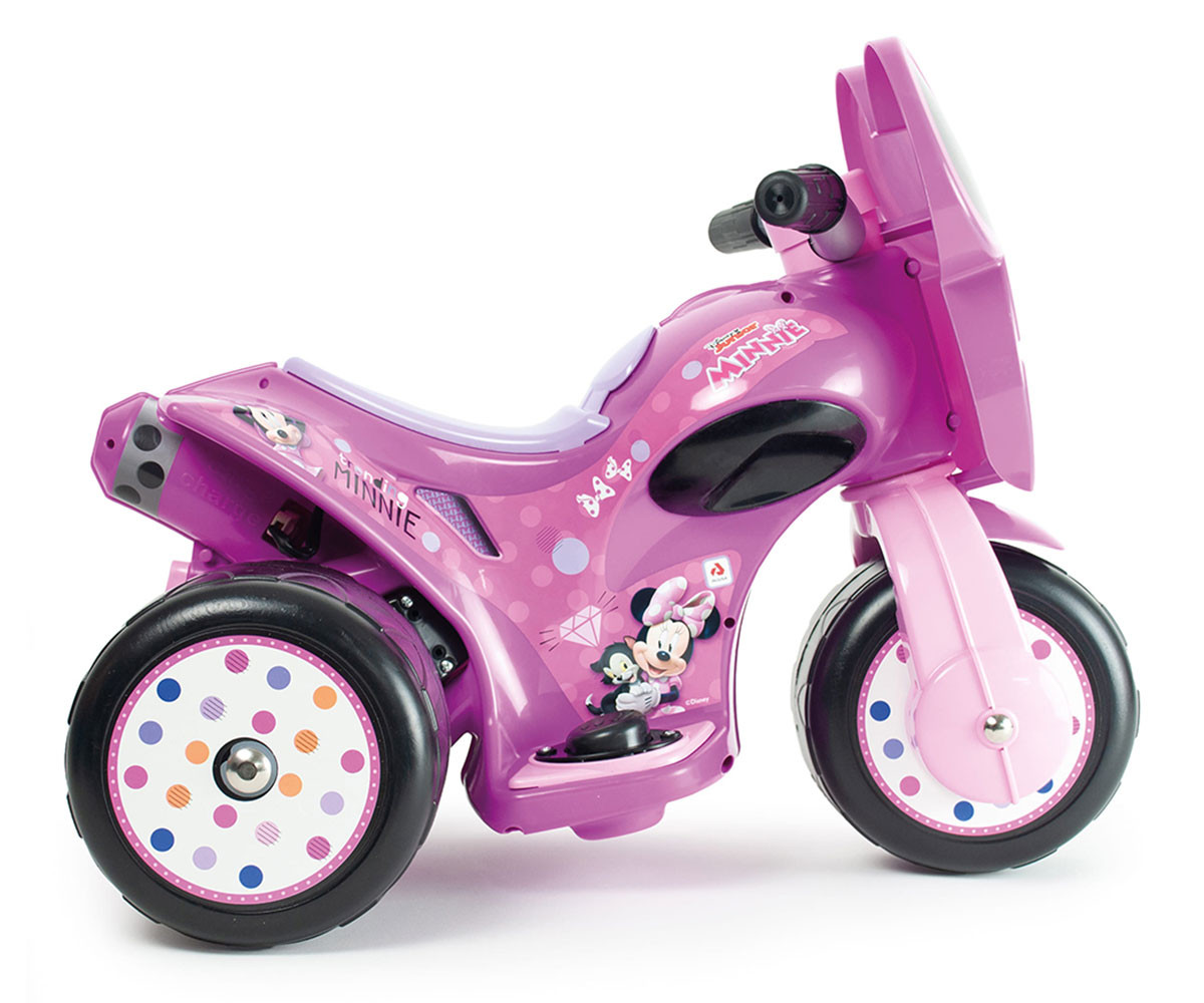 Този 3-колесен електрически мотор Minnie Mouse 6V в червено е създаден специално за деца между 1 и 3 години, за да започнат да се наслаждават на шофирането от най-ранна възраст. С официален лиценз на Disney, неговият ергономичен дизайн благоприятства пространственото и двигателно развитие на най-малките членове на семейството. Ако търсите забавление за вашите деца и безопасност в същото време, този 6V мотор от Injusa е перфектен за тях. В червен цвят и с декорация, вдъхновена от Мини Маус, той е за деца от 12 месеца. Неговата стабилност е подсигурена благодарение на ергономичния дизайн и трите широки пластмасови колела. Той достига 2-3 км/ч чрез педала за активация от дясната страна, а седалката е височина от 26 см от земята, а кормилото – 39 см. Включени са 6V акумулатор и зарядно устройство.