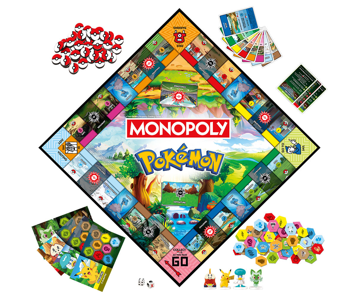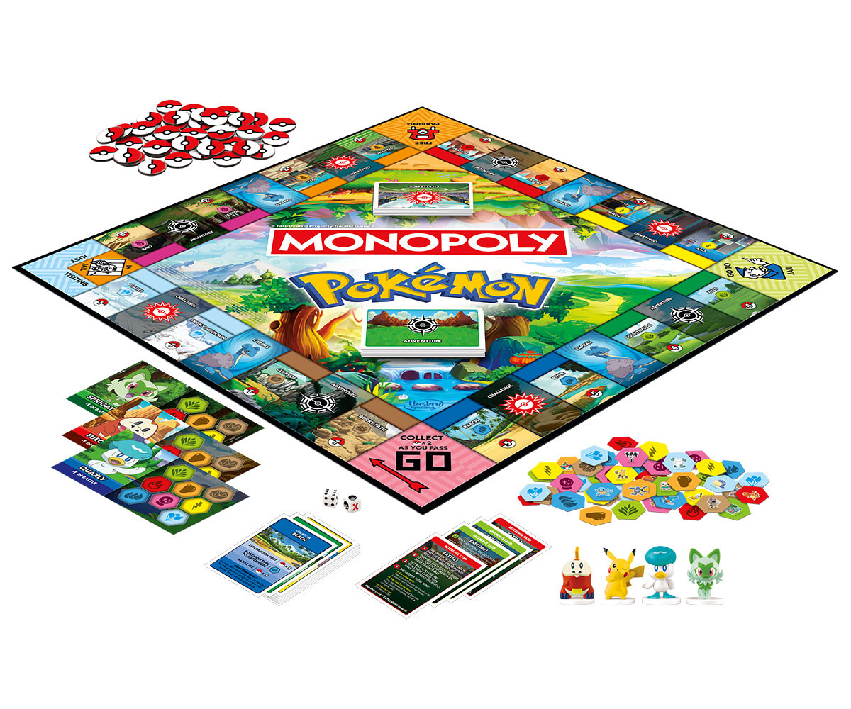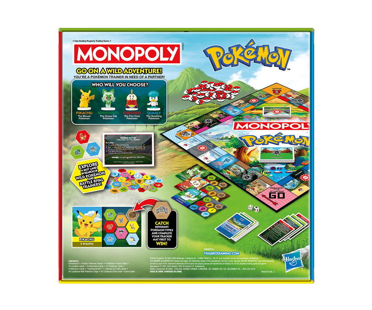 Стани най-бързият в надпреварата за диви покемони! Monopoly Pokémon Edition комбинира класическия геймплей на Монополи с вълнуващо ловене на покемони. Играй като покемон треньор, който пътува из обширна земя със своя покемон партньор. В тази забавна игра за деца, имотите са цветни локации, а парите са заменени с Поке Топки. Играчите изследват различни места, улавят различни видове диви покемони, които добавят към своя тракер мат, и се изправят в битки срещу съперници, за да събират още Поке Топки. Стани първият треньор, който попълни своя тракер мат, или остани последният с Поке Топки, за да спечелиш! Тази покемон версия на Монополи е страхотна настолна игра за семейни вечери с игри и чудесен подарък за момчета, момичета и деца над 8 години, които обичат покемони и Монополи.