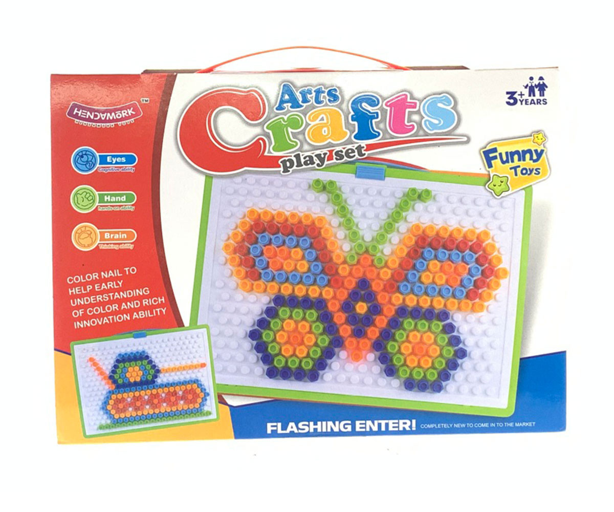 Занимателна и образователна играчка, която развива креативността, въображението и фината моторика на децата. Комплектът позволява създаването на различни картинки и фигури чрез подреждане на цветни пегове/копчета върху основната дъска.