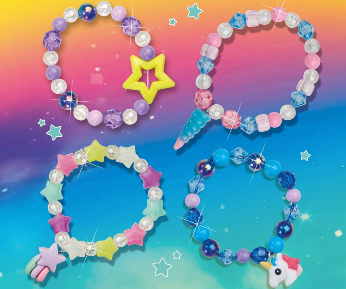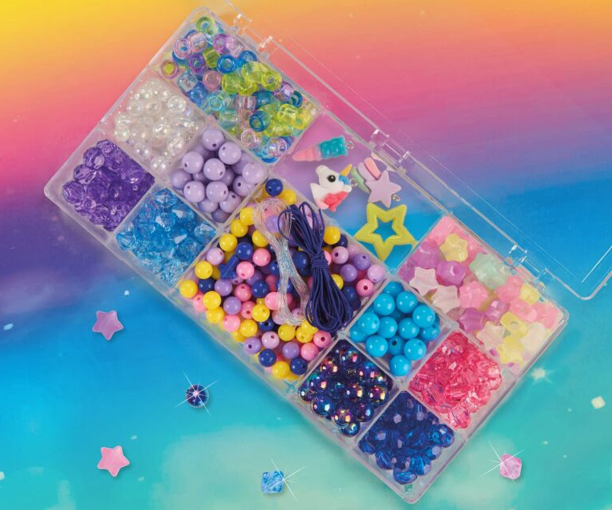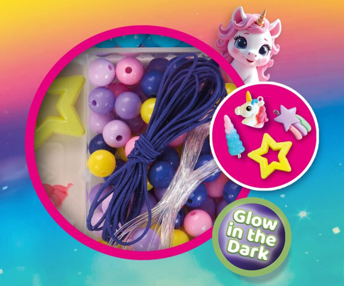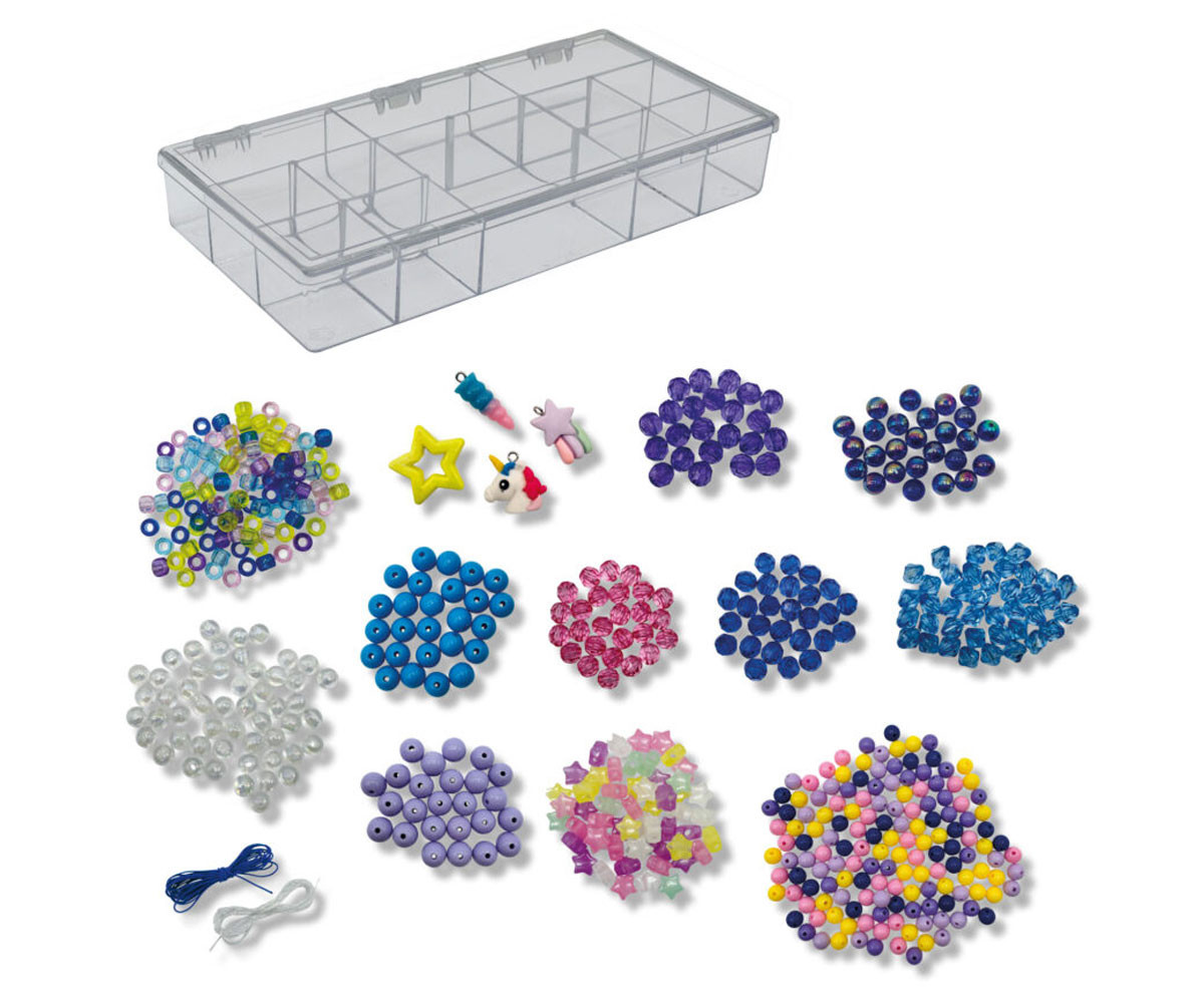 Прозрачната кутия за съхранение с 12 отделения е пълна с впечатляващи мъниста на тема Галактика, включително светещи в тъмното звездовидни мъниста, перлени мъниста и 4 галактически висулки с еднорози, които ще направят творенията ти наистина вълшебни! Идеален комплект за деца, които обичат да творят и да изработват бижута.