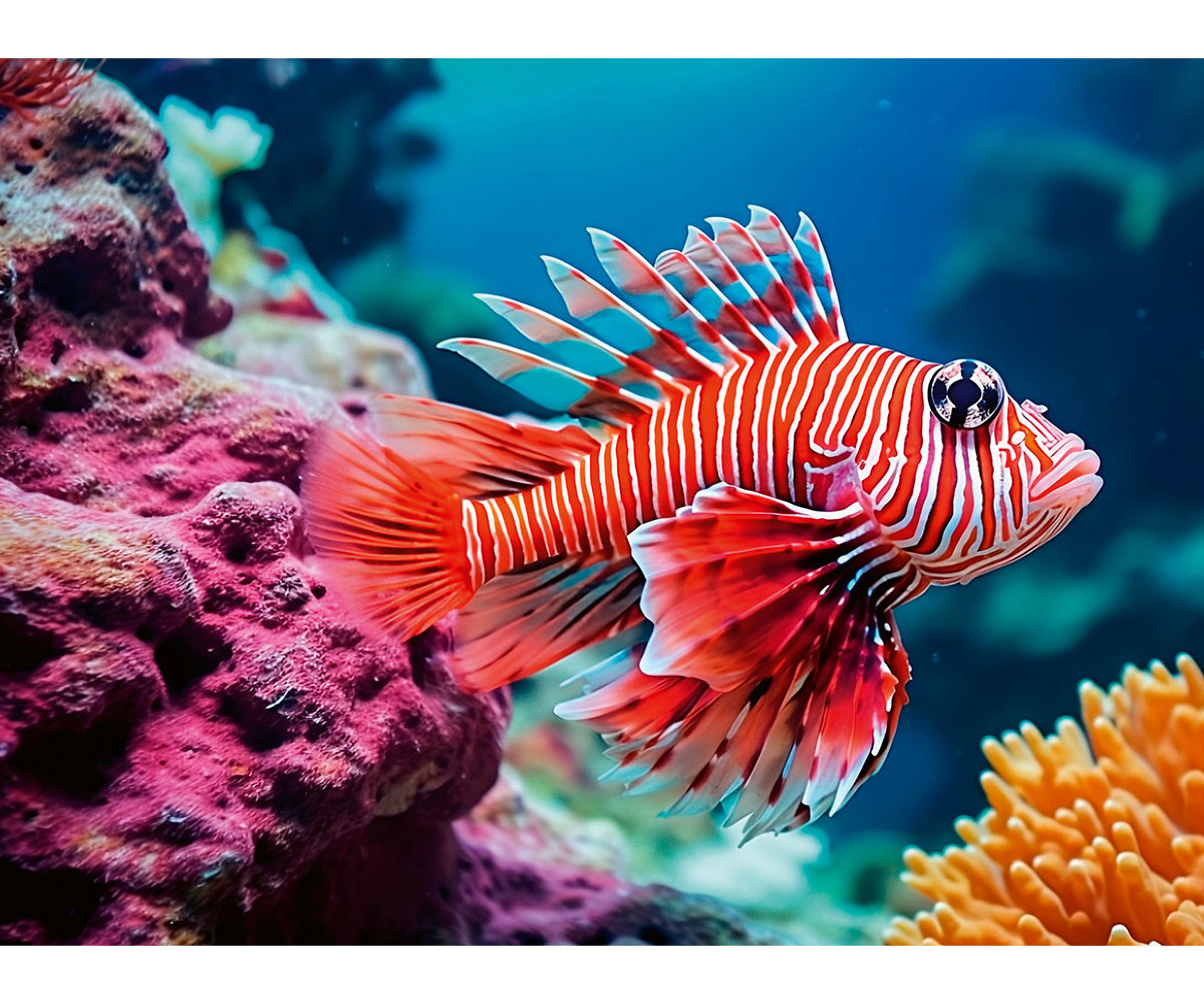 Изследвайте подводния свят с този очарователен пъзел от 500 части, представящ впечатляваща червена лъвска риба. Този пъзел показва завладяващата красота на лъвската риба, известна със своите ярки червени и бели ивици и впечатляващите, плавно движещи се перки. Сложните детайли на лъвската риба оживяват в тази невероятна морска сцена.