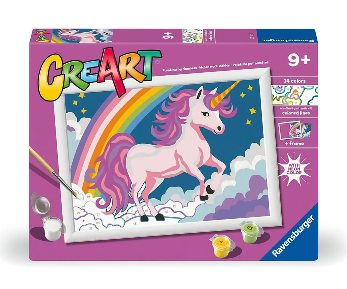 Създайте изкуството с CreArt Розов еднорог! Рисуване по номера от Ravensburger – всеки може да рисува! Благодарение на лесната техника на рисуване по номера, събуждането на художника е изключително лесно! Ясните боядисани участъци с цветни контури ще ви помогнат да създадете малко и красиво произведение на изкуството! Тънките нюанси на цветовете осигуряват елегантен преход и игра на сенки. Разопаковайте и се залавяйте за работа! Всеки може да рисува! Комплектът съдържа висококачествени материали: акрилни бои на водна основа в затварящи се бурканчета, палитра и четка.