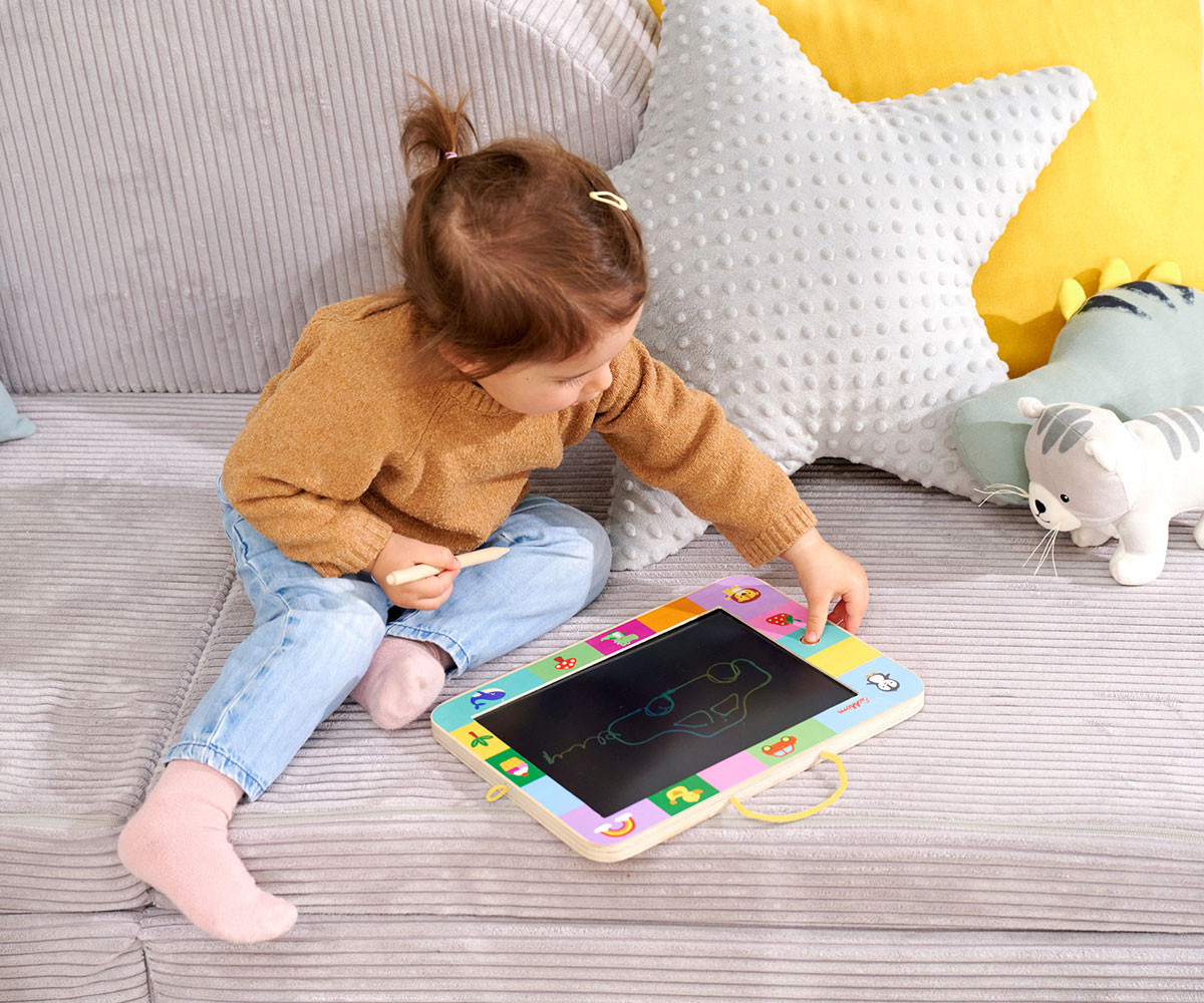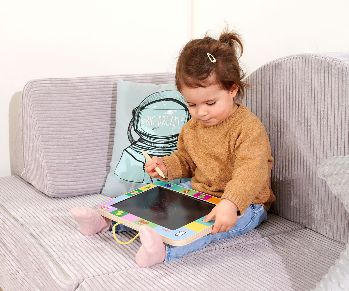 С красиво изработената дъска за рисуване на Eichhorn, специално създадена за малки творци над 3 години, децата могат да развихрят въображението си. Удобната за работа площ за рисуване с размер 22.5 x 16 см предлага достатъчно място за големи идеи и малки шедьоври. Ярките цветове и различните символи по дъската стимулират детската фантазия. Вграденият дървен молив винаги е под ръка, а благодарение на практичната дръжка за носене дъската е идеален спътник – както у дома, така и в движение. С натискане на дървения бутон цветната рисунка изчезва по магичен начин и може да се започне отново. Гарантирани са часове забавление и креативно учене! Дъската се предлага с включени две батерии 1.5V/LR03.