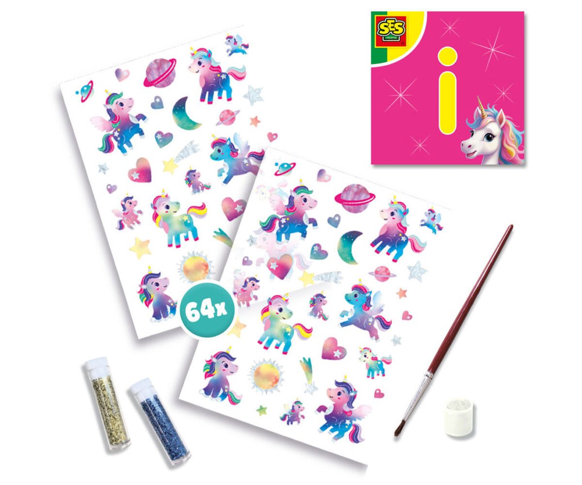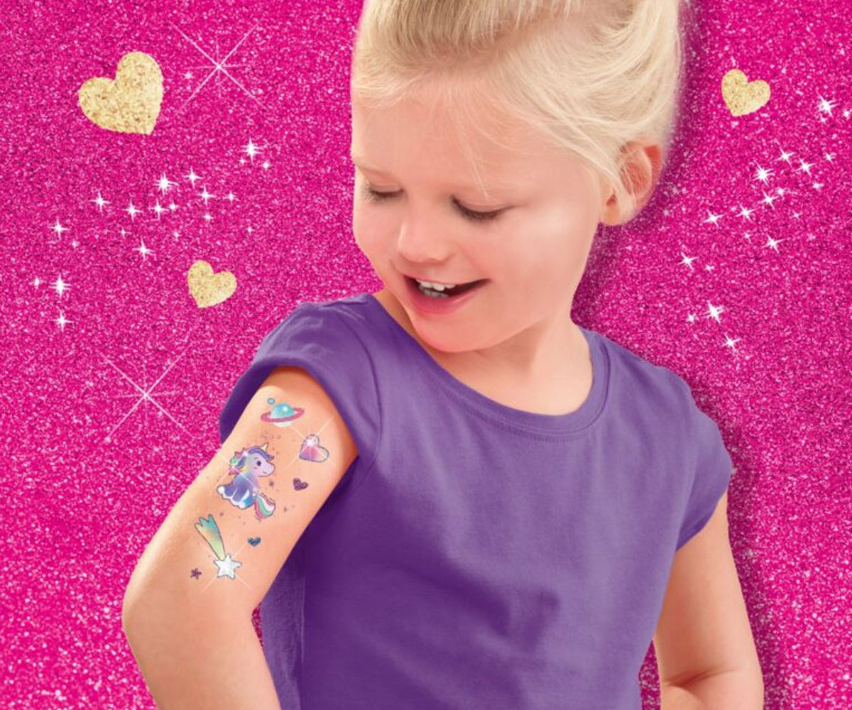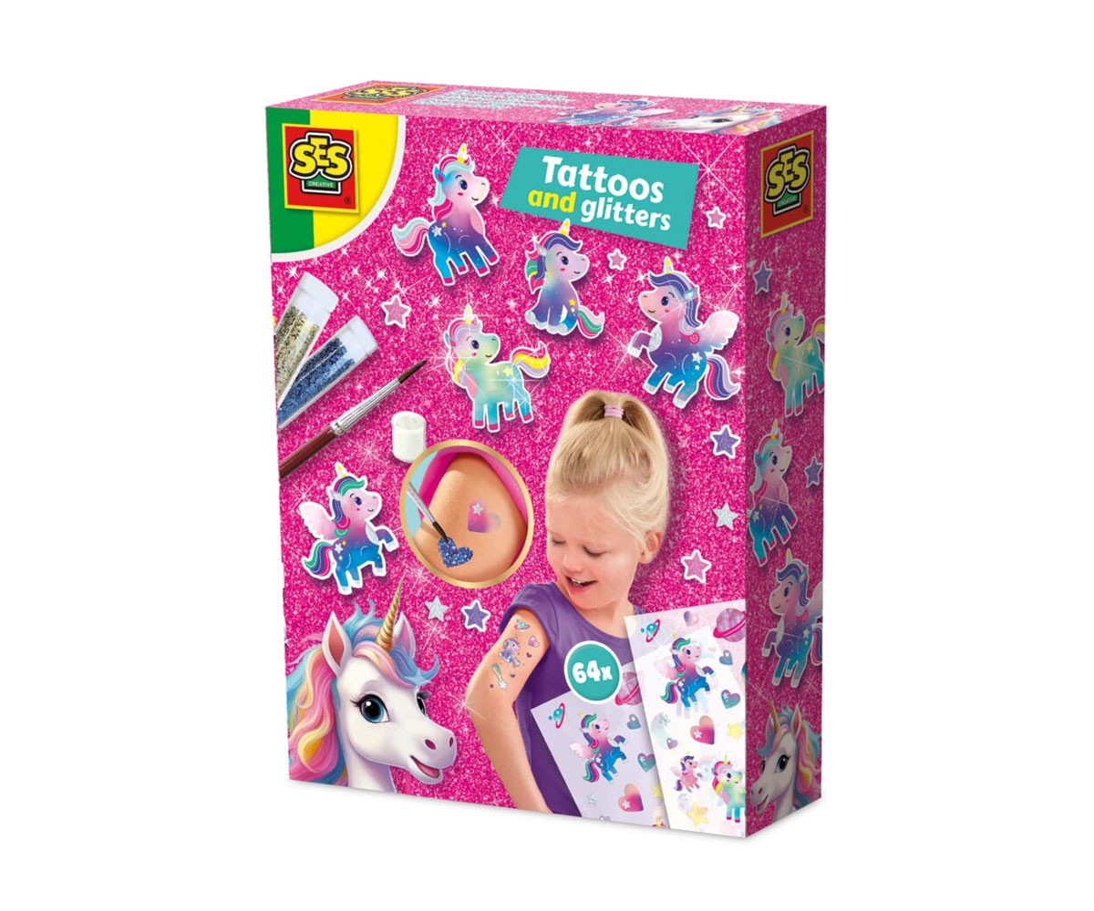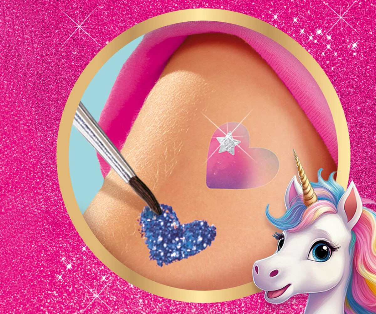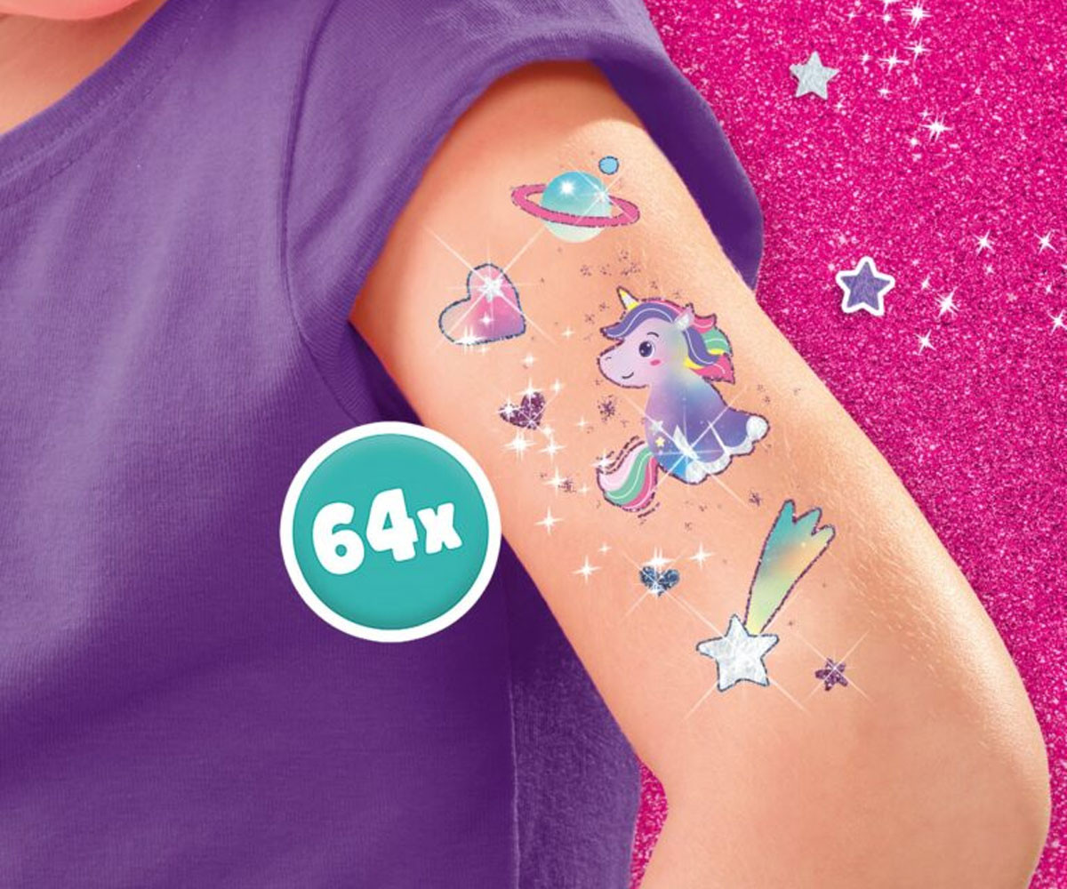 Добавете щипка магия с комплекта „Еднорози – татуировки и брокат“! Металическият ефект на самозалепващите се татуировки придава искрящо и вълшебно излъчване. Те се поставят и премахват лесно, преминали са козметични тестове и са напълно безопасни за детската кожа. Освен татуировките, комплектът включва два цвята козметичен брокат и лепило с брокат за още повече блясък и персонализация. Идеален подарък за всички почитатели на еднорозите и за партита на тема еднорози!