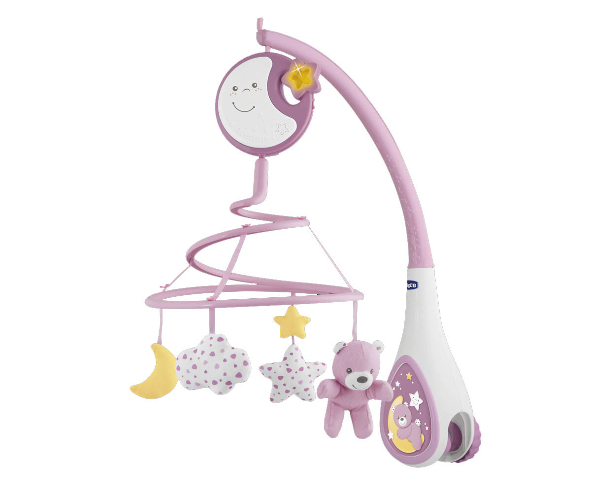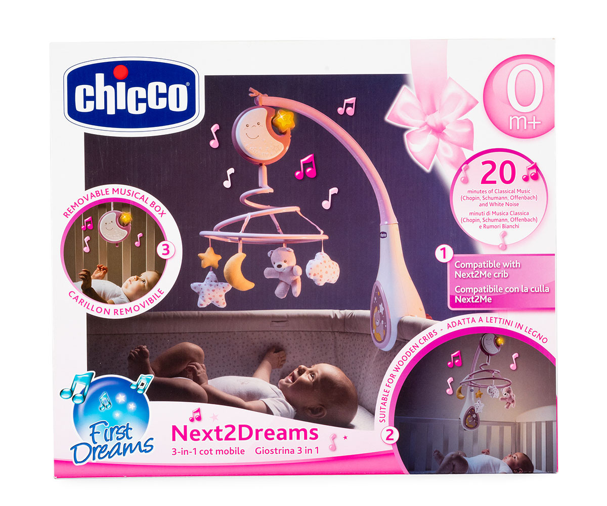 Въртележка Next2Dreams е проектирана от Chicco като идеален партньор за люлката Chicco Next2Me, но може да се монтира бързо и безопасно на повечето дървени и пътнически легла. Въртележката има 20 минути класическа музика (Шопен, Шуман, Офенбах) и успокояващи бели звуци (удари на сърцето и успокояващи звуци, възприемани в корема на майката). Next2Dreams Mobile е оборудван с мека нощна светлина, за да създаде мечтана атмосфера в стаята на мъничето. Електронният панел с музика и светлина може да се сваля и може лесно да се използва, като се прикрепи към кошарата или дори към количката. Детето играе със звуци и ноти, като развива сетивността си за ритъм и музика. Децата се научават да виждат движещи се предмети и да различават форми и цветове. Те се захласват по ярките светлини и цветове. Подходяща от 0м+.