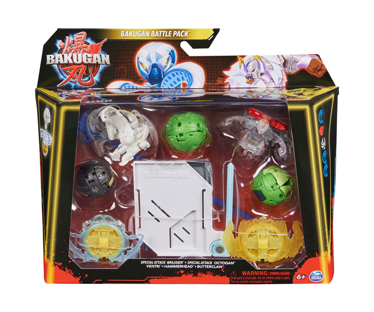 Изградете армия от Bakugan с изцяло новия Battle 5-Pack. Комбинирайте и се бийте с любимите си герои, които обичате от шоуто, за да бъдете най-добрият от Bakugan Battle Brawlers. Този боен пакет включва 2 специални атакуващи (въртящи се) Bakugan и 3 Core Bakugan топки; и карти за търговия. Използвайте включената рип карта или рипкорд, за да активирате въртящия се Бакуган. Комбинирайте своя Bakugan със системата за свързване на топка от много части. Просто щракнете горната част на героя, долната част и/или пръстена с оръжие за специална атака и се пригответе за битка. Колкото повече събирате, толкова повече можете да персонализирате. Използвайте картите за герои и специални атаки, за да събирате точки срещу враговете си. Разработете стратегия със Special Attack Bakugan.
