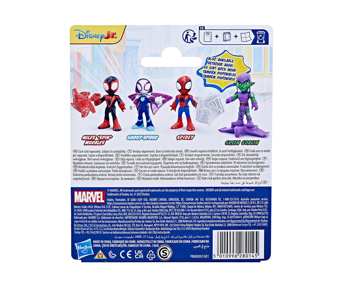 Присъедини се към отбора на Спайди! Изживей нови вълнуващи приключения с героите, вдъхновени от хитовата анимация "Spidey and His Amazing Friends"! Тези 7.6 см фигурки са с автентичен дизайн от сериала и включват аксесоар, който се прикрепя към краката на фигурката за още по-забавна игра.