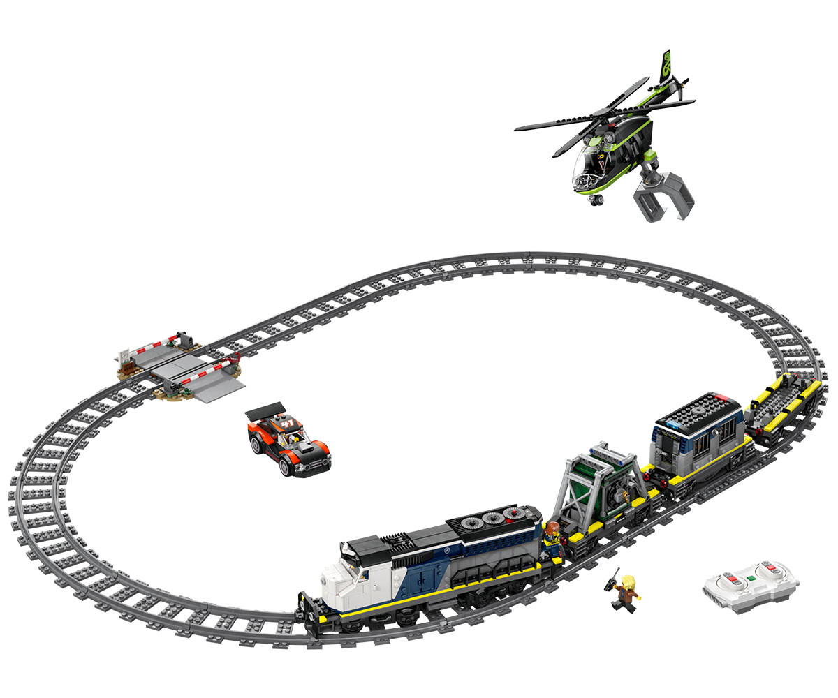 - КАКВО ИМА В КУТИЯТА - този комплект влакче-играчка включва всичко необходимо за построяване на локомотив с електрическо задвижване, 3 платформи, кола за рали, хеликоптер, затворническа килия, банков сейф, железопътен прелез и 6 минифигури;