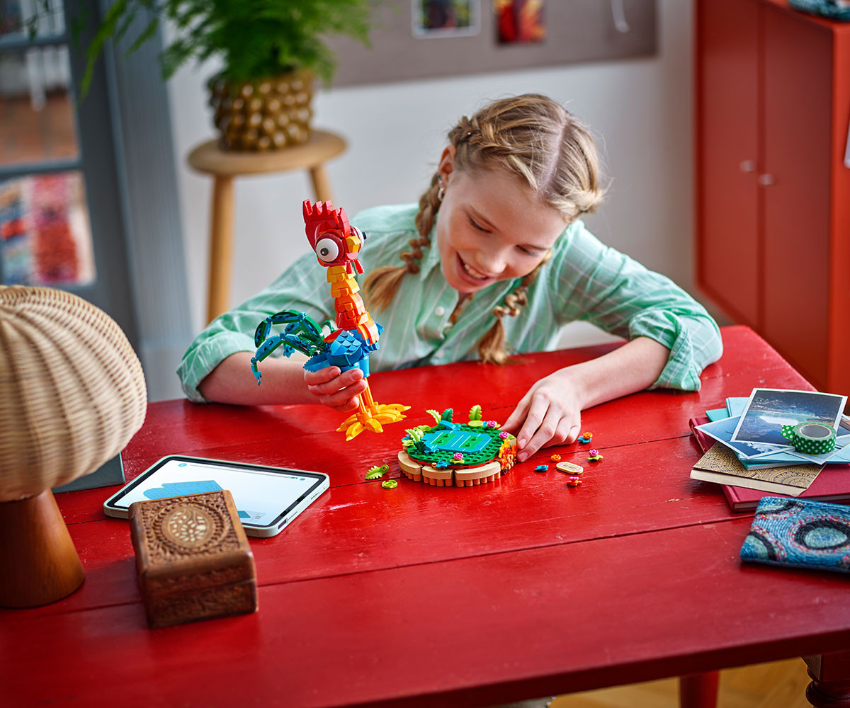 Внесете фантазията и забавлението от Смелата Ваяна и Смелата Ваяна 2 на Disney в реалния свят с този строителен комплект с подвижна играчка LEGO® ǀ Disney Moana 2 Хей Хей (43272). Феновете на животните, любителите на филмите и децата на възраст над 9 години ще се насладят на създаването на цветния модел за конструиране на петел с въртяща се глава, подвижни крила и пера на опашката, след което ще го изправят на крака или ще го поставят на стойката, допълнена с декоративни цветя и табелка с име. Този строителен комплект Disney за момичета, момчета и фенове е фантастична играчка за построяване, за която всички ще говорят, като същевременно предлага на по-големите деца и възрастните фенове на Disney по-сложно конструиране. Той е чудесен подарък, страхотен експонат и се съчетава с други строителни комплекти LEGO ǀ Disney (продават се отделно) от гамата. Освен това строителите се наслаждават на интуитивно конструиране с приложението LEGO Builder, където могат да мащабират и завъртат модели в 3D, да запазват комплекти и да проследяват напредъка.