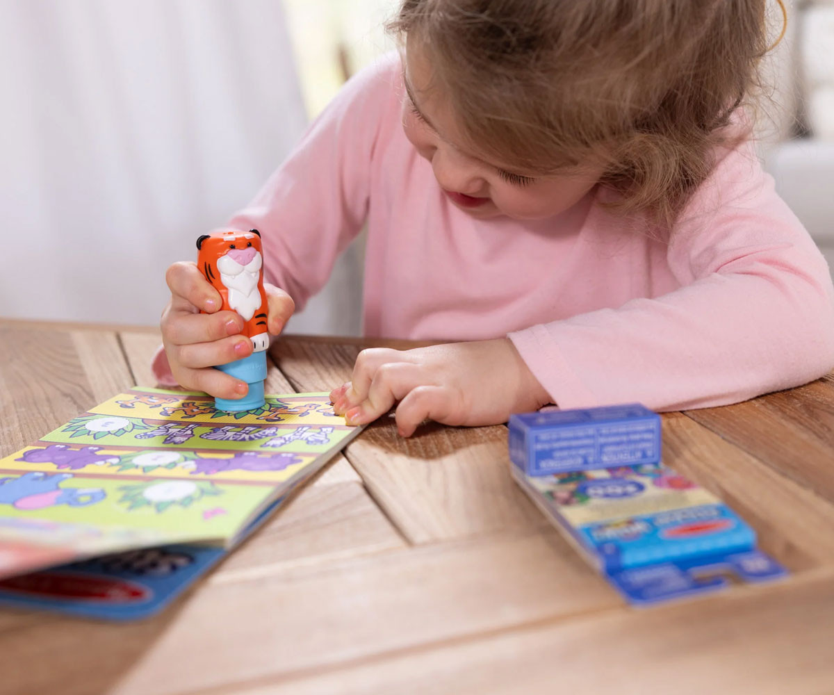 Забавните занимания включват числа, броене, съчетаване, търси и открий и още много! Стикерите не са за многократна употреба, но могат да се премахват лесно при нужда. Компактният формат с вградено място за съхранение на печата и лесното отстраняване на стикерите правят Sticker WOW!™ идеален за пътуване, занаяти, сензорна игра и като колекционерска играчка – всичко в едно. Перфектен подарък за момичета и момчета на възраст от 3 до 7 години, за забавна и занимателна игра с ръчички далеч от екраните. Melissa & Doug Sticker WOW!™ е нов, вълнуващ начин за игра със стикери! Позволи на очарователния герой Pumpkin the Tiger да „щампове“ през 24 страници, пълни с игри за броене, съчетаване и търсене. Печатът за стикери е презареждаем и идва предварително зареден с 300 различни стикера – с 100 уникални дизайна във всяка купчина, като всеки стикер е изненада. Стикерите не са за многократна употреба, но могат да се премахват лесно. Използвай ги, за да попълваш книжките или за креативни арт проекти – като разделители за книги, плакати, картички и други. Благодарение на лесното отстраняване на стикерите и практичния формат за пътуване с вградено място за съхранение, Sticker WOW!™ е чудесна безбъркотийна активност в движение. Sticker WOW!™ развива фината моторика, насърчава творческата игра и предлага удовлетворяващо, сензорно забавление!