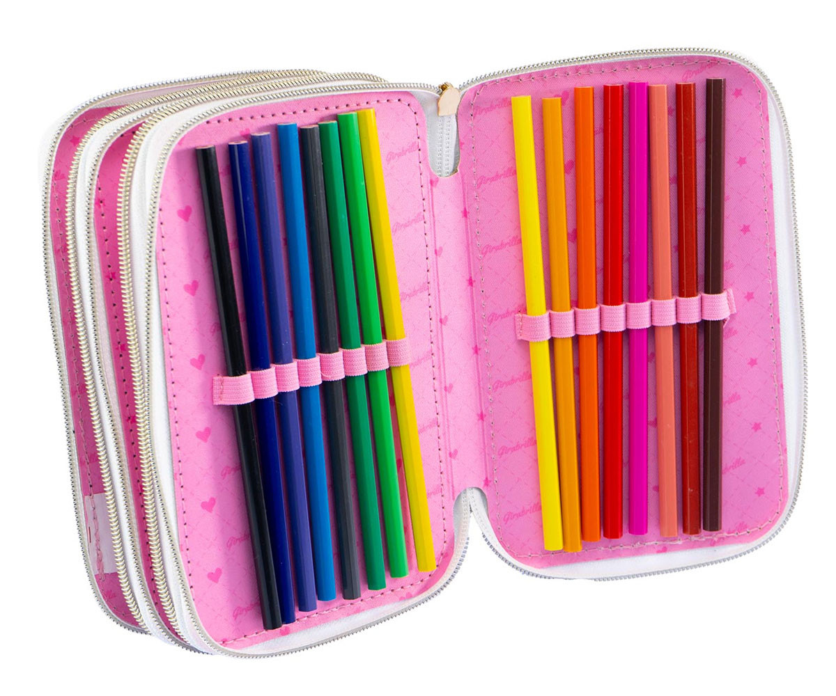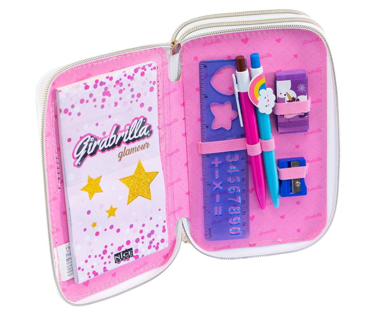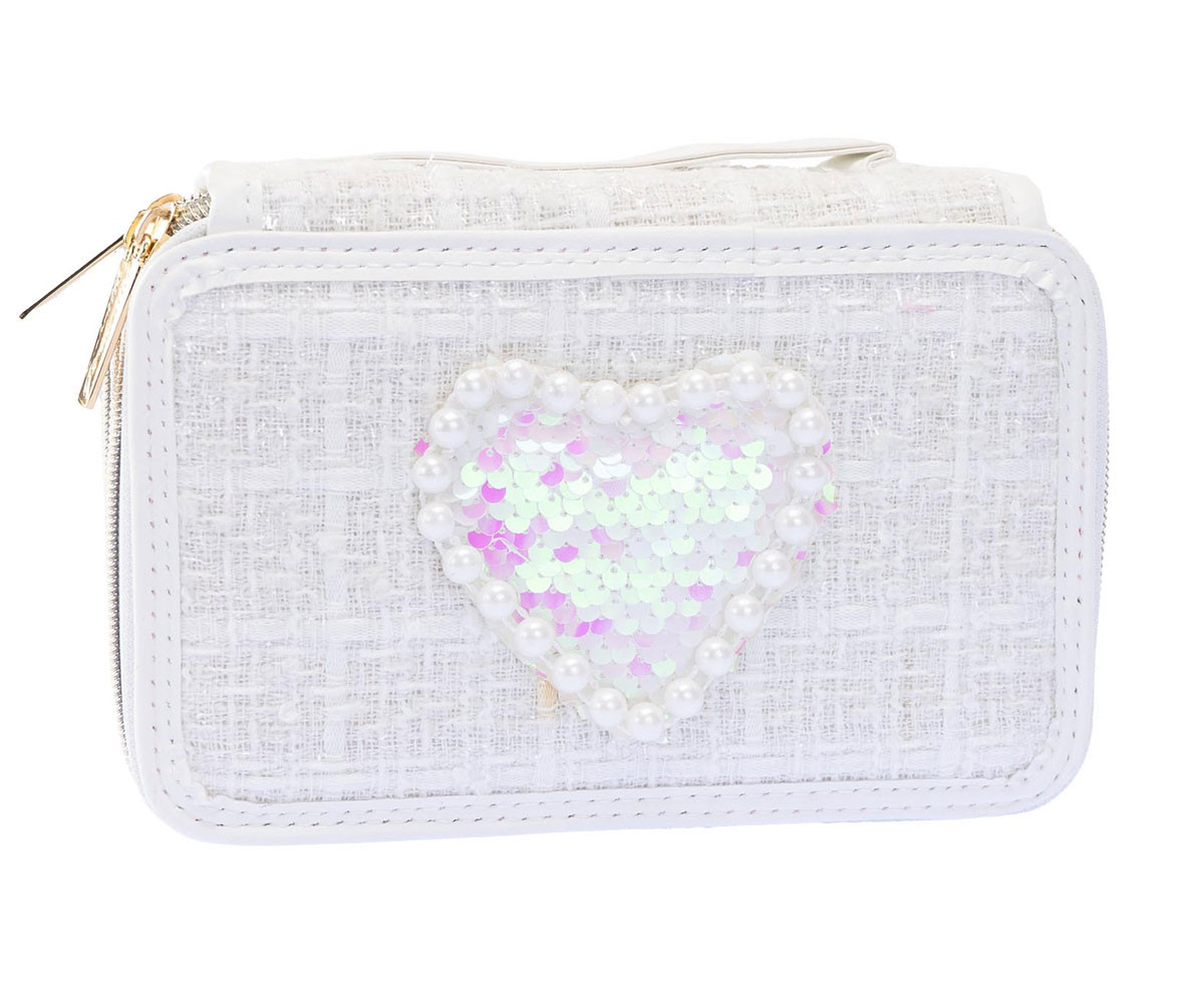 Очарователен несесер от туид с три отделения, затварящи се със златист цип. Декориран е с обърнати пайети и перли. Вътре ще откриете пълен комплект ученически принадлежности.