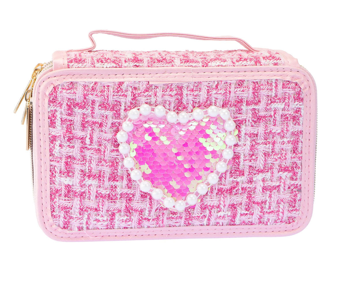 Очарователен несесер от туид с три отделения, затварящи се със златист цип. Декориран е с обърнати пайети и перли. Вътре ще откриете пълен комплект ученически принадлежности.