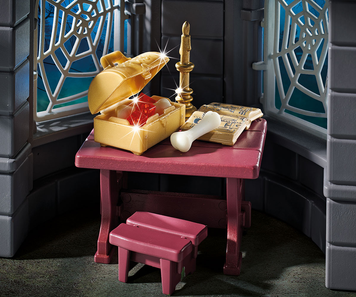 - Светещи в тъмното детайли – паяжини, череп и други части озаряват сцената за допълнителен ефект;