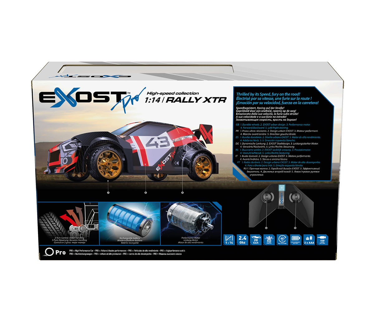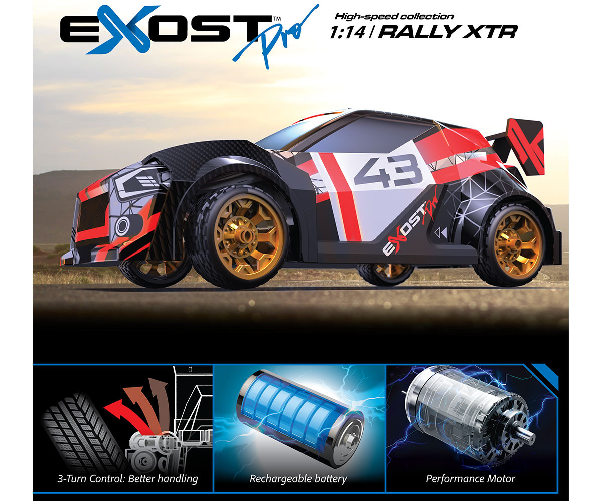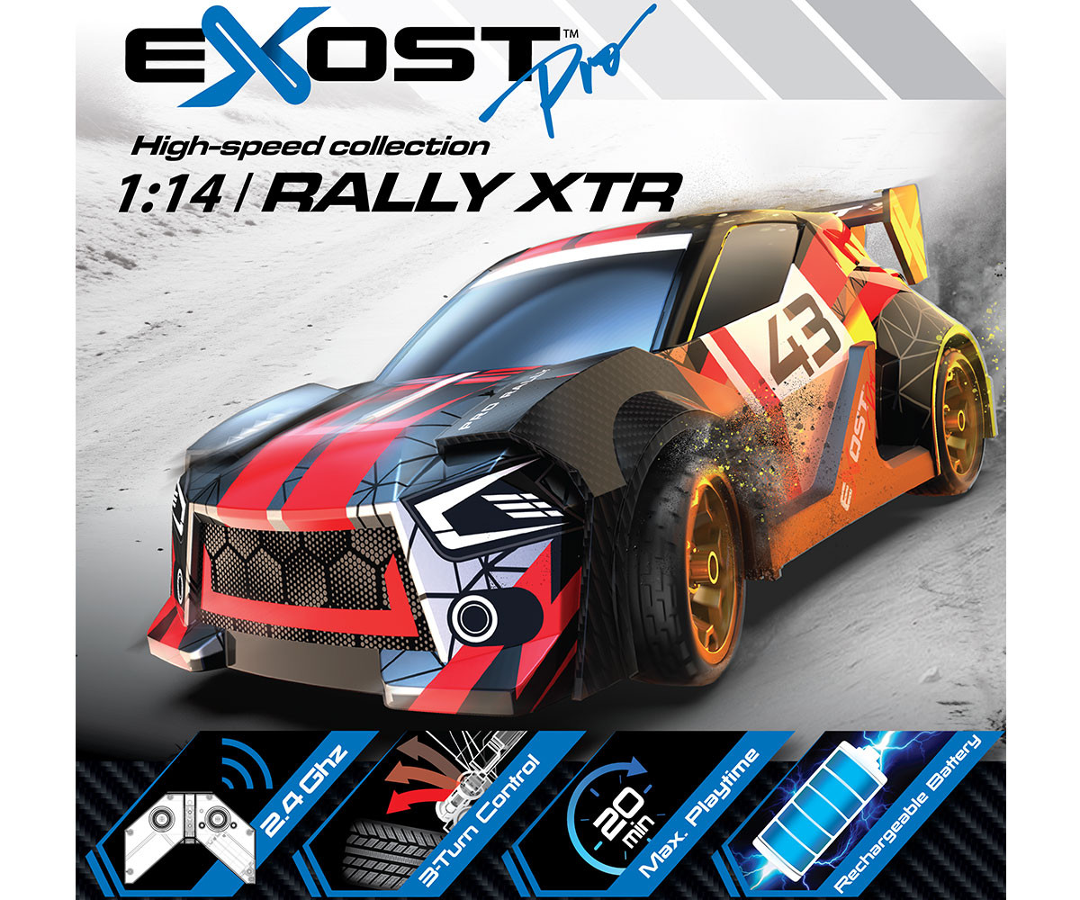 EXOST PRO RALLY XTR е високопроизводителен радиоуправляем автомобил в мащаб 1:14. Усети мощния мотор, който ускорява до 20 км/ч, с отлична стабилност! Завивай с лекота благодарение на 3-степенната система за управление и се наслади на забавлението с прецизен контрол. Честота 2.4GHz осигурява стабилно радио управление на разстояние до 25 метра. Презареждаемата батерия 3.7V 500 mAh се зарежда напълно за 60 минути и предлага до 20 минути непрекъсната игра. Карай със стил с уникалния EXOST рали дизайн на купето! Препоръчителна възраст: 8+ години.