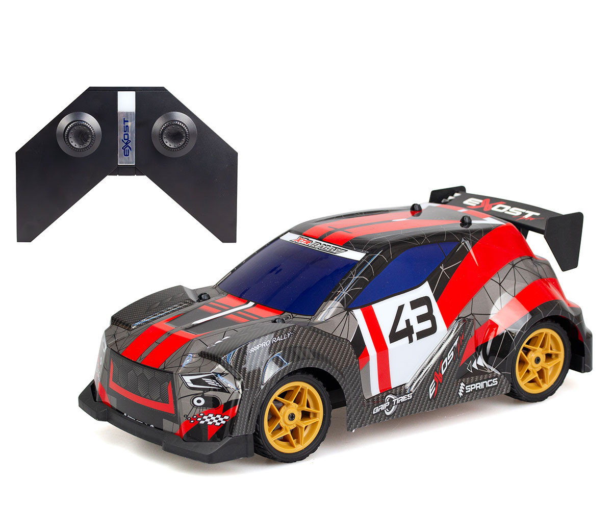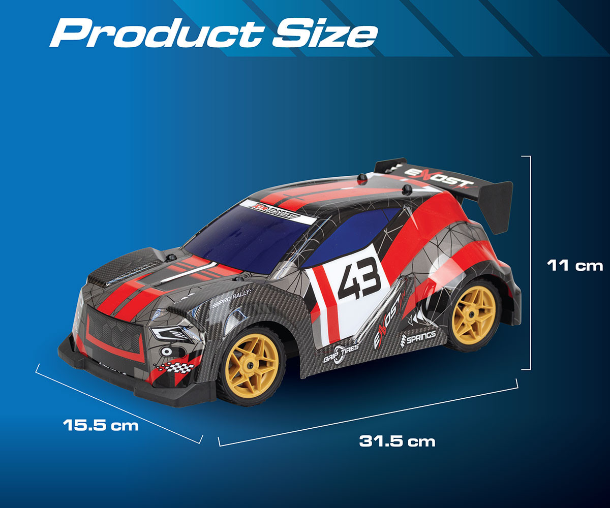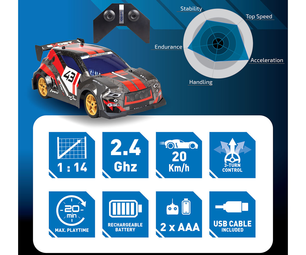 EXOST PRO RALLY XTR е високопроизводителен радиоуправляем автомобил в мащаб 1:14. Усети мощния мотор, който ускорява до 20 км/ч, с отлична стабилност! Завивай с лекота благодарение на 3-степенната система за управление и се наслади на забавлението с прецизен контрол. Честота 2.4GHz осигурява стабилно радио управление на разстояние до 25 метра. Презареждаемата батерия 3.7V 500 mAh се зарежда напълно за 60 минути и предлага до 20 минути непрекъсната игра. Карай със стил с уникалния EXOST рали дизайн на купето! Препоръчителна възраст: 8+ години.
