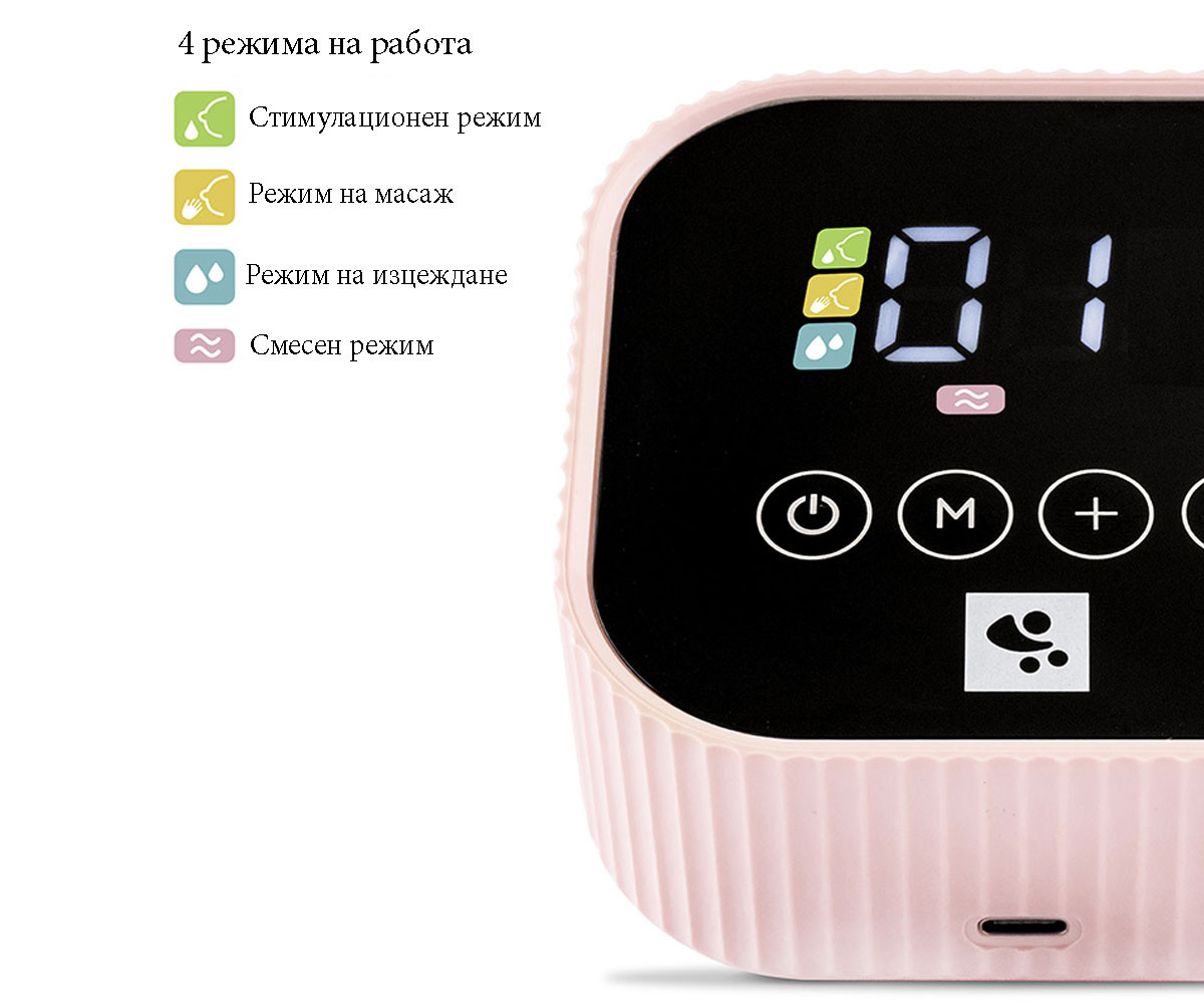 - 4 режима на работа - стимулационен режим, режим на масаж, режим на изцеждане, смесен режим;
