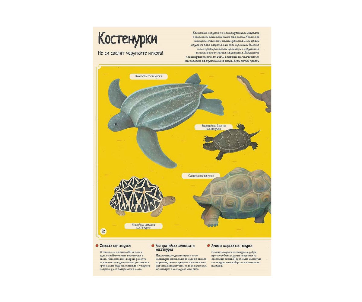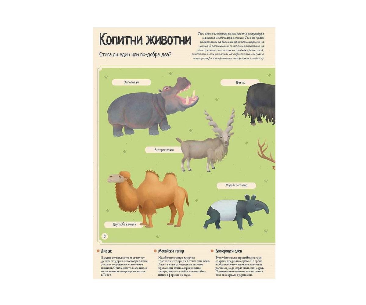 Тази богато илюстрирана книга ще запознае любопитните млади читатели с голяма част от животните на Земята. Те ще се срещнат и с малките насекоми, и с внушителните сухоземни бозайници и китове. Накратко е разказано най-интересното за всеки вид. Текстът е познавателен, но и забавен. Вместо сухи факти читателите ще научат и запомнят с какво дадено животно е необикновено и се отличава от себеподобните. Форматът позволява на страниците да се разположат големи илюстрации – едновременно реалистични и забавни. Така младият читател ще се слее със света на животните и ще ги обикне такива, каквито са.