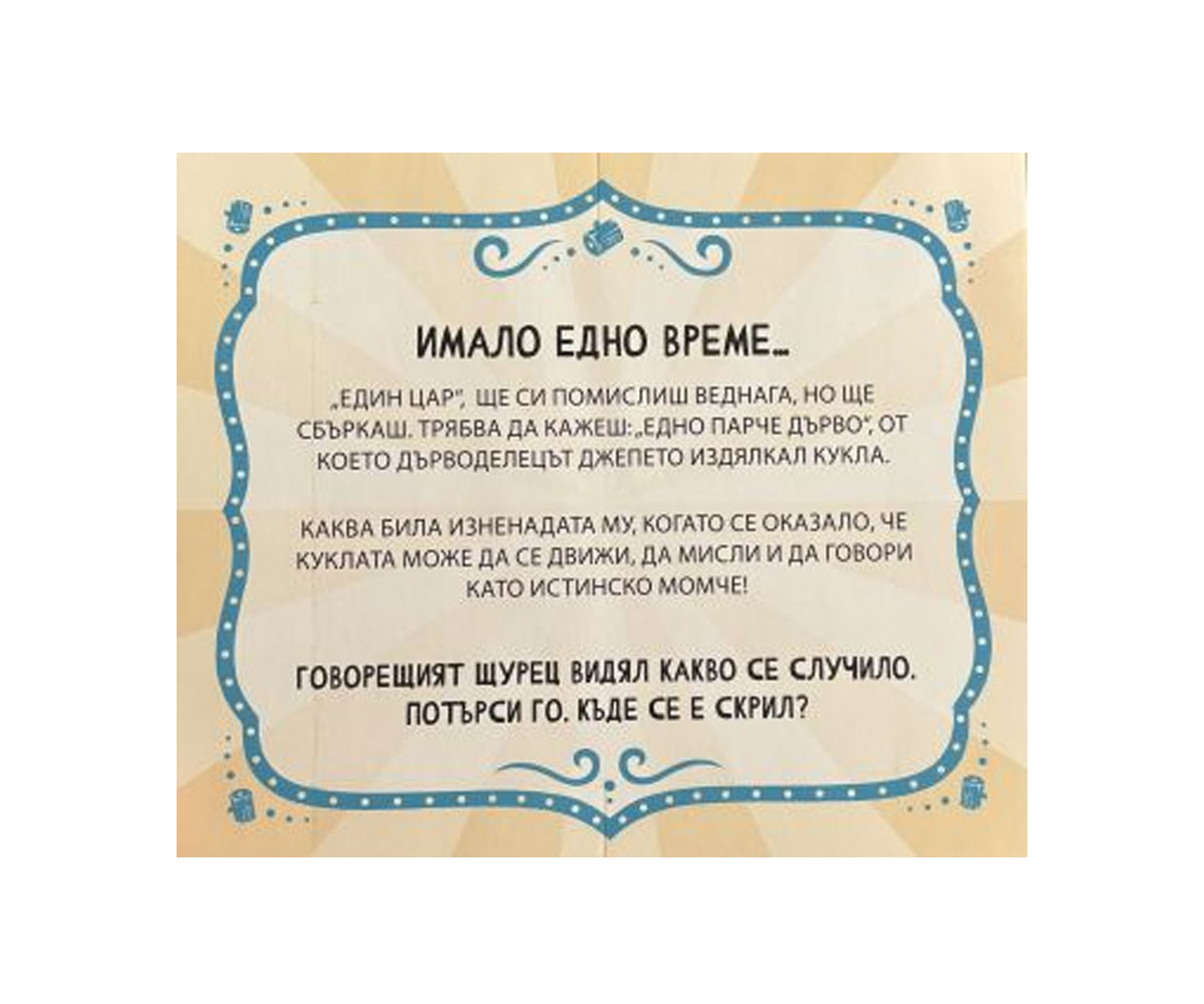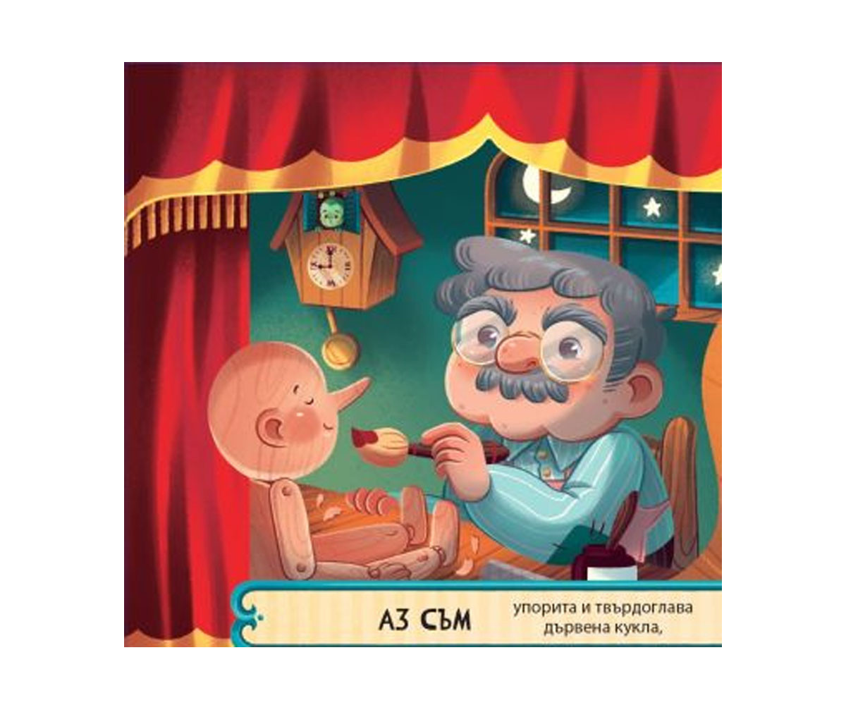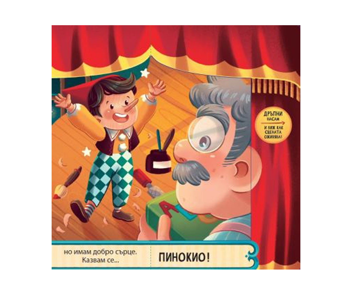Отвори книгата, прочети историята и дръпни вълшебната завеса. Фигурите ще се сменят и сцената ще оживее. Влез в приказката и се запознай с огнегълтача, Синята фея и говорещия щурец, котарака и лисицата. Не забравяй да се пазиш от акулата... какво представление!