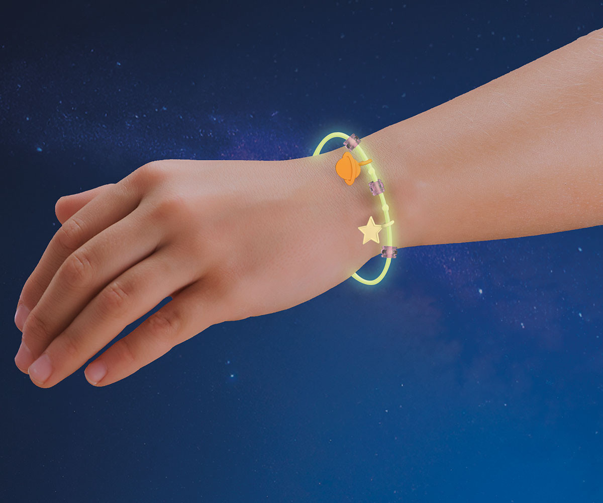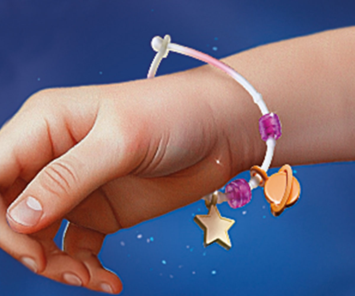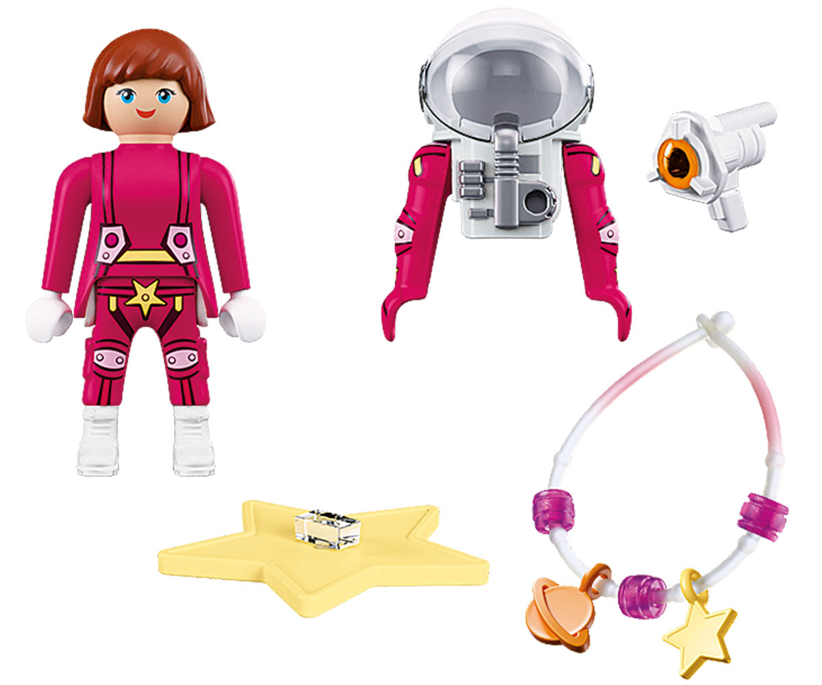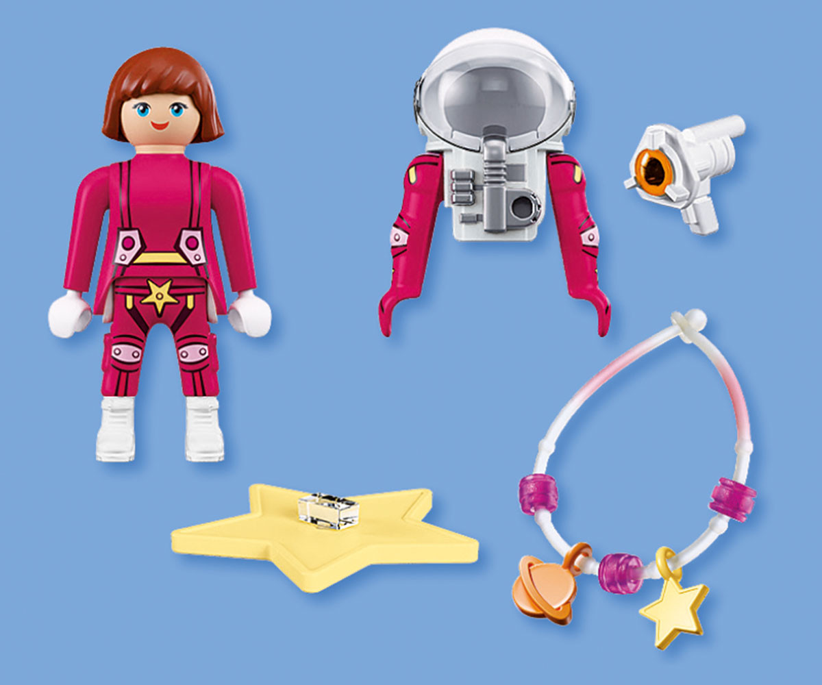 Смелата астронавтка се носи из безкрайните простори на космоса - винаги в преследване на блещукащите звезди! Оборудвана с космически костюм и магически звезден бластер, тя търси нови светове и скрити тайни. Светещата в тъмното гривна ѝ показва - и на вас - пътя сред звездите. Носейки се сред далечни галактики, безстрашната изследователка продължава търсенето на блестящи космически съкровища. Всяка мисия носи нови загадки - от сияен звезден прах до странни сигнали, отекващи в безкрая. Със своето блестящо оборудване и надежден бластер тя прокарва смели маршрути сред сияещите съзвездия. Децата могат да персонализират включената гривна с висулки и мъниста, за да носят частица от звездния прах със себе си. Този детайлен комплект PLAYMOBIL кани на творчески пътешествия далеч отвъд Земята и разширява всяко космическо приключение на PLAYMOBIL с ярък и въображаем герой.
