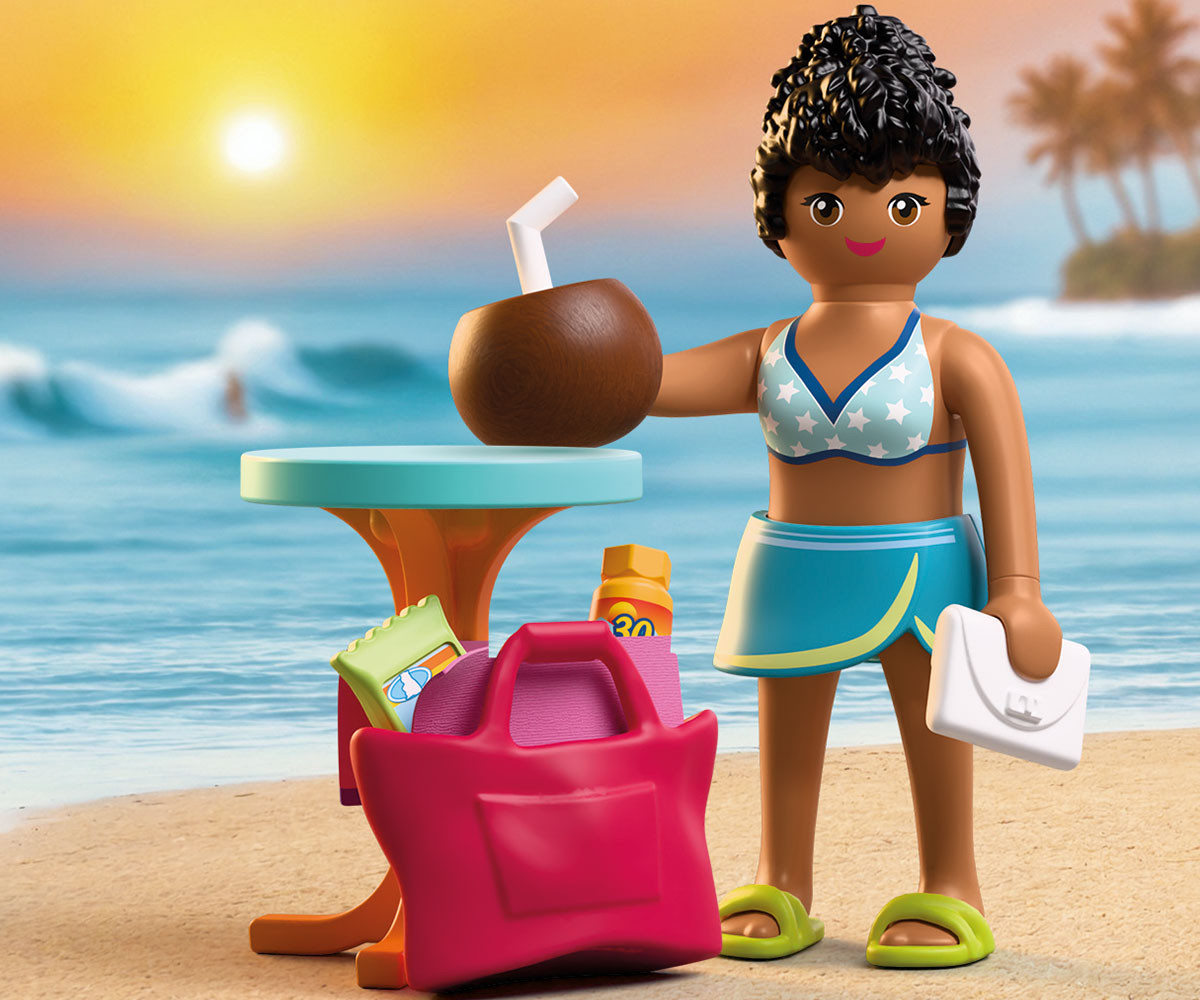 След дълъг ден, изпълнен със слънце и шума на морето, туристката се наслаждава на освежаващ плодов коктейл под топлите лъчи на вечерното слънце. Докато небето се обагря в меки вечерни цветове, отпочиналата туристка се наслаждава на последните моменти от своя перфектен ден на плажа. Със стилните си аксесоари подръка тя може да постели кърпата си, да извади своите лакомства и да се отпусне на високата маса с прохладна напитка. Всичко необходимо се побира удобно в плажната ѝ чанта - готово за следващото слънчево приключение. Внесете истинско ваканционно настроение в детската стая с този очарователен комплект PLAYMOBIL Летовник! Всеки детайлен аксесоар насърчава въображаемата игра и създаването на забавни истории.